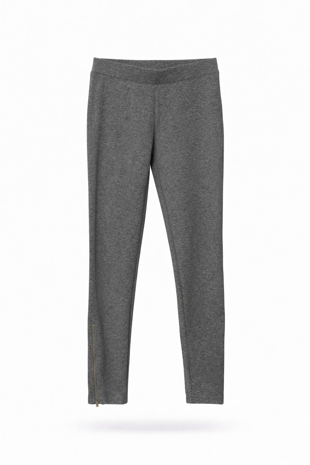 Grey pocketless leggings with zippers on the side of each ankle