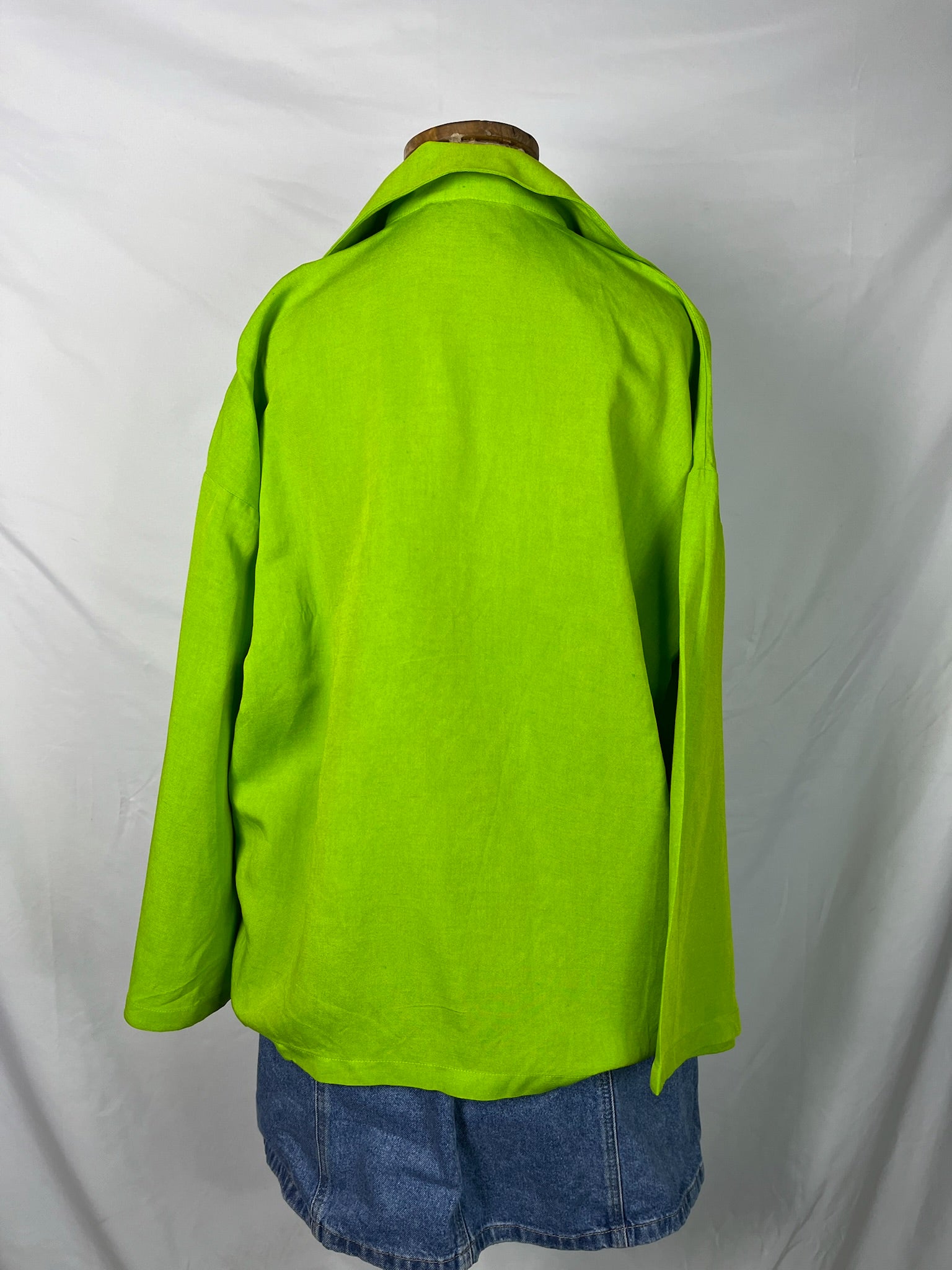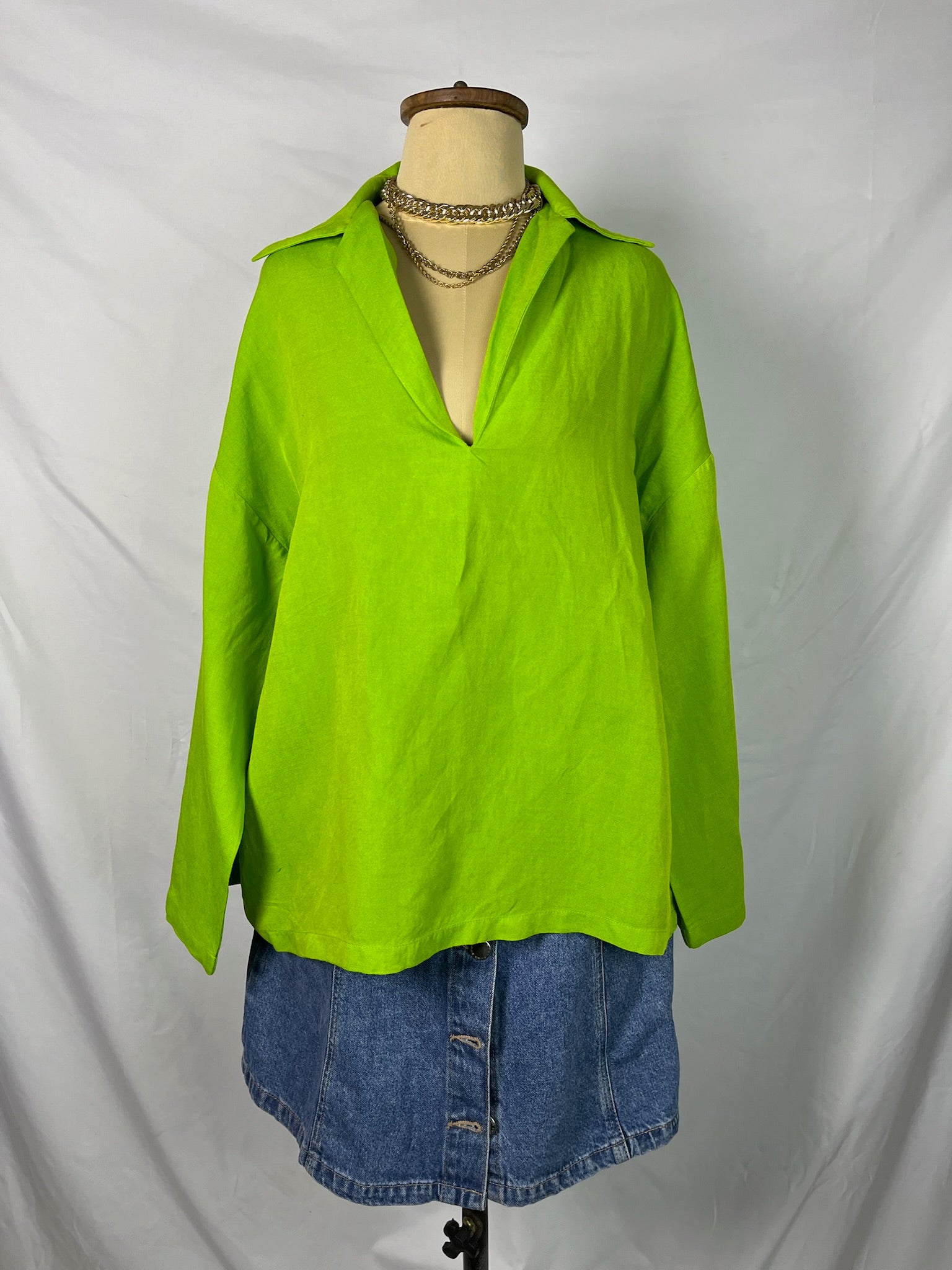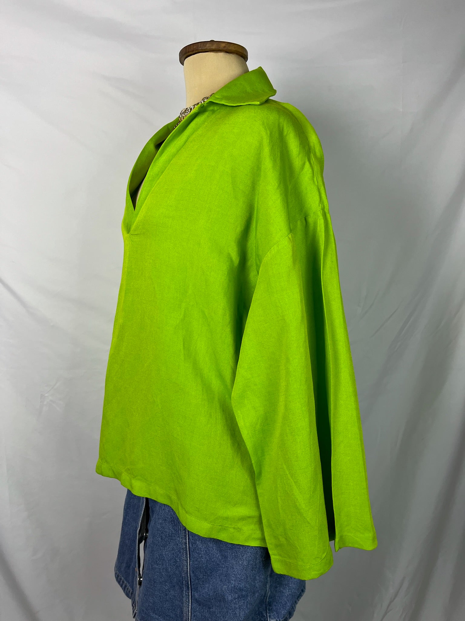 Lime green thick linen fabric V-neckline long sleeves relaxed loose fit collared blouse.