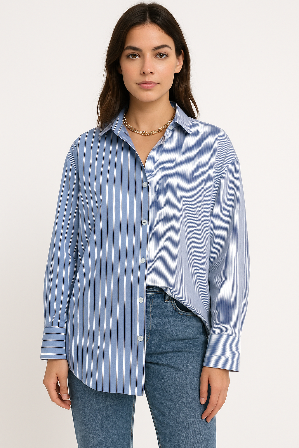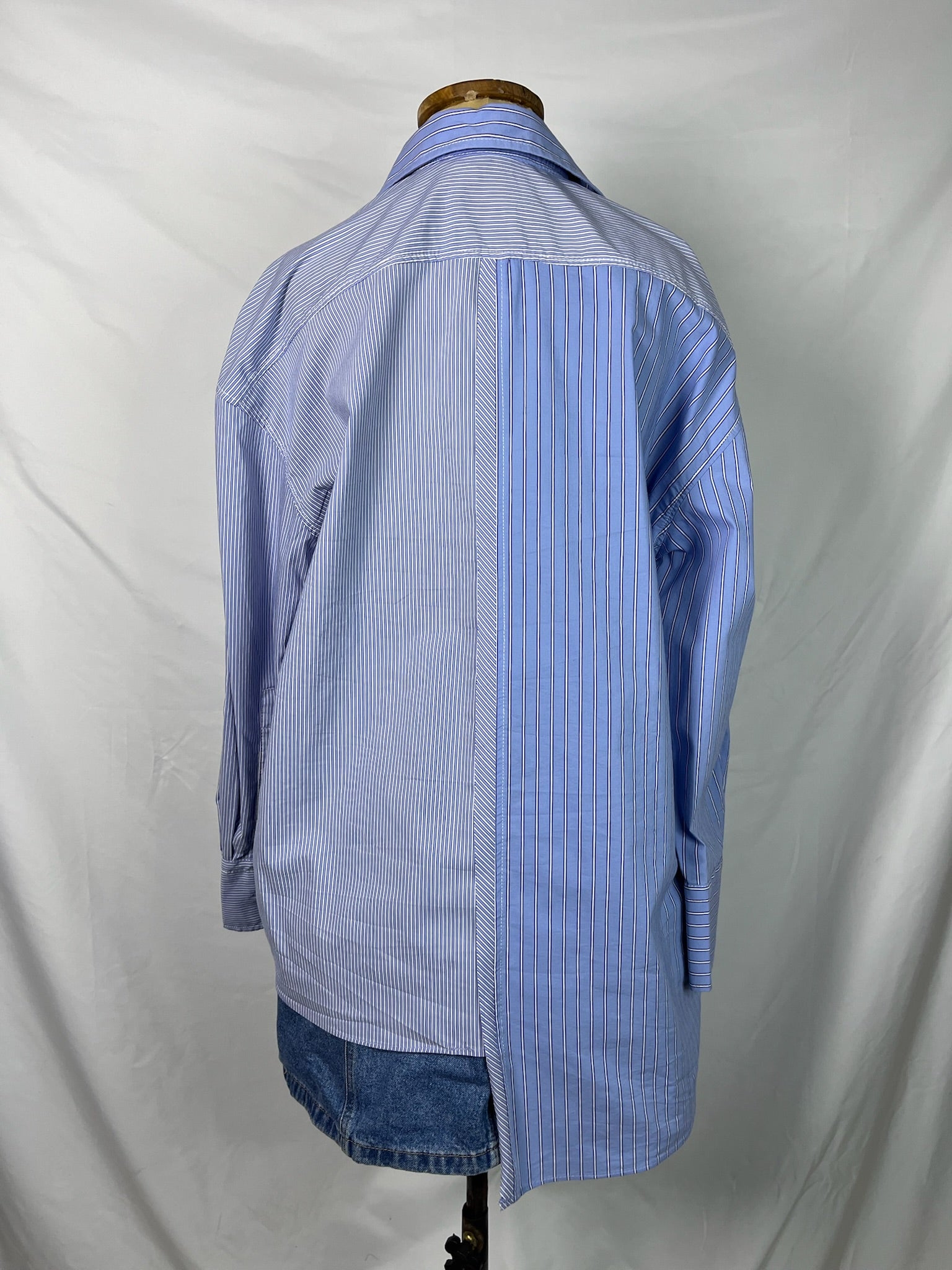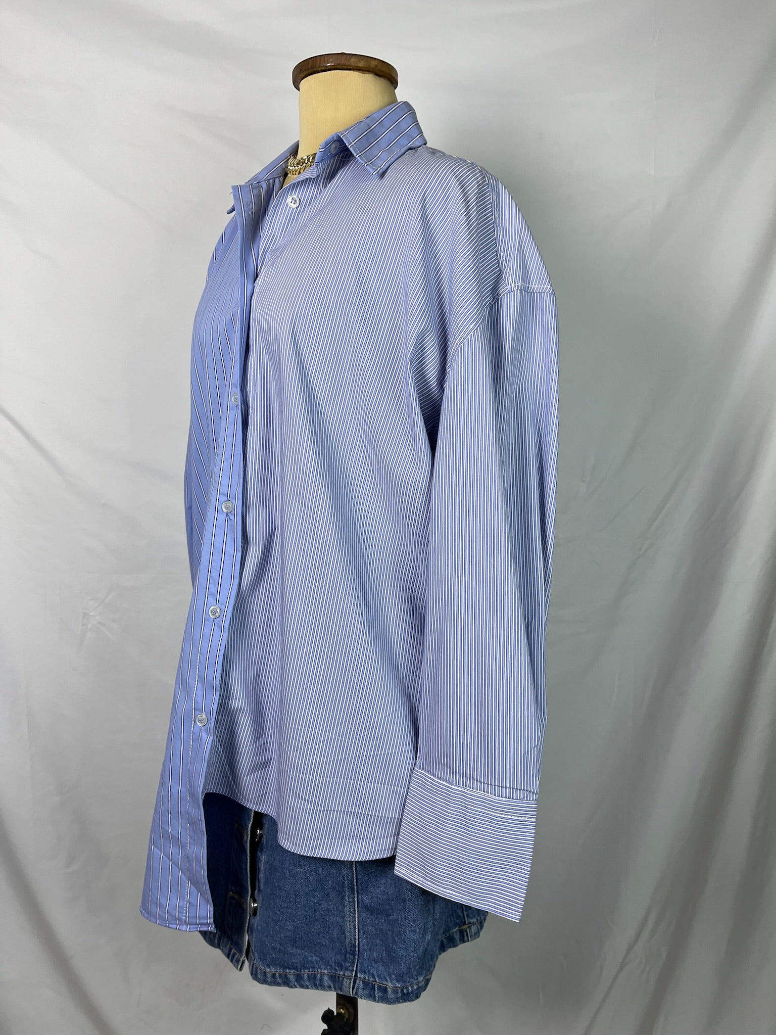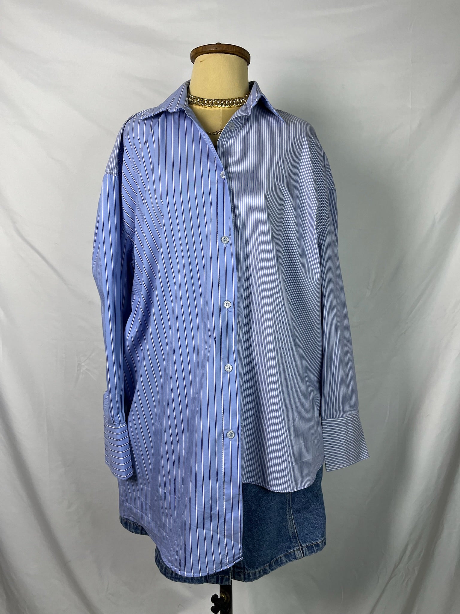 Shades of blue dual striped pattern long cuffed sleeves, oversized fit, two length collared buttoned down shirt.