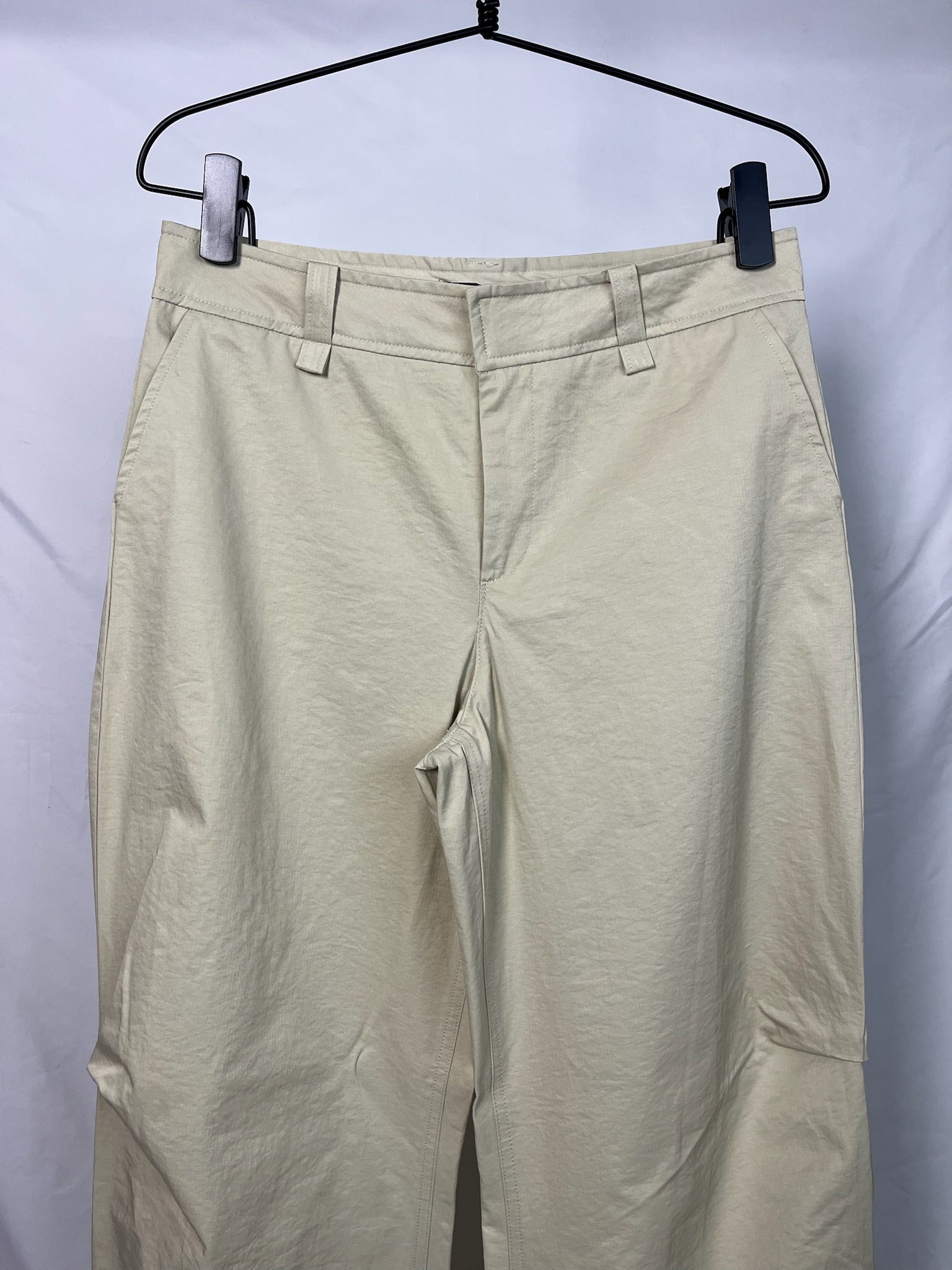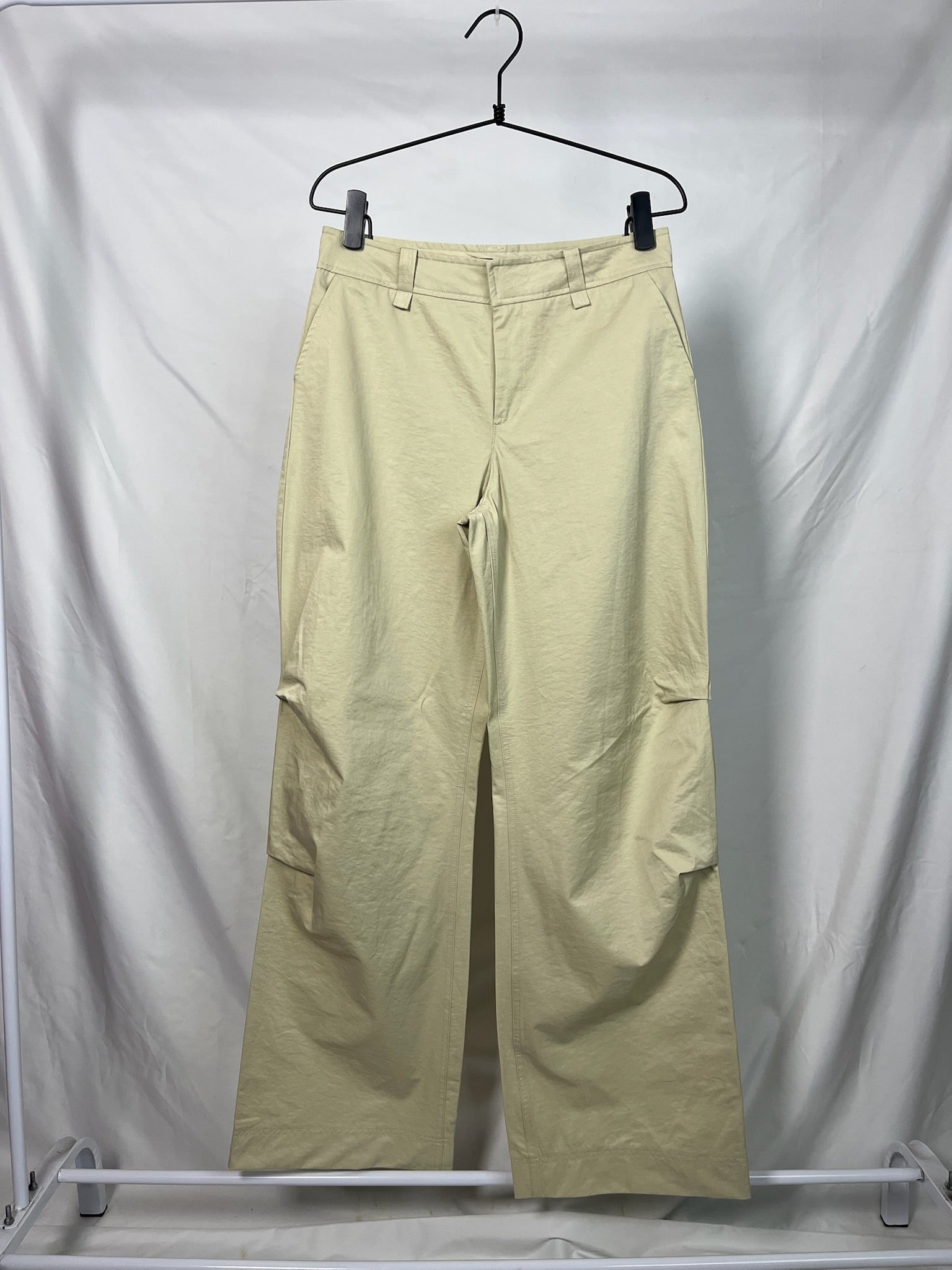 Light cream full length giving parachute/cargo fabric with side pockets and side pleats utility pants.