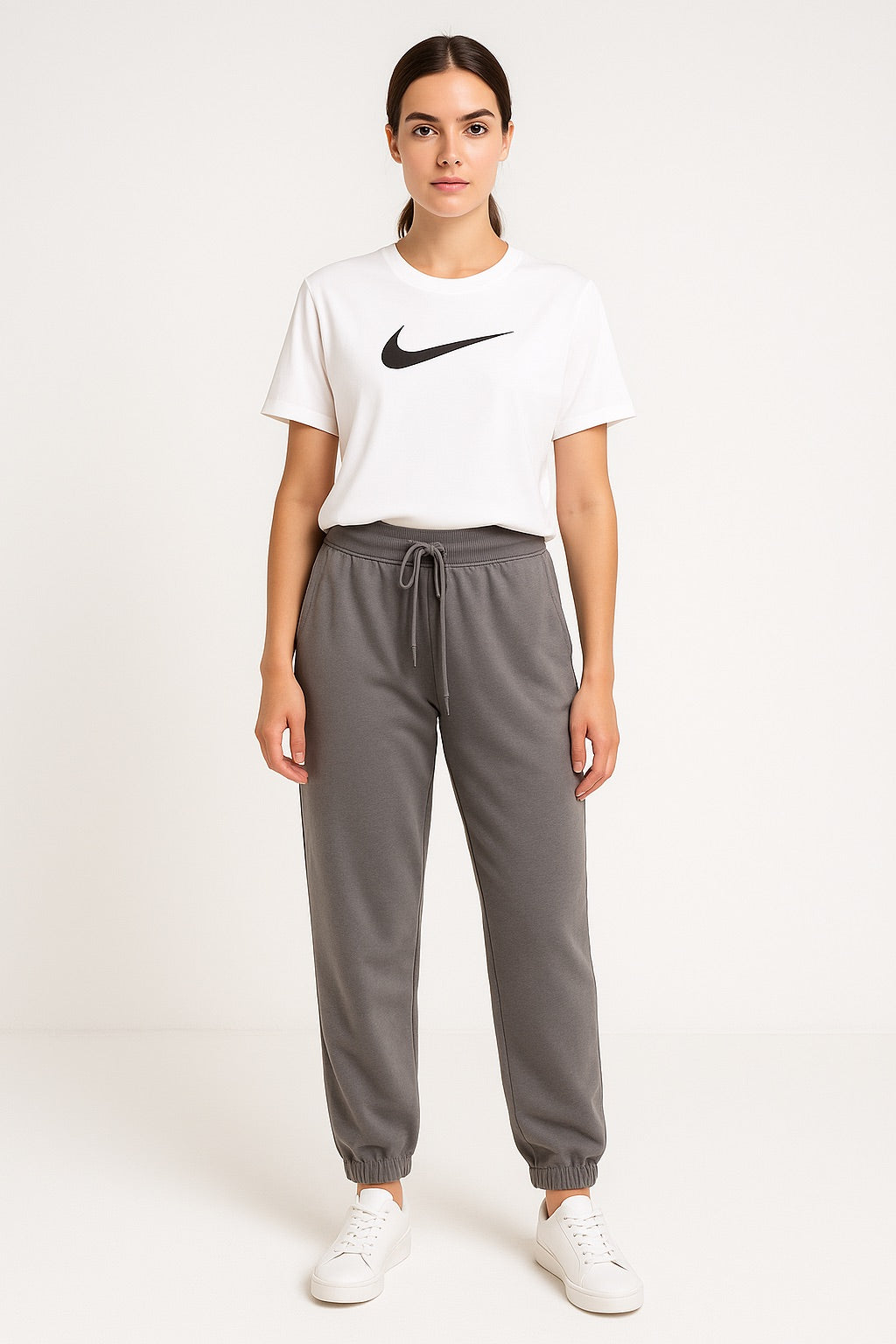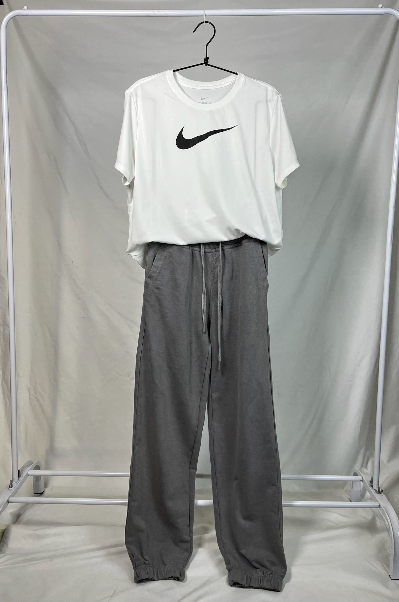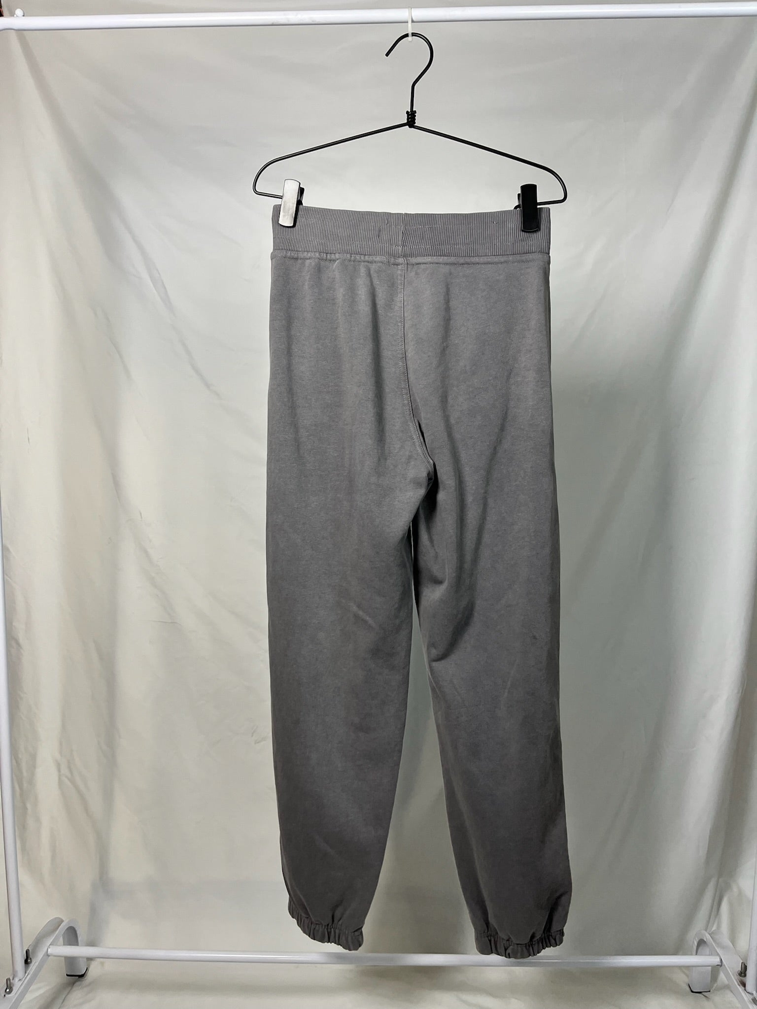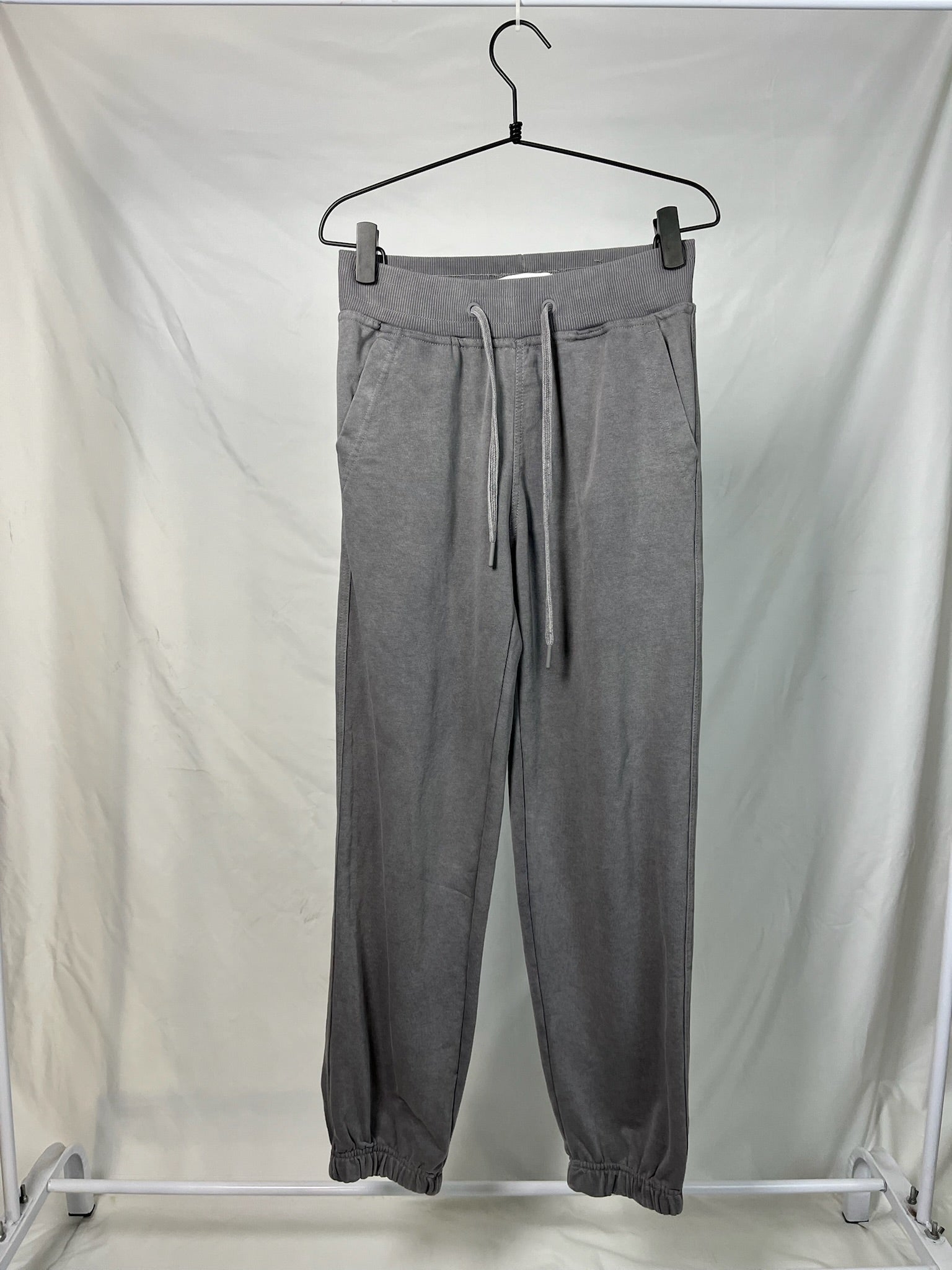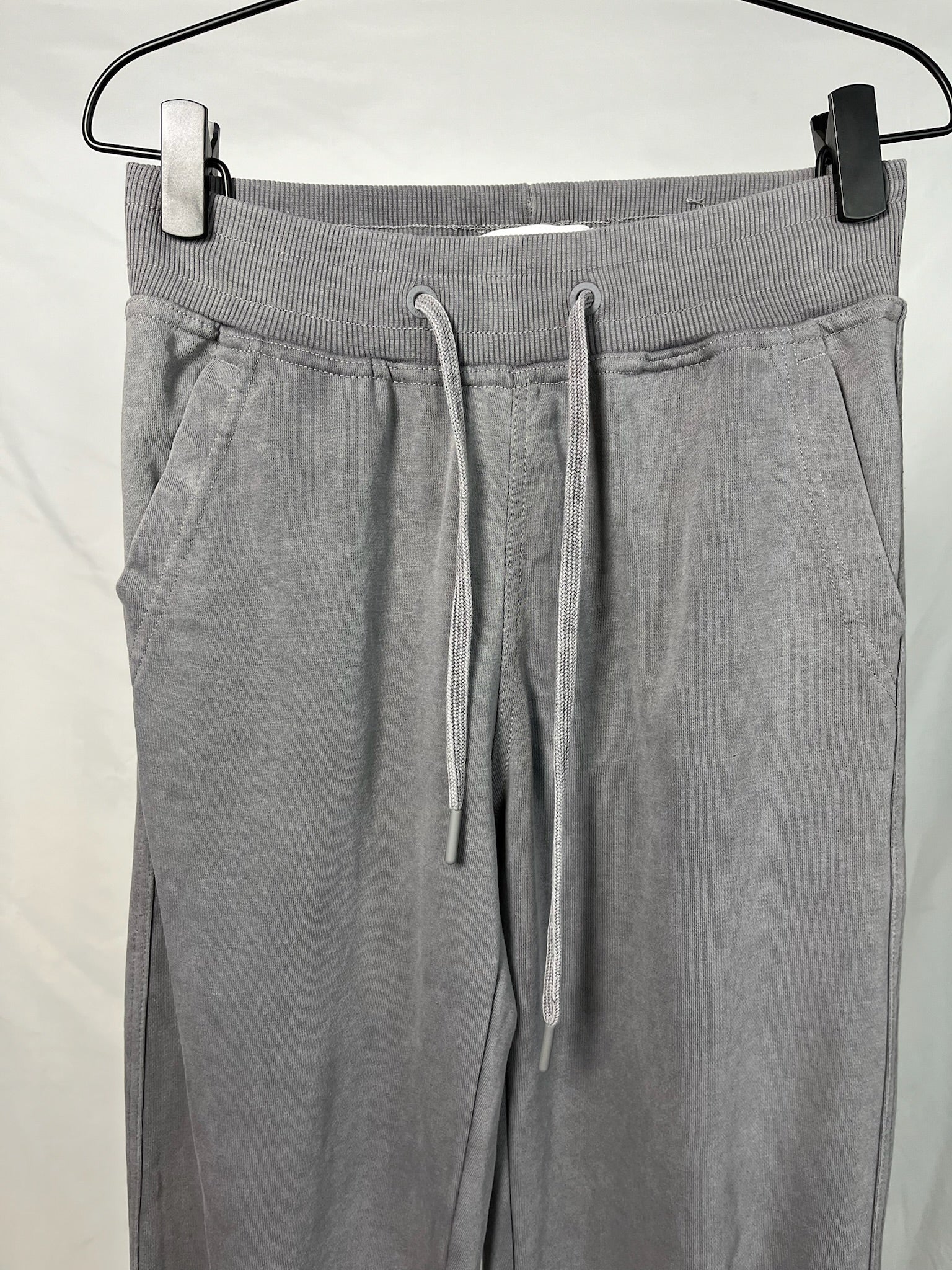 Gray soft fabric adjustable drawstring waist, cuffed ankles relaxed fit sweatpants.