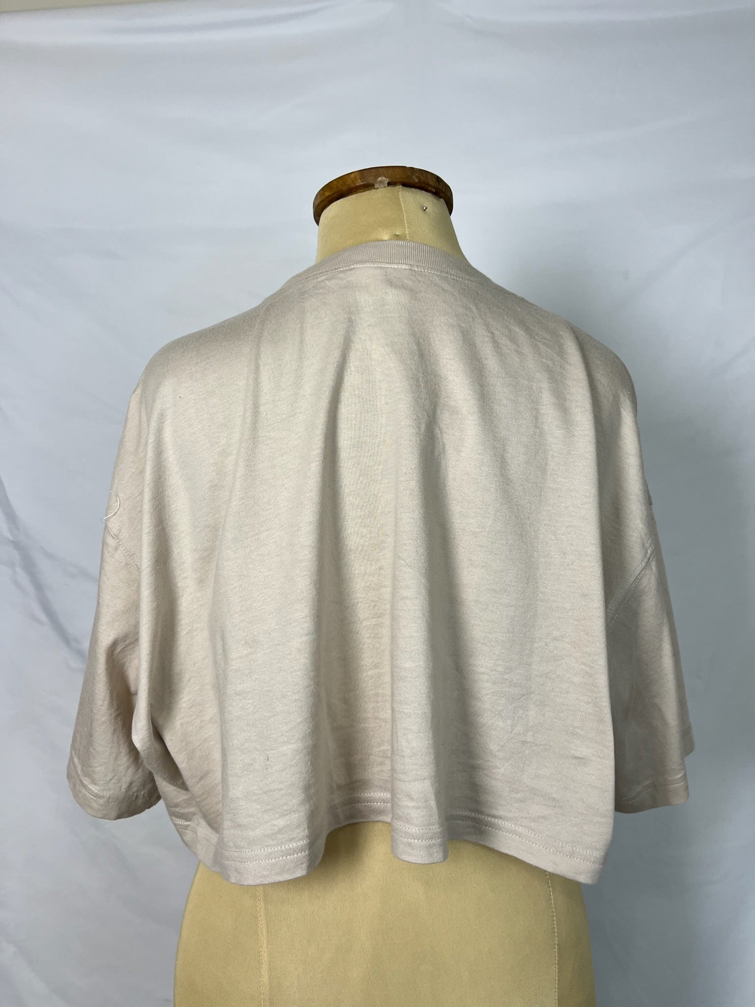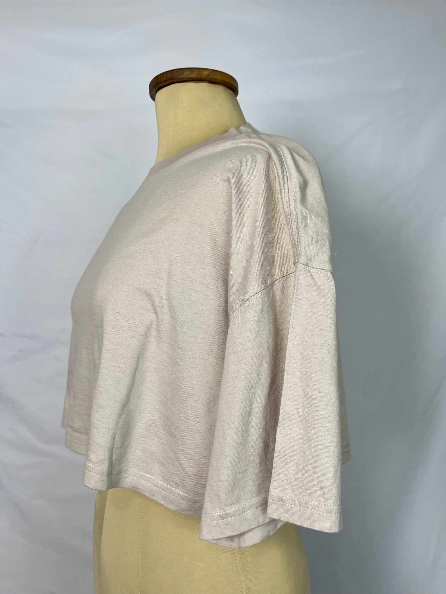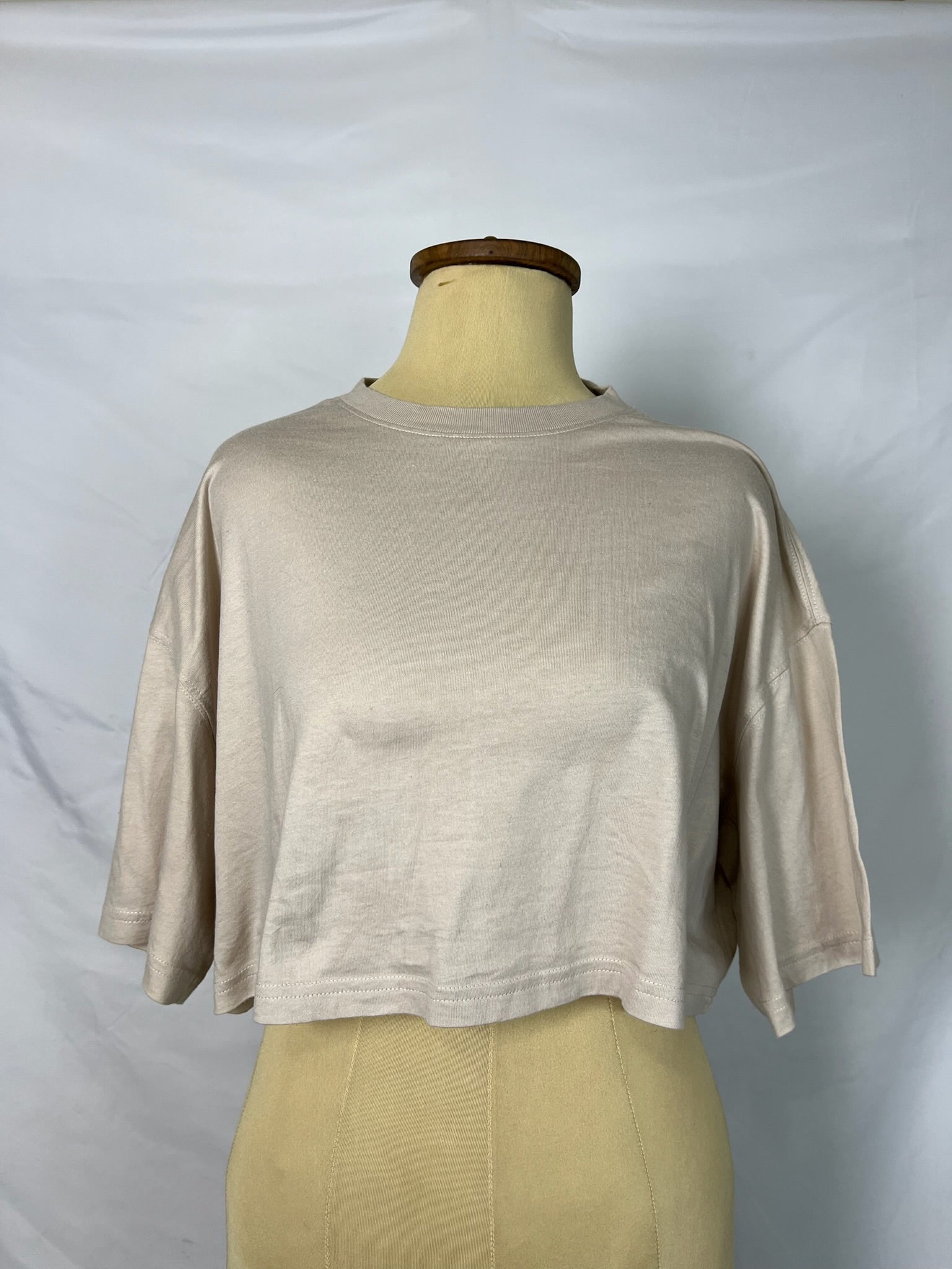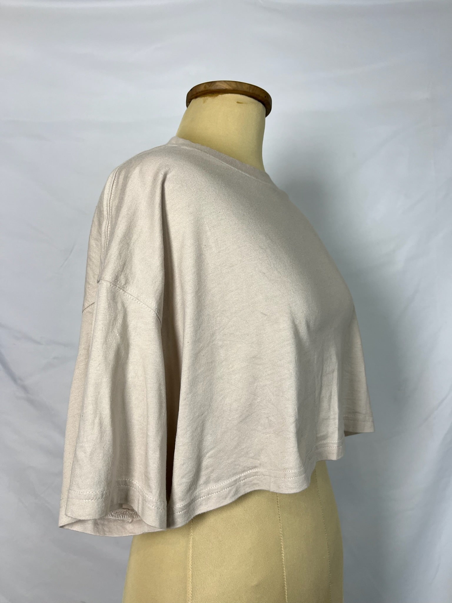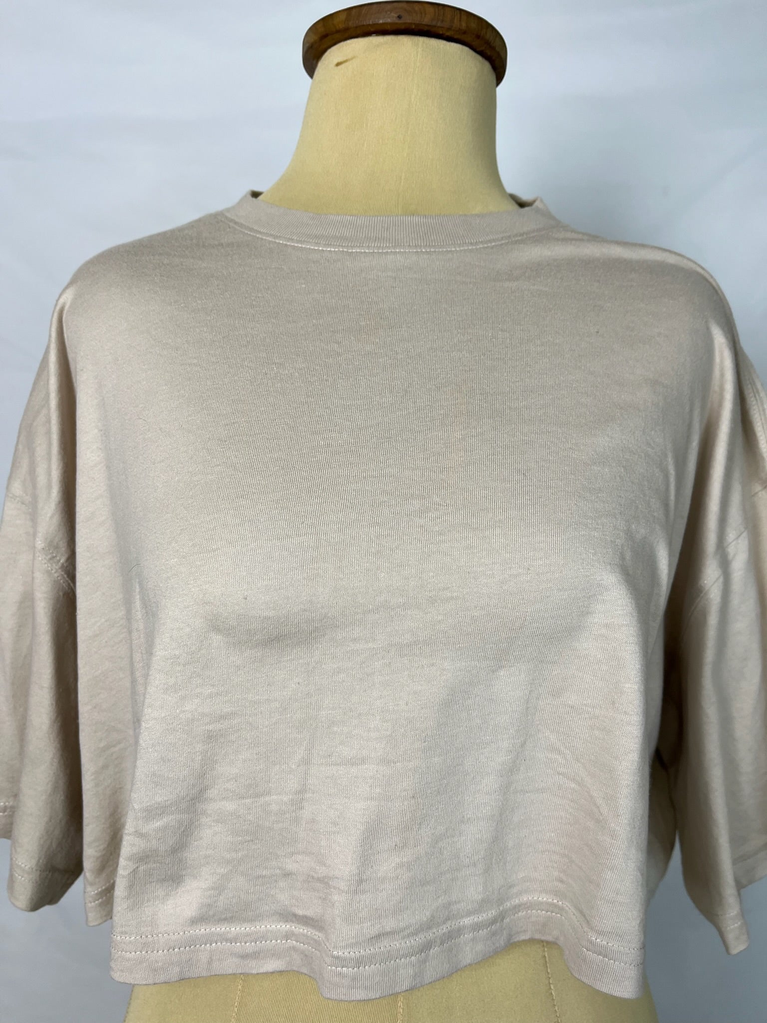 Latte beige airy oversized round neckline oversized short sleeves cropped shirt.
