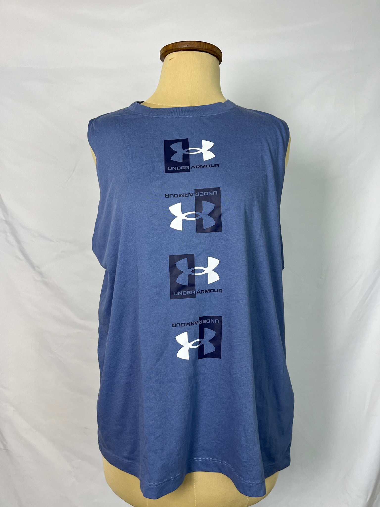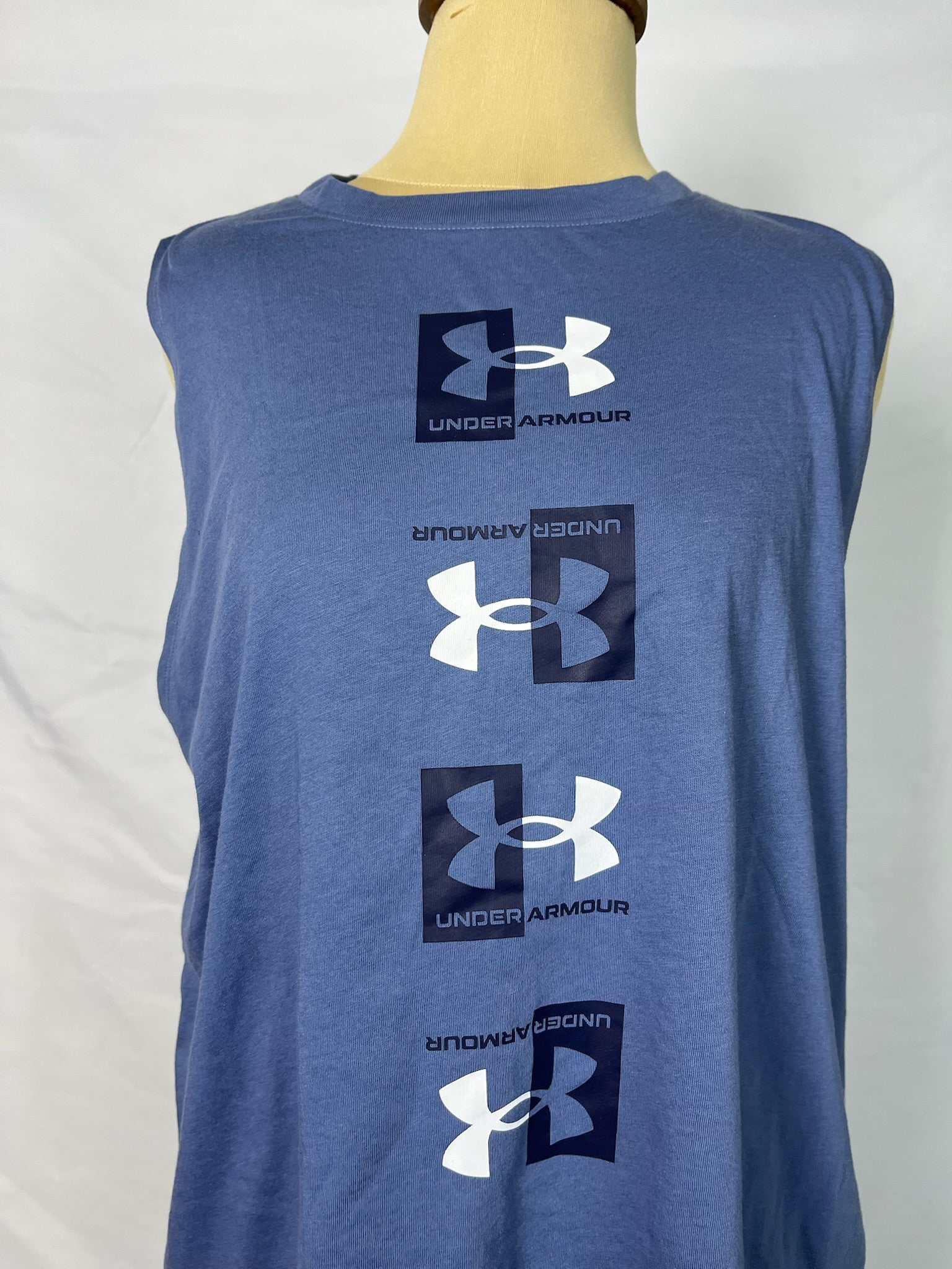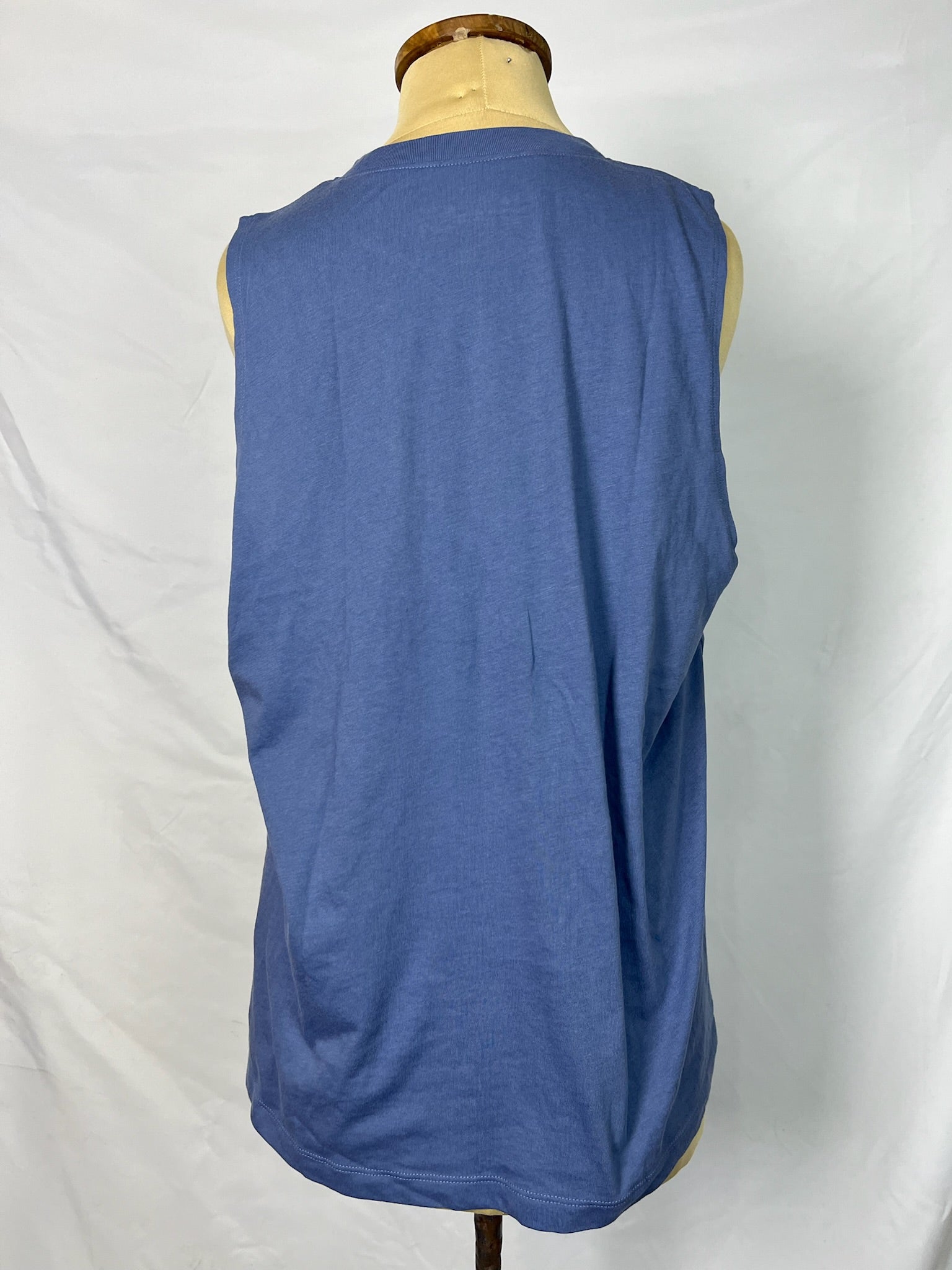 Blue sleeveless breathable loose fit bold triple logo design tee tank.