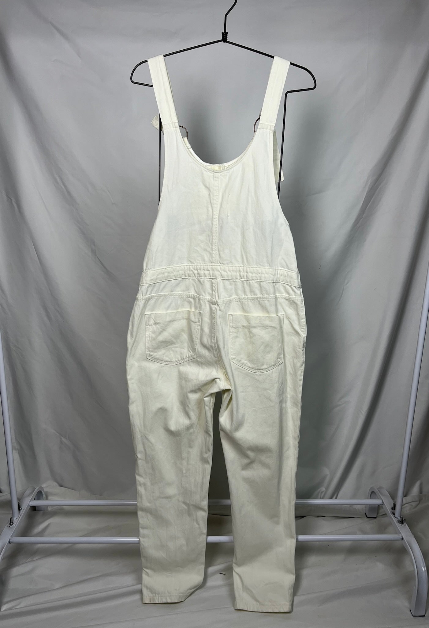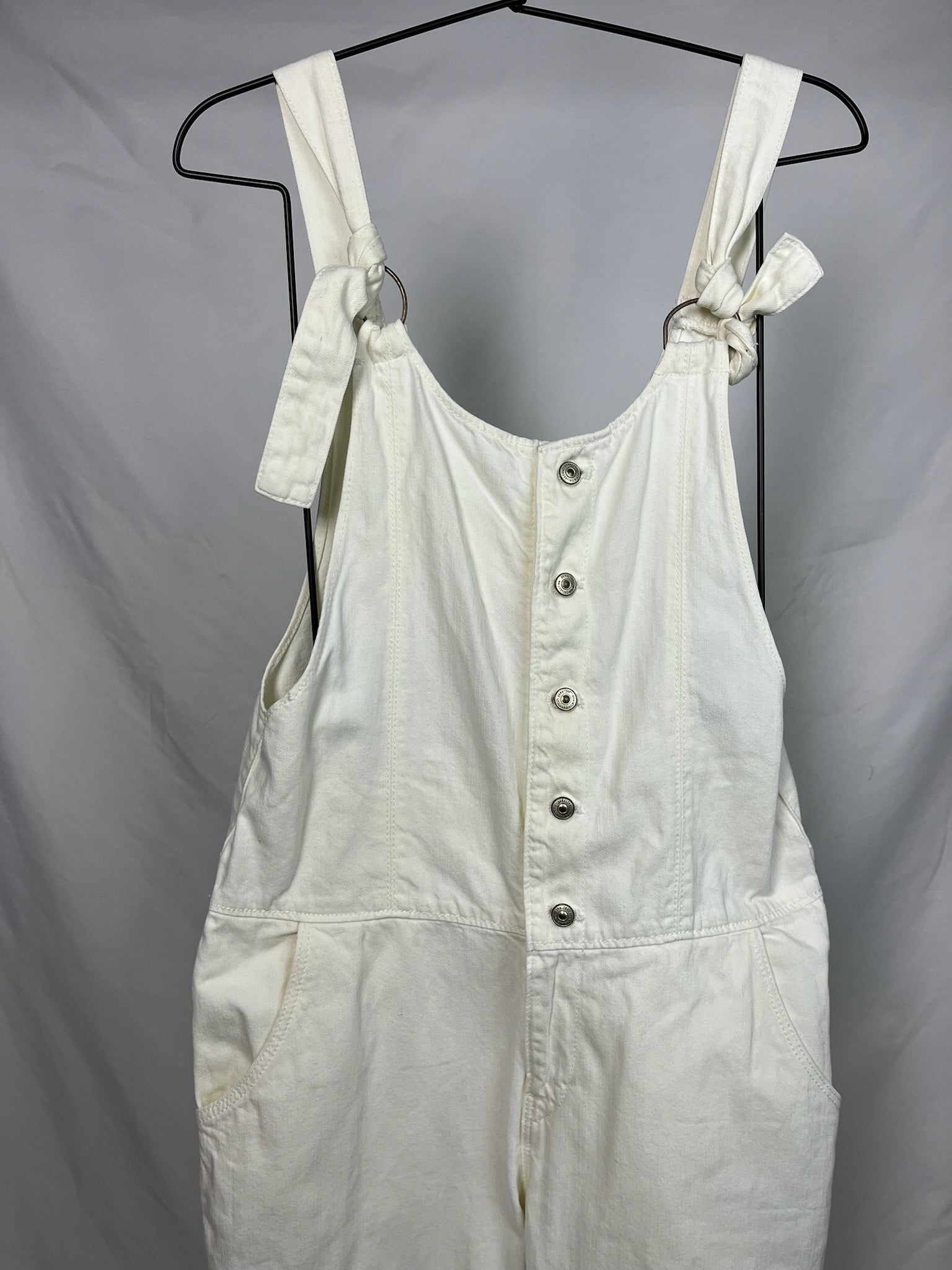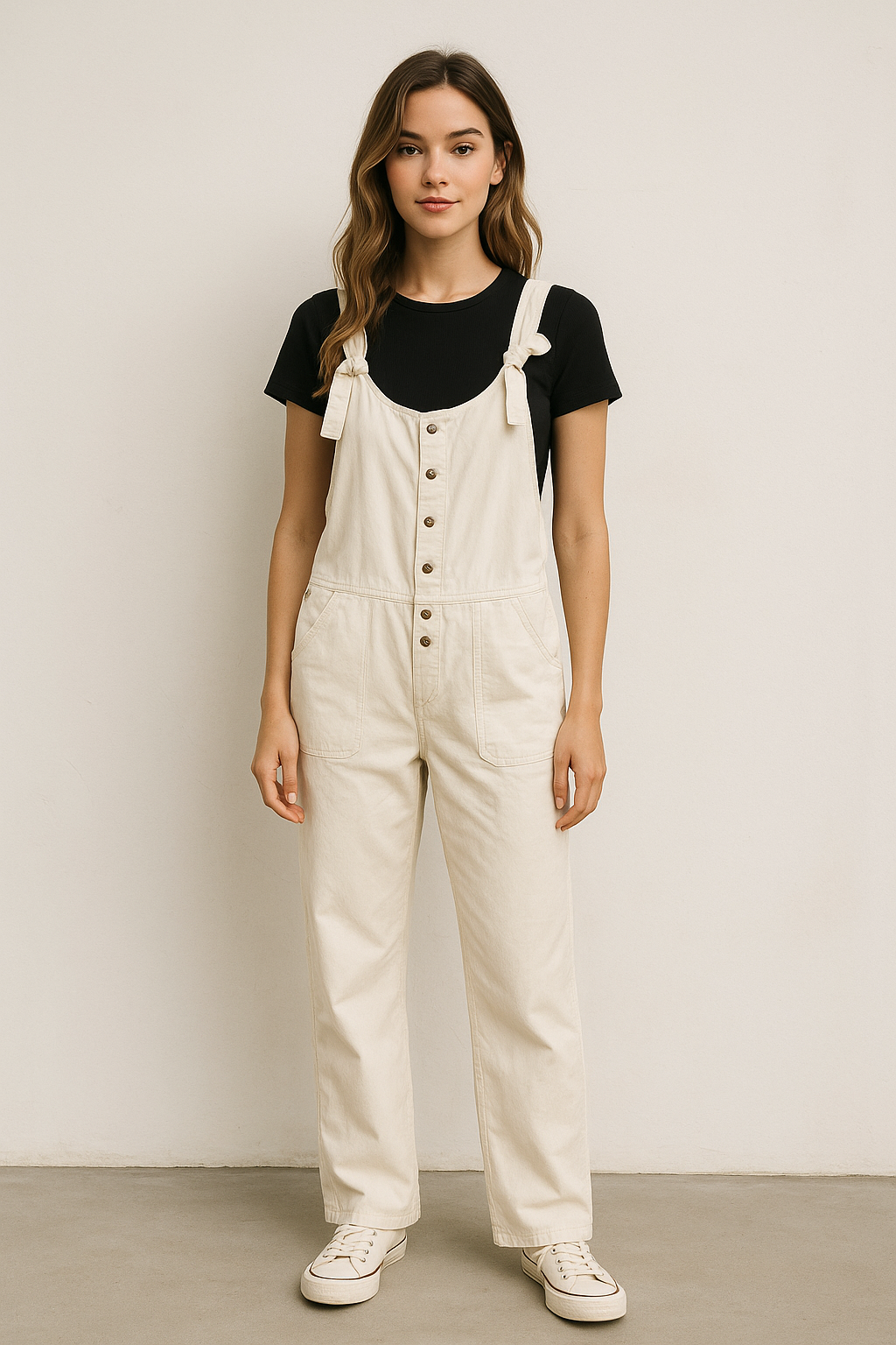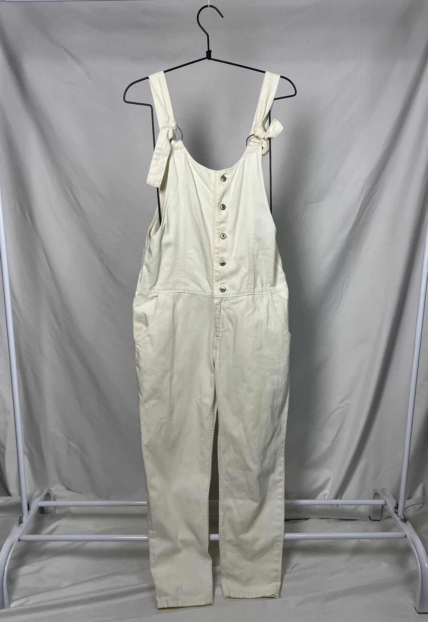 Cream button front jumpsuit with tie straps with side and back pockets jumpsuit.