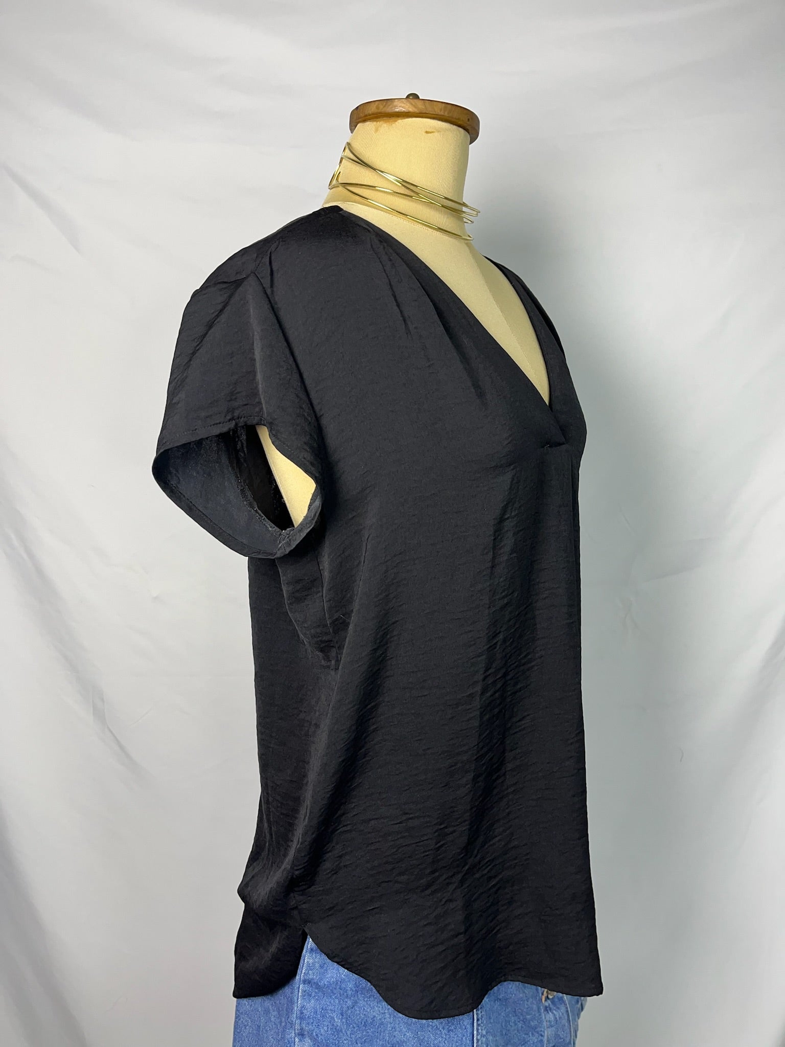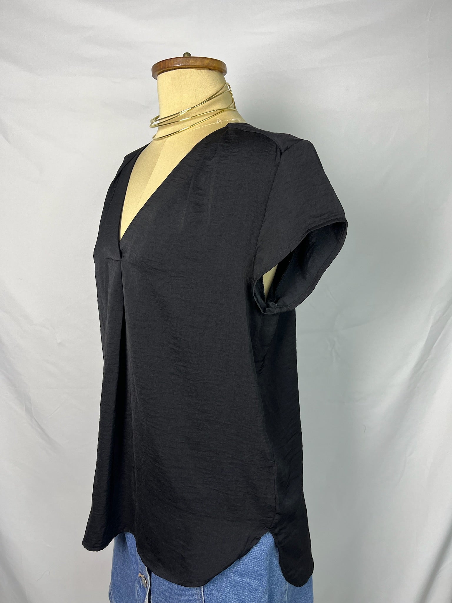 Black soft fabric short sleeves deep V neckline basic blouse.