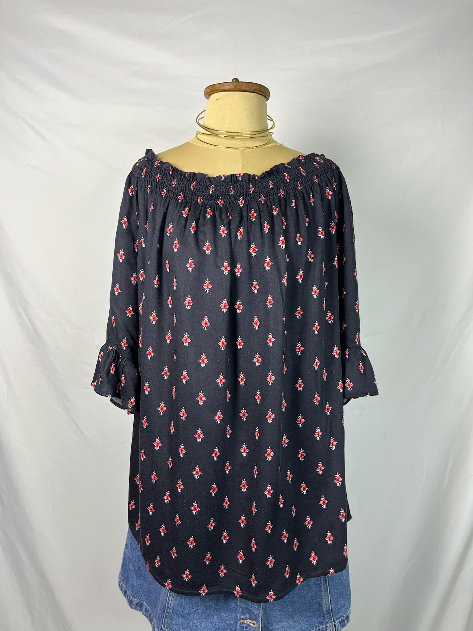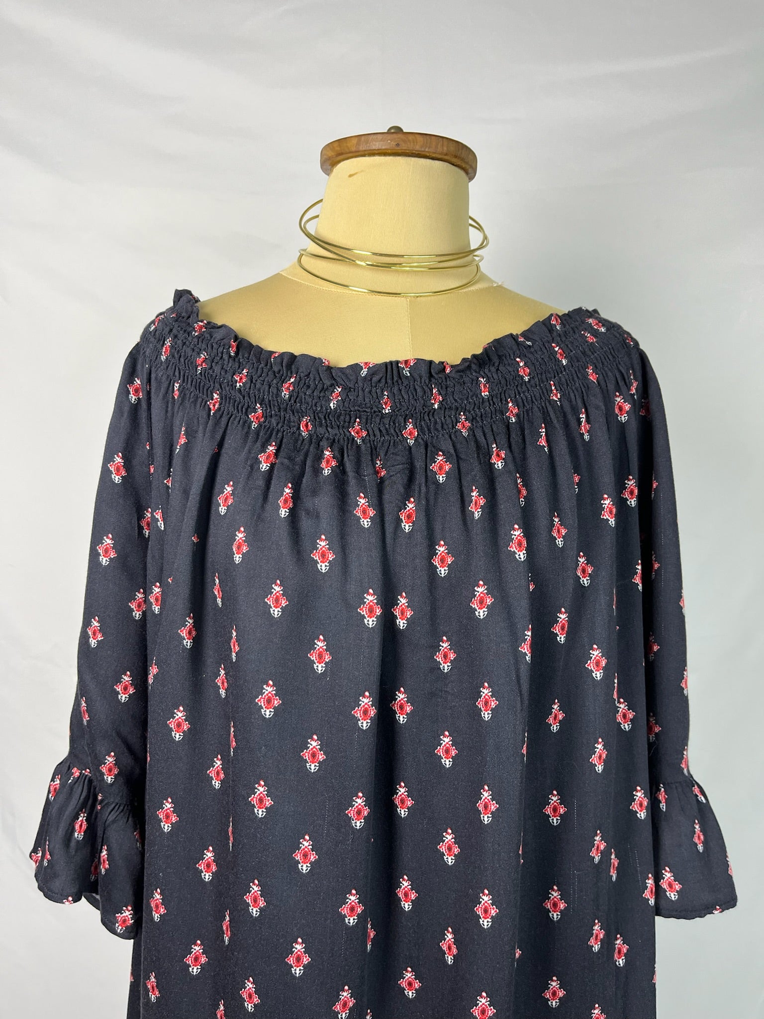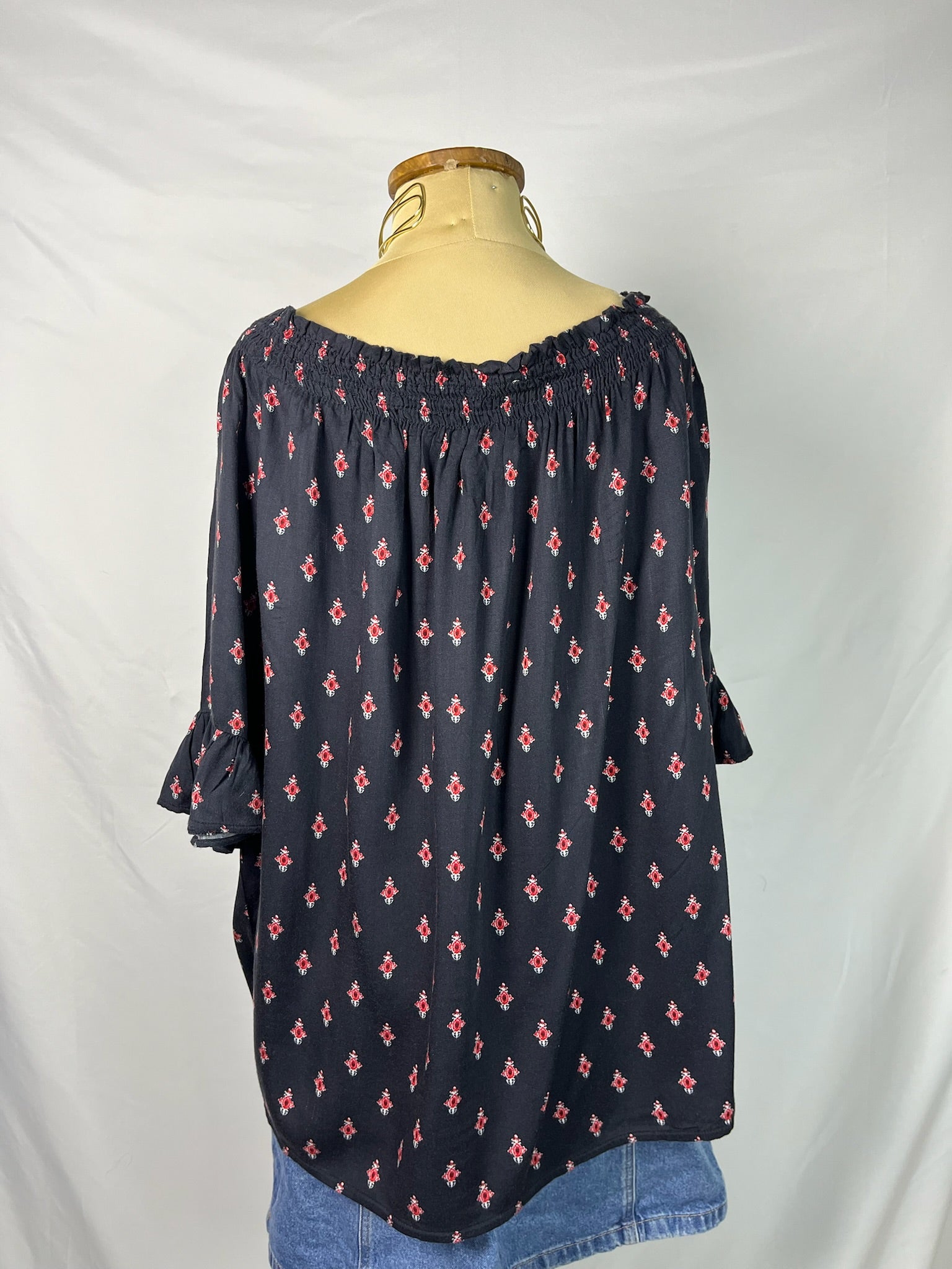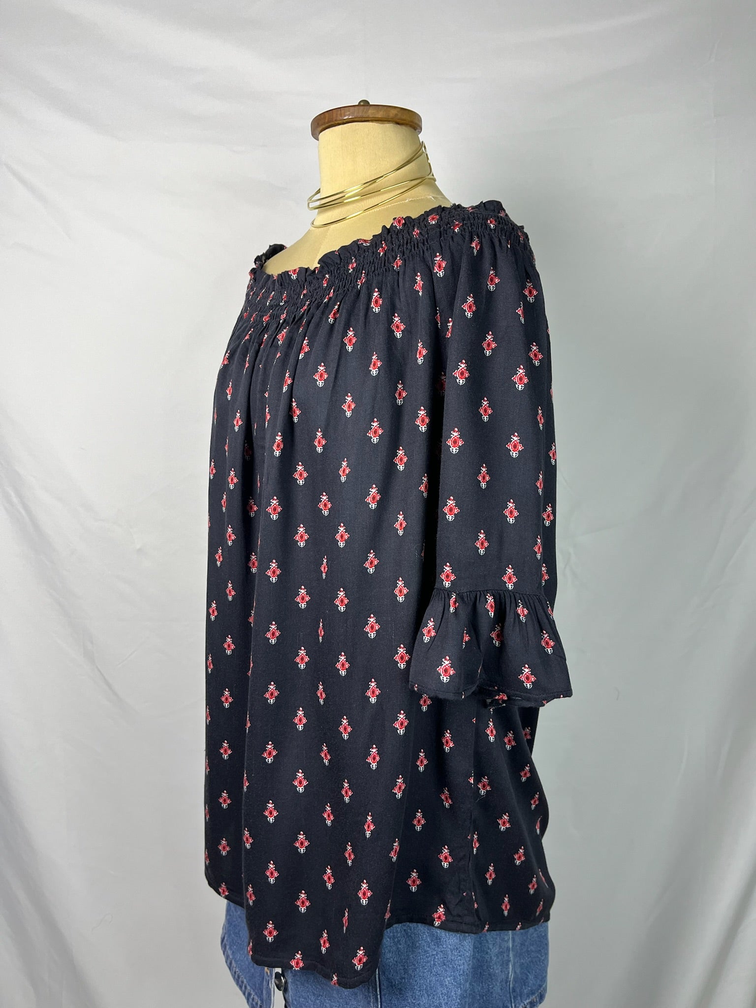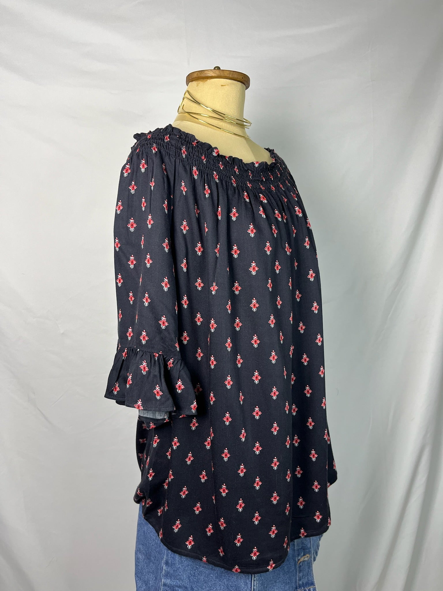 Black off the shoulder top with red prints scattered all over, elastic shirring along the neckline with ruffle sleeve hems lightweight flowy top.