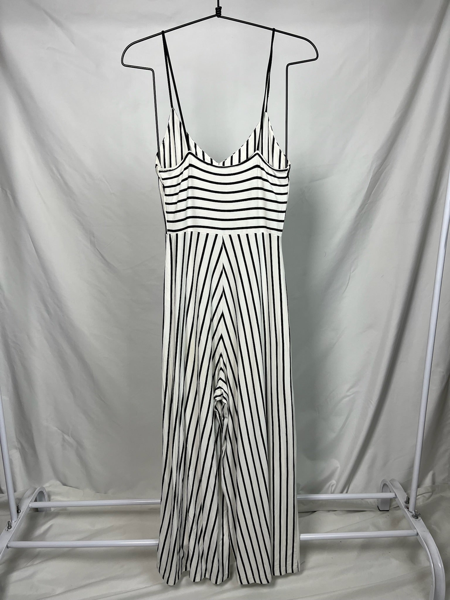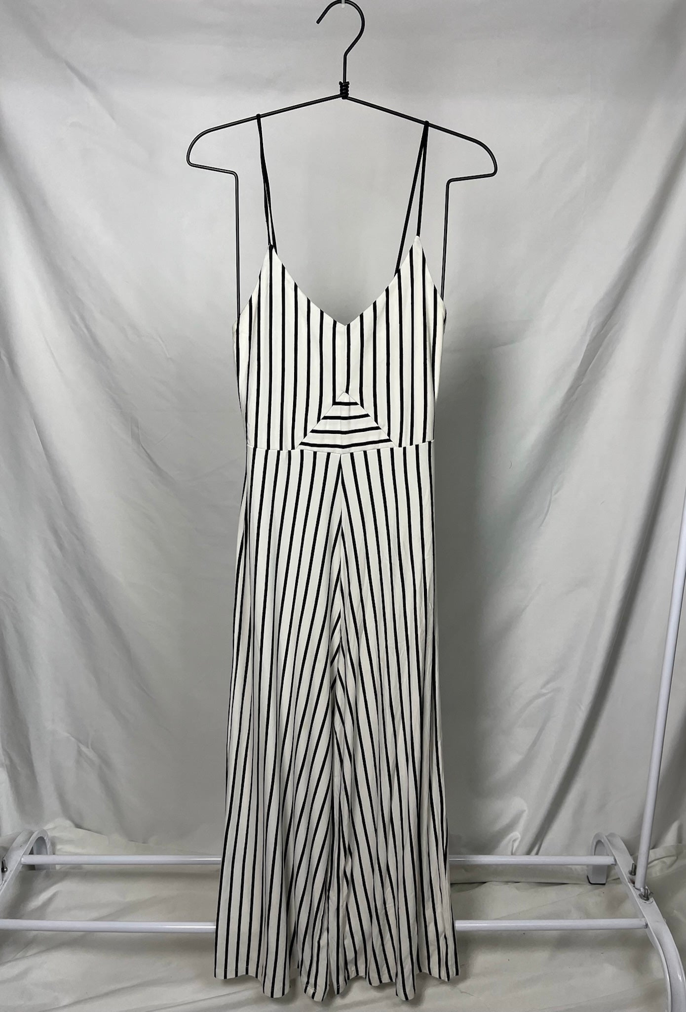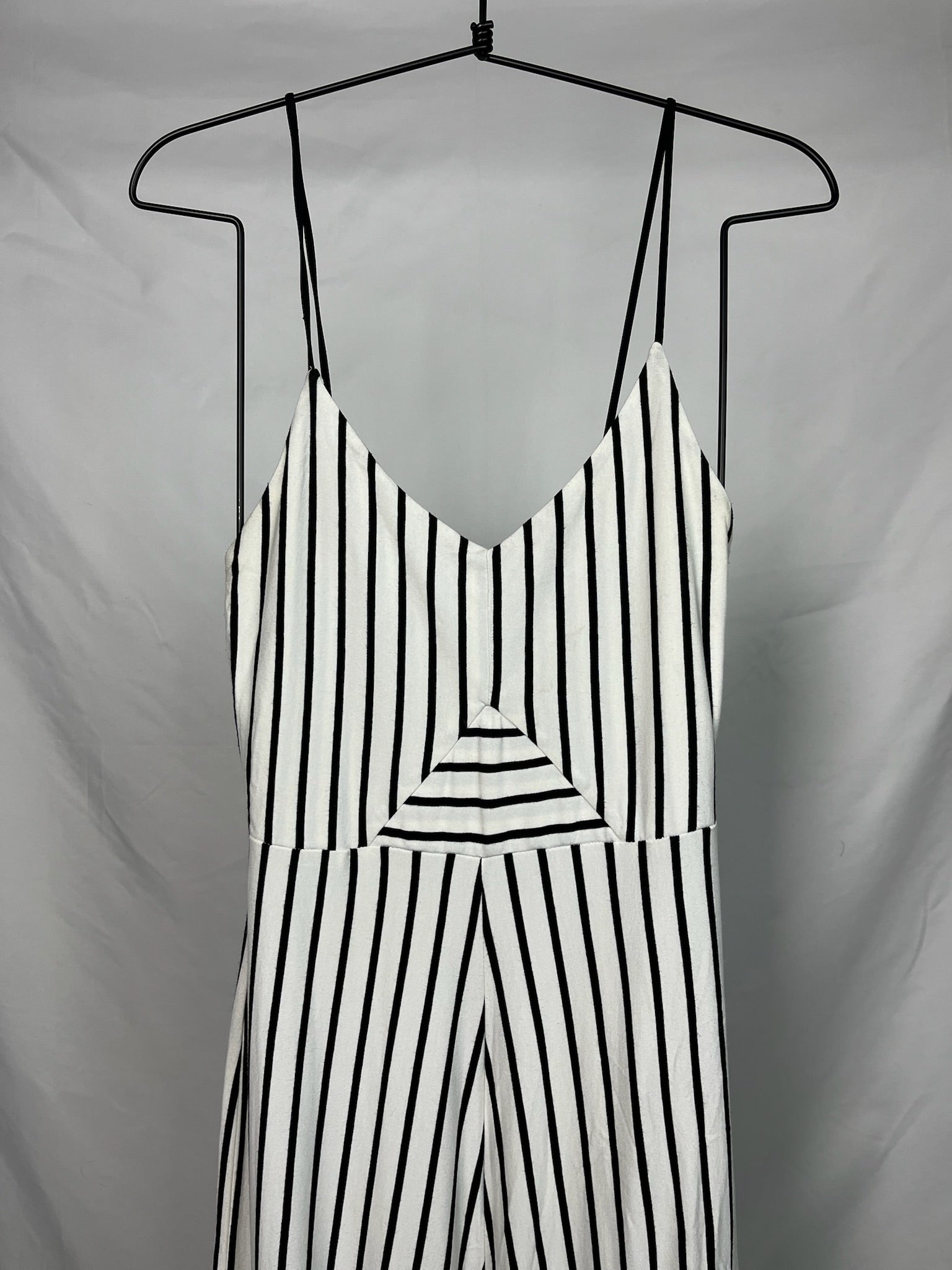 Black & white thin spaghetti straps and a V-neckline, with a unique panel design at the waist for a structured silhouette comfy culotte jumpsuit.