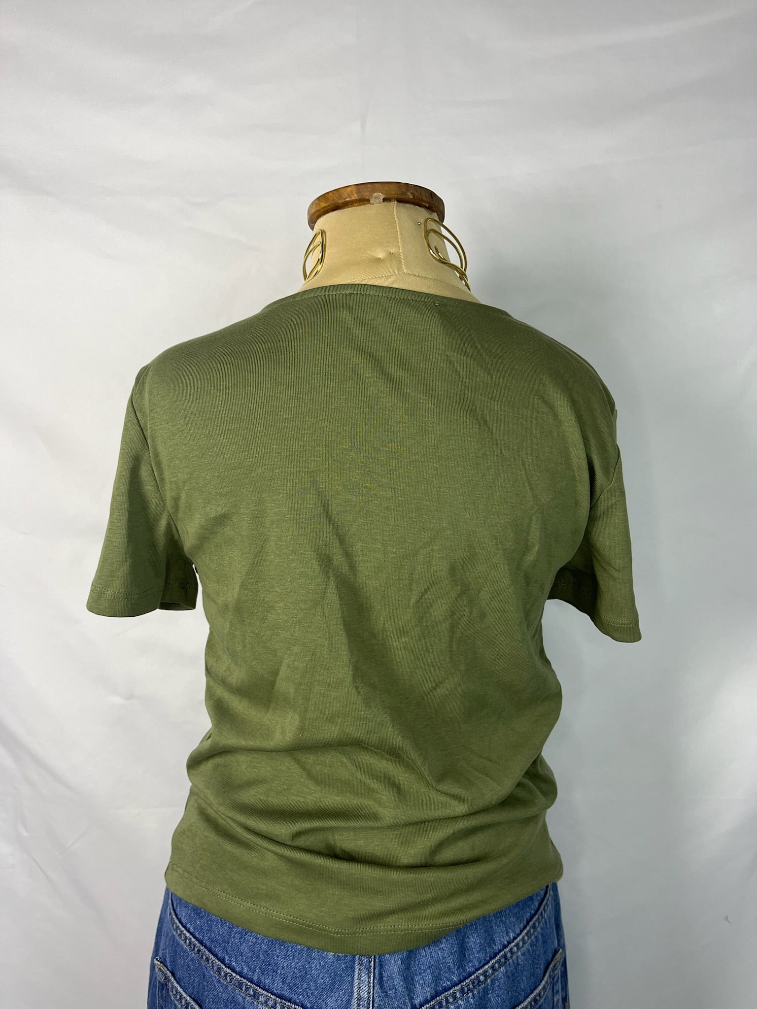 New olive green short sleeves runched ring cut-out V-neckline t-shirt.