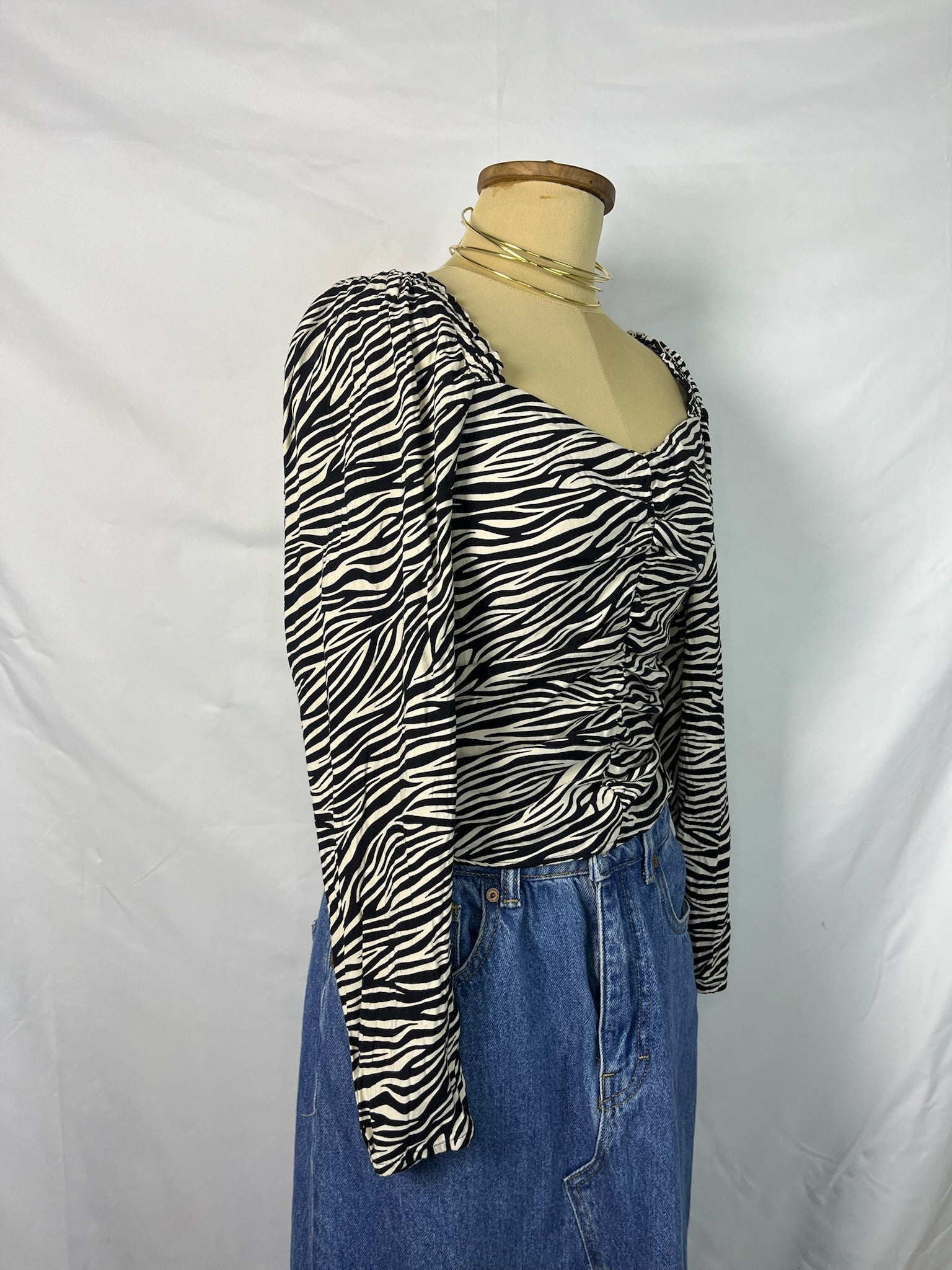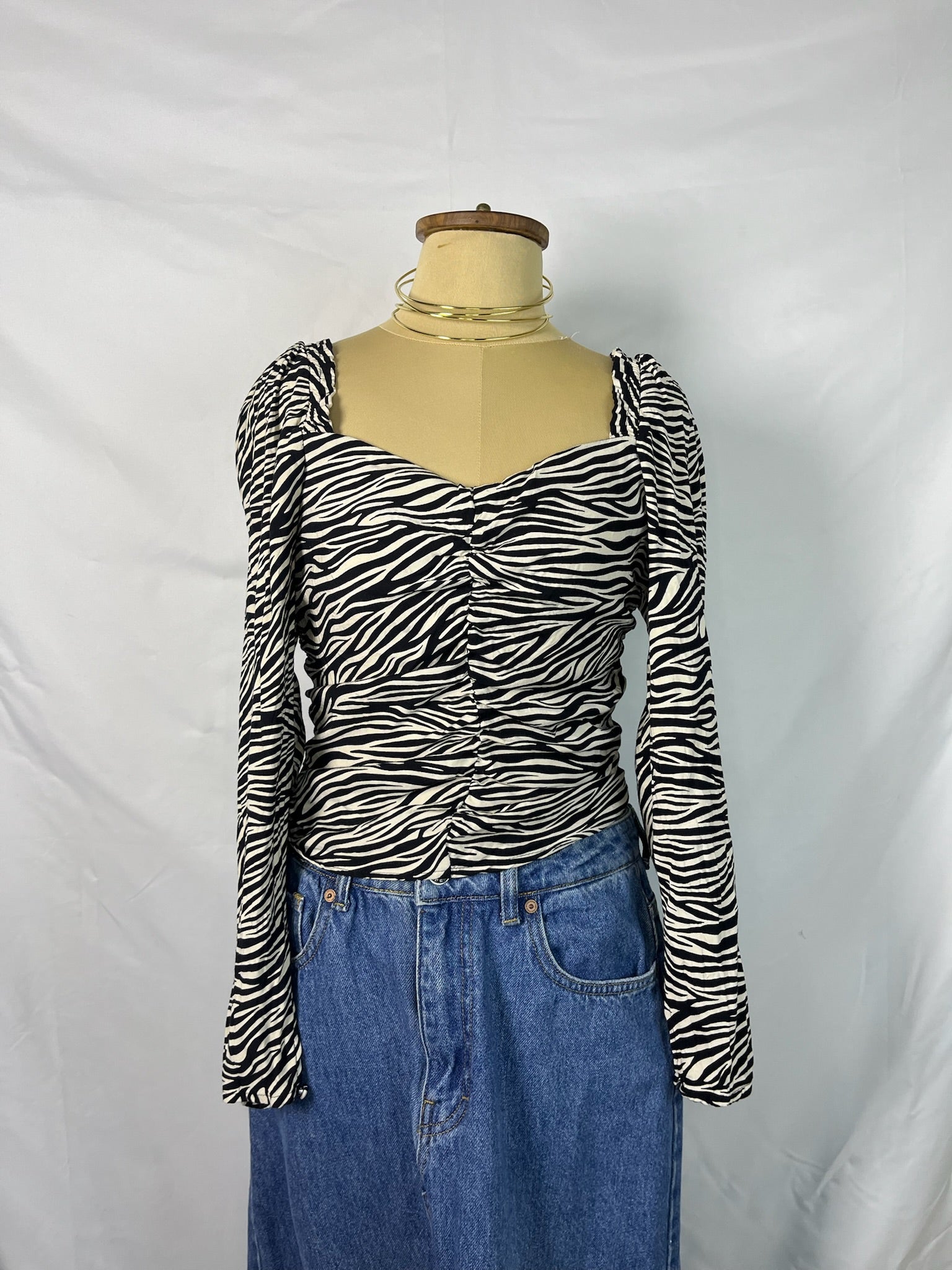 Zebra print long sleeves heart shaped neckline scrunched top.