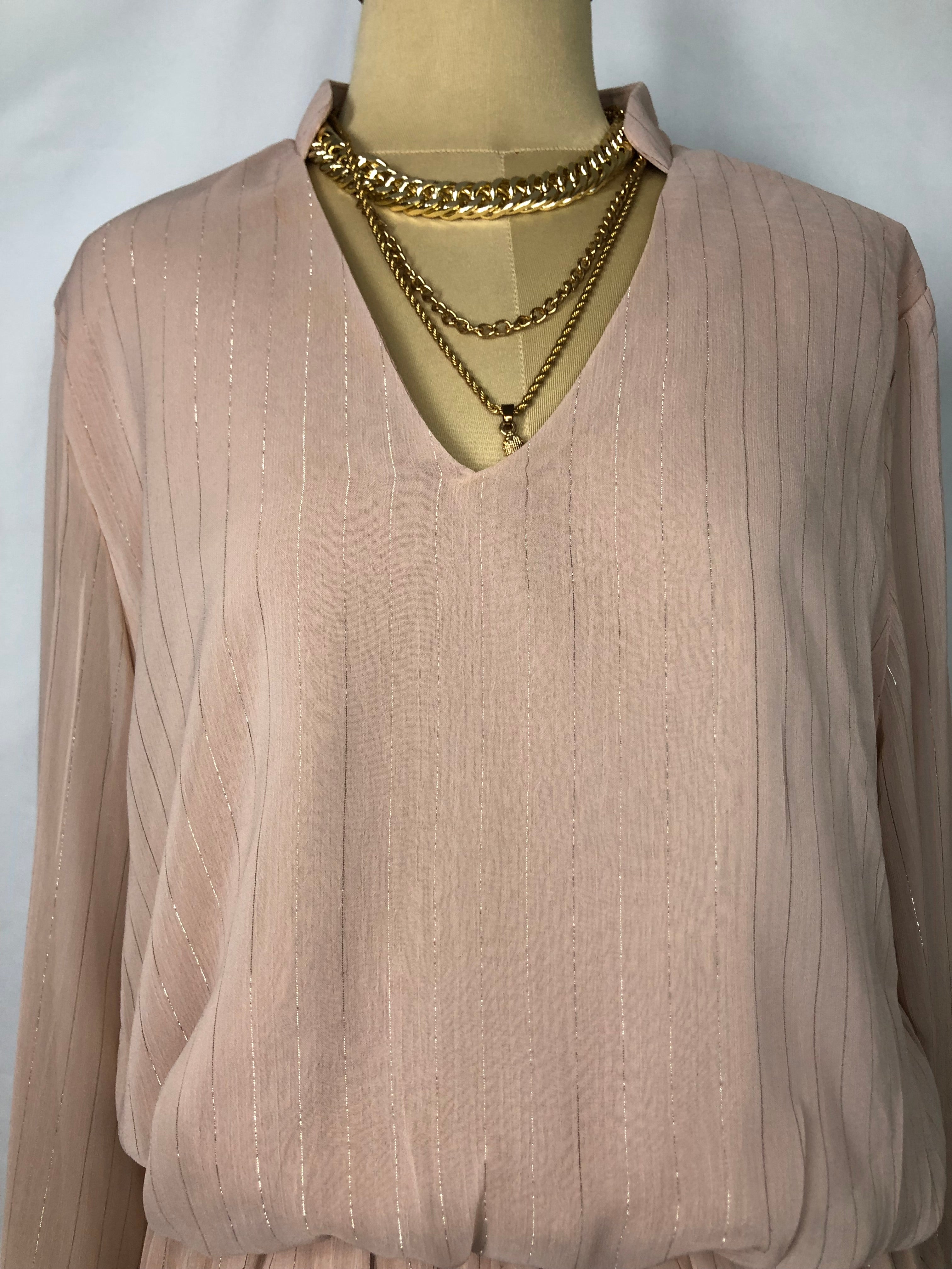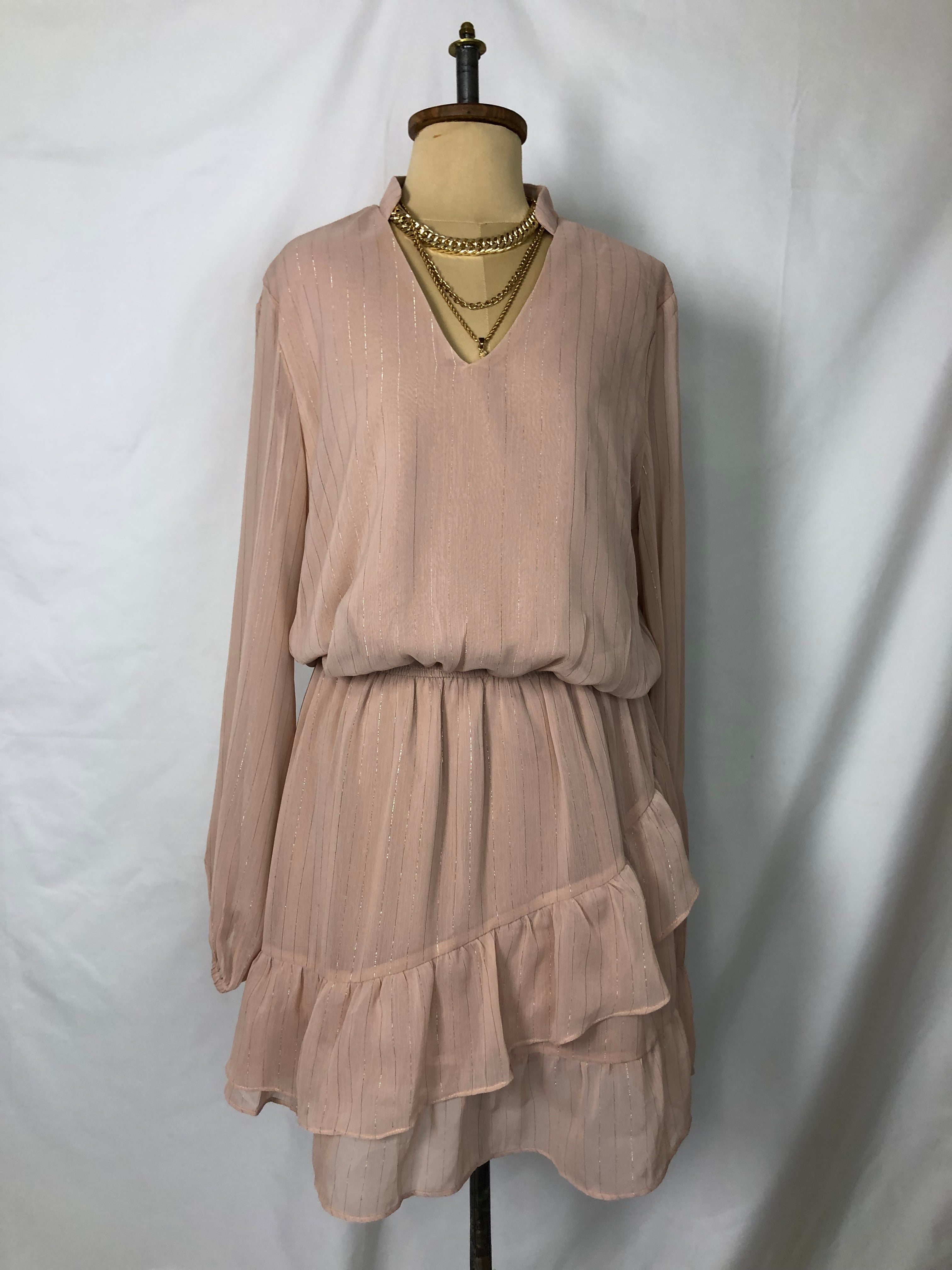 Pinkish beige striped with shimmer silver long sleeves v-neck cut with a little collar short length chiffon asymmetrical ruffled dress.