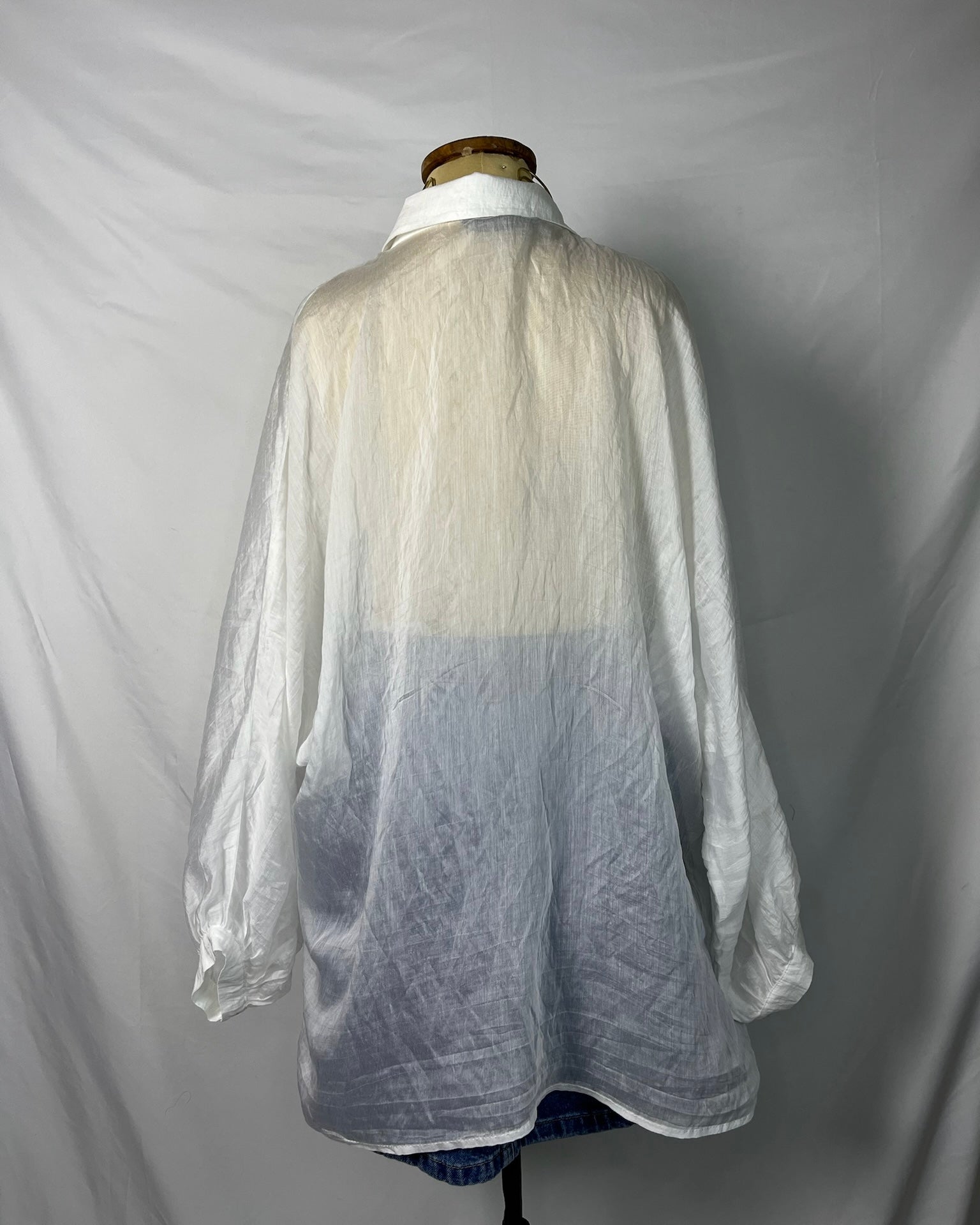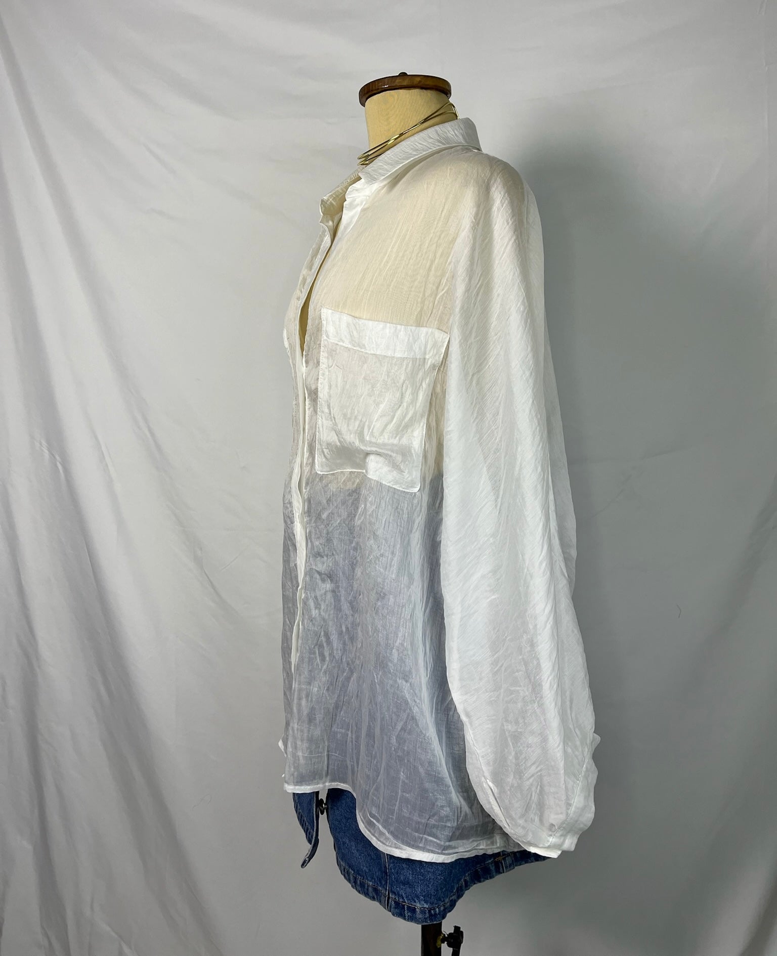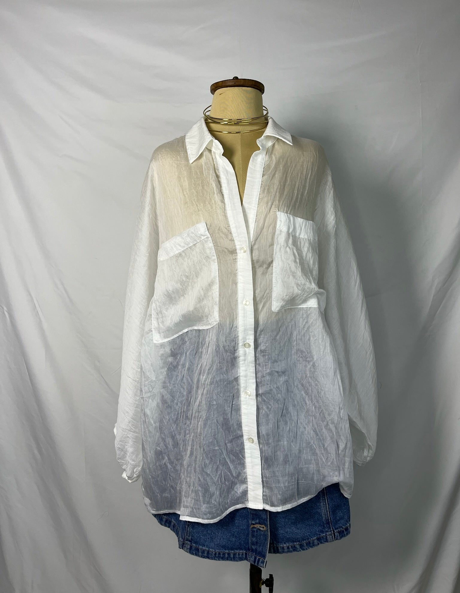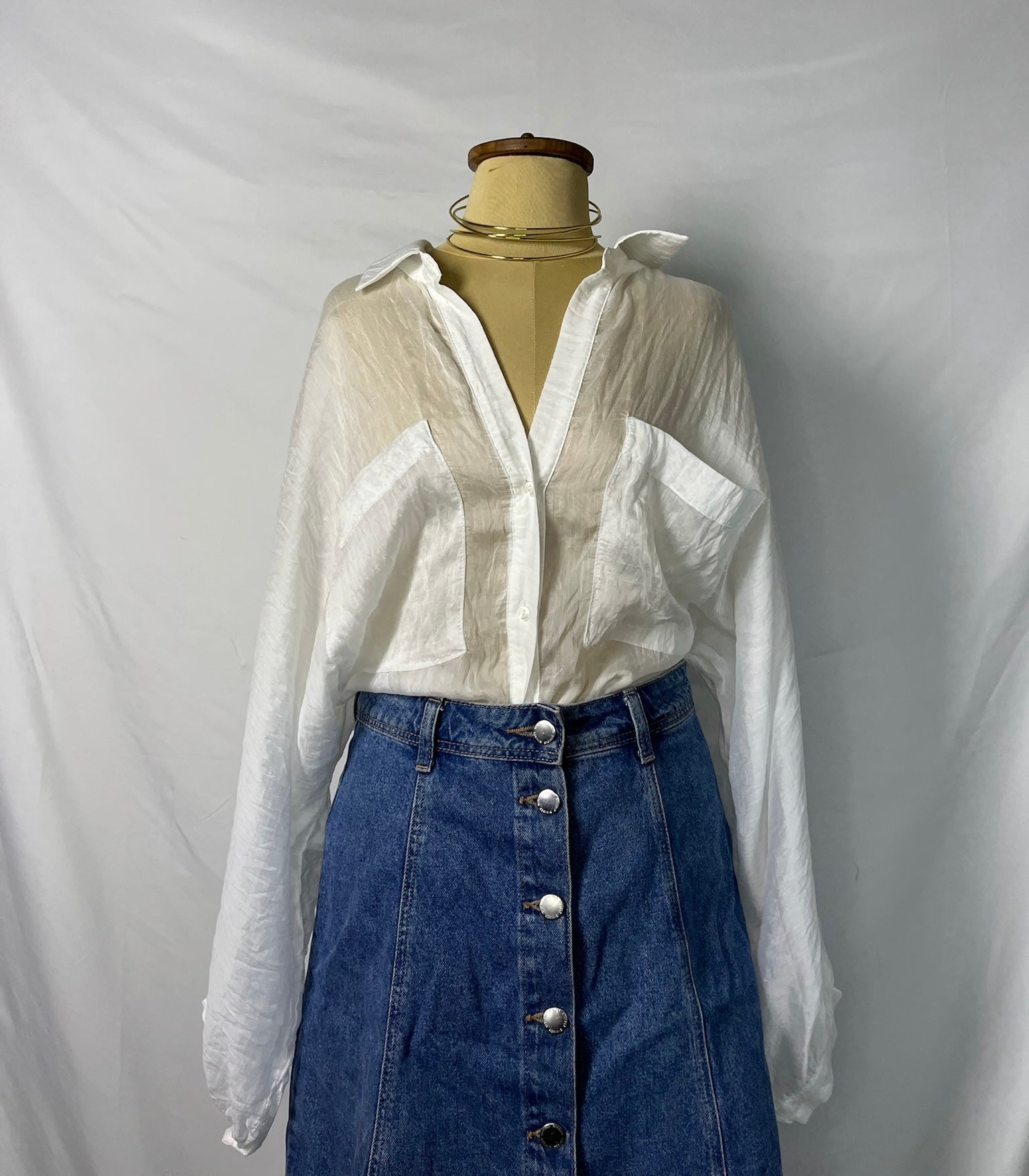 White collared long sleeves lightweight textured fabric with two side pockets sheer button up blouse.