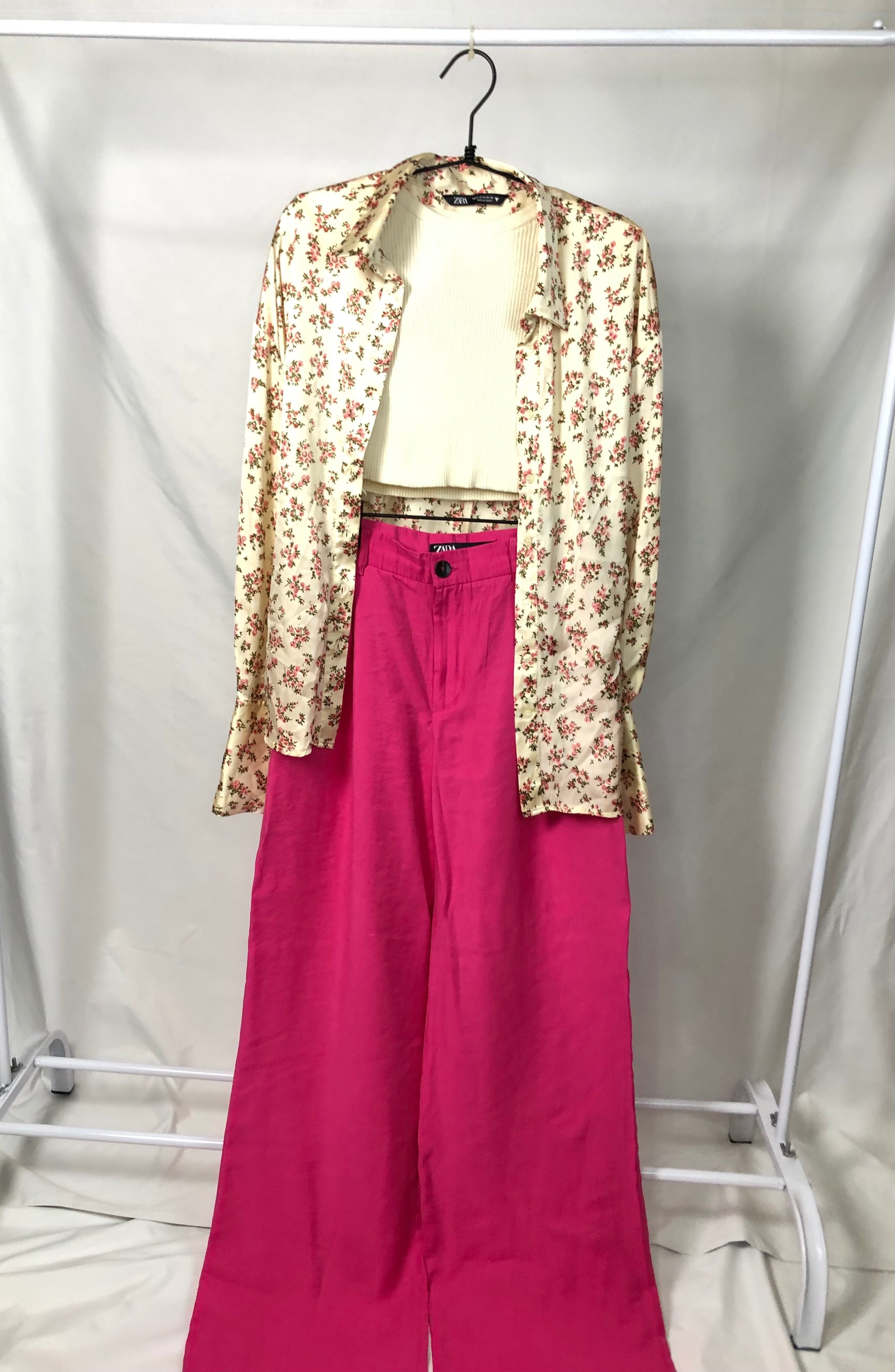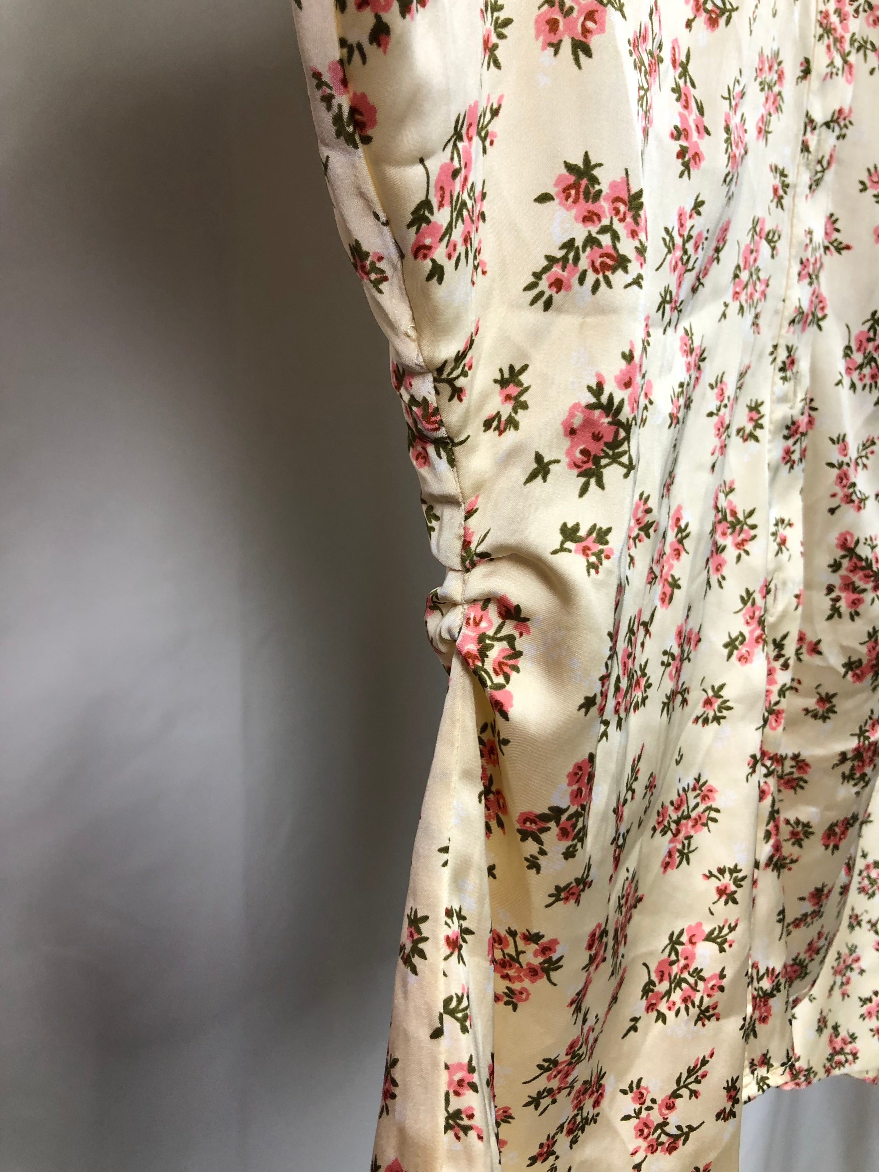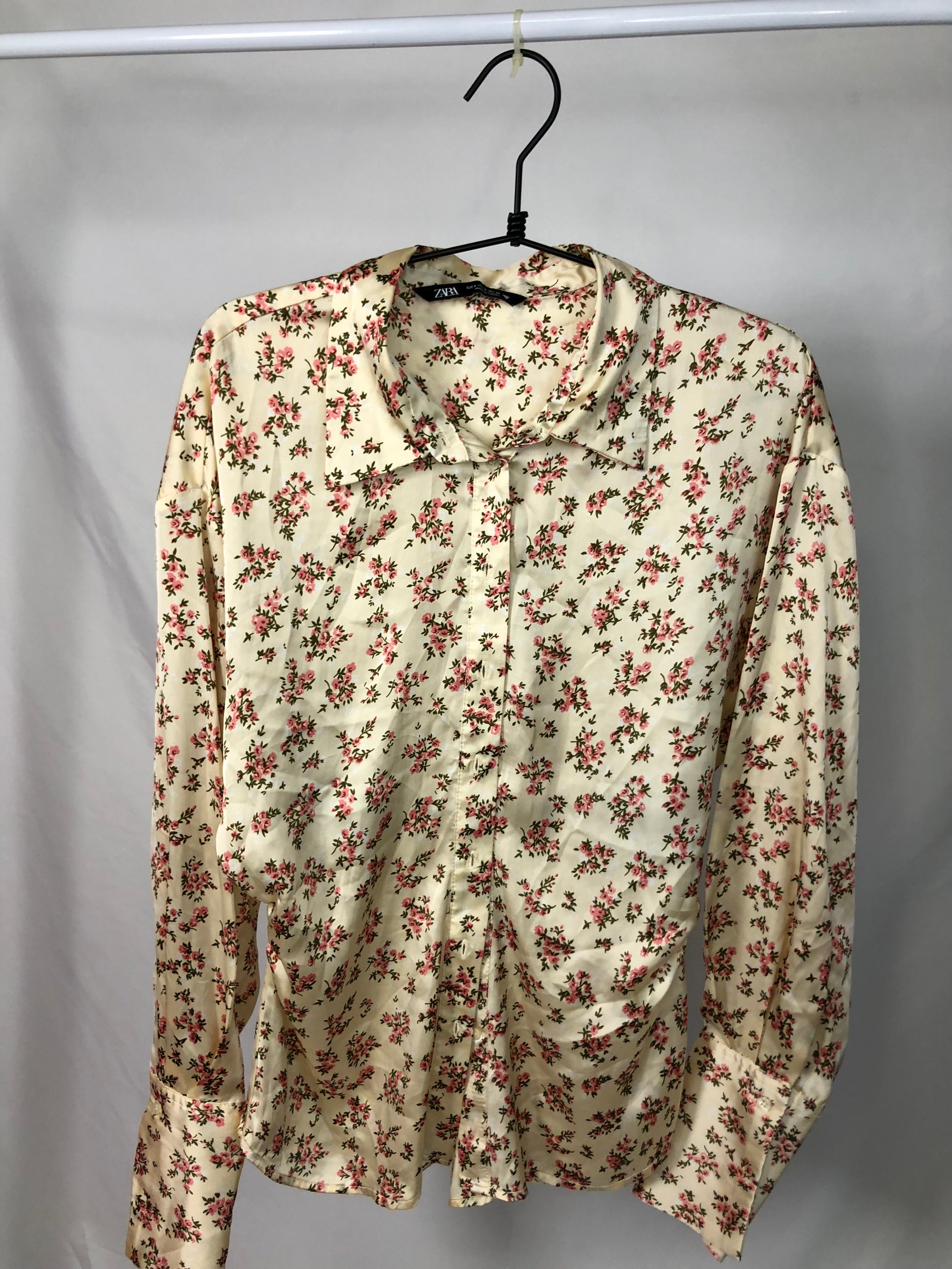 Off white floral satin long sleeves side scrunched from the waist button down blouse.