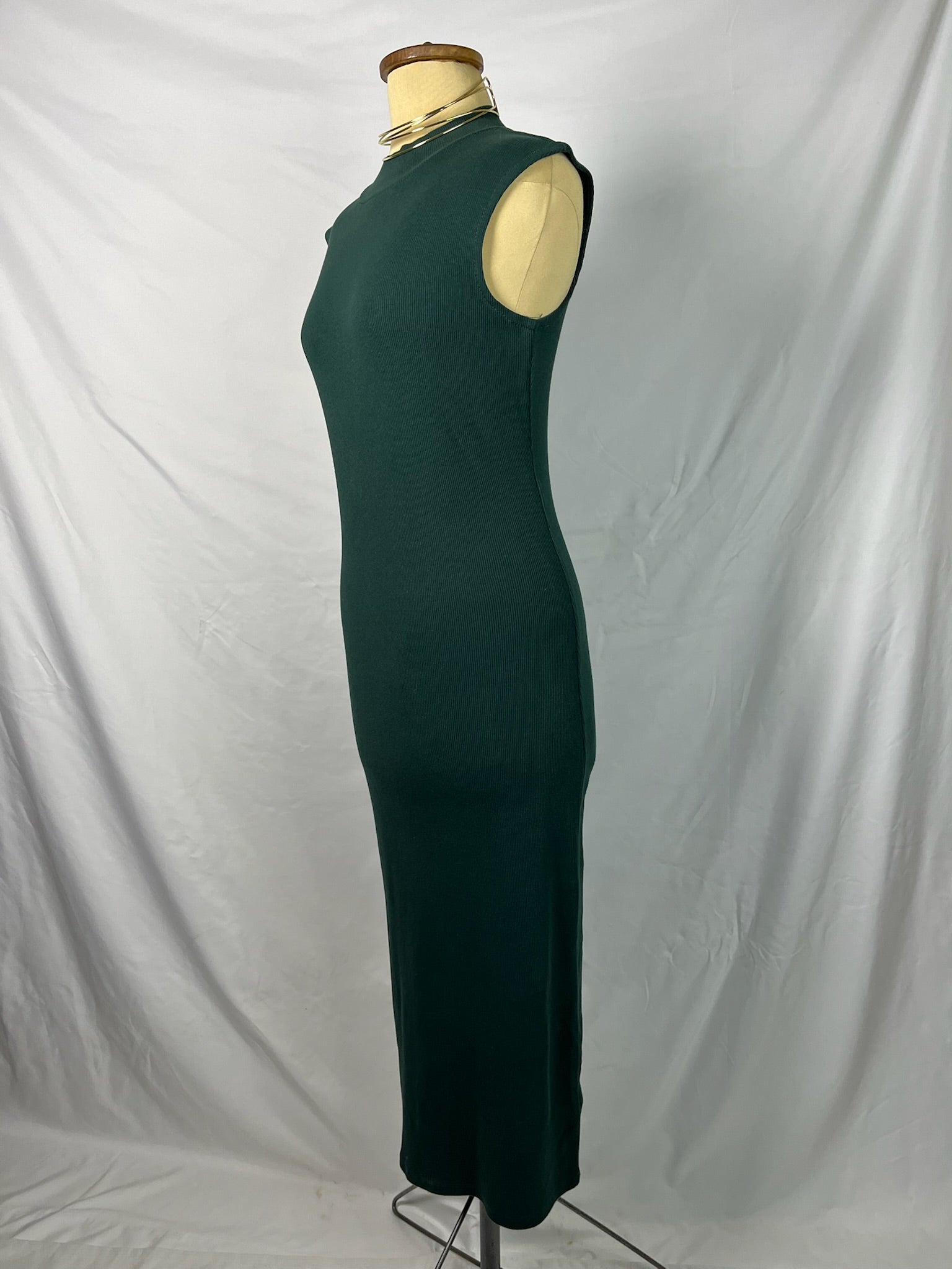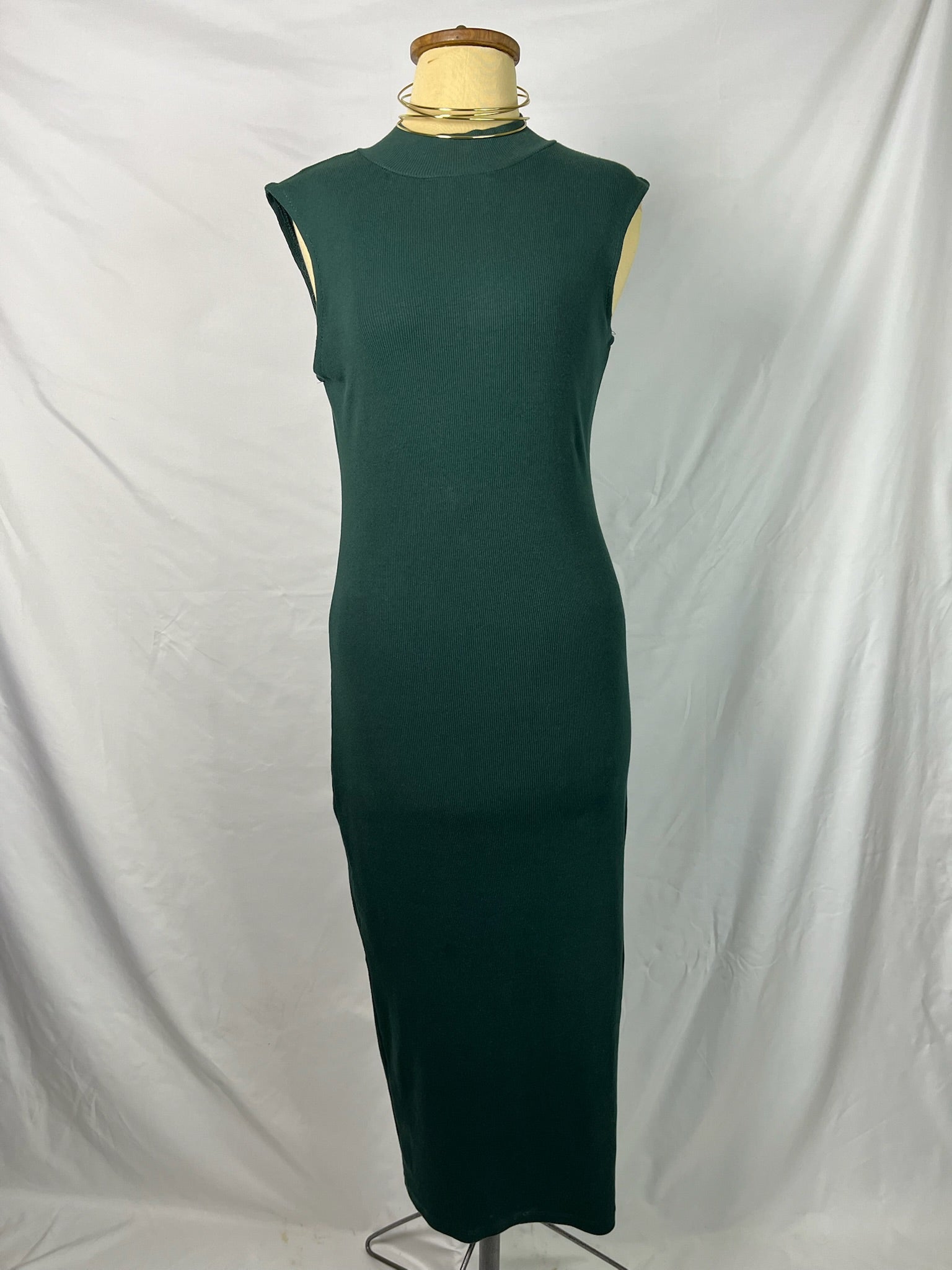Dark green stretchy ribbed fabric midi length, mock neckline basic dress.