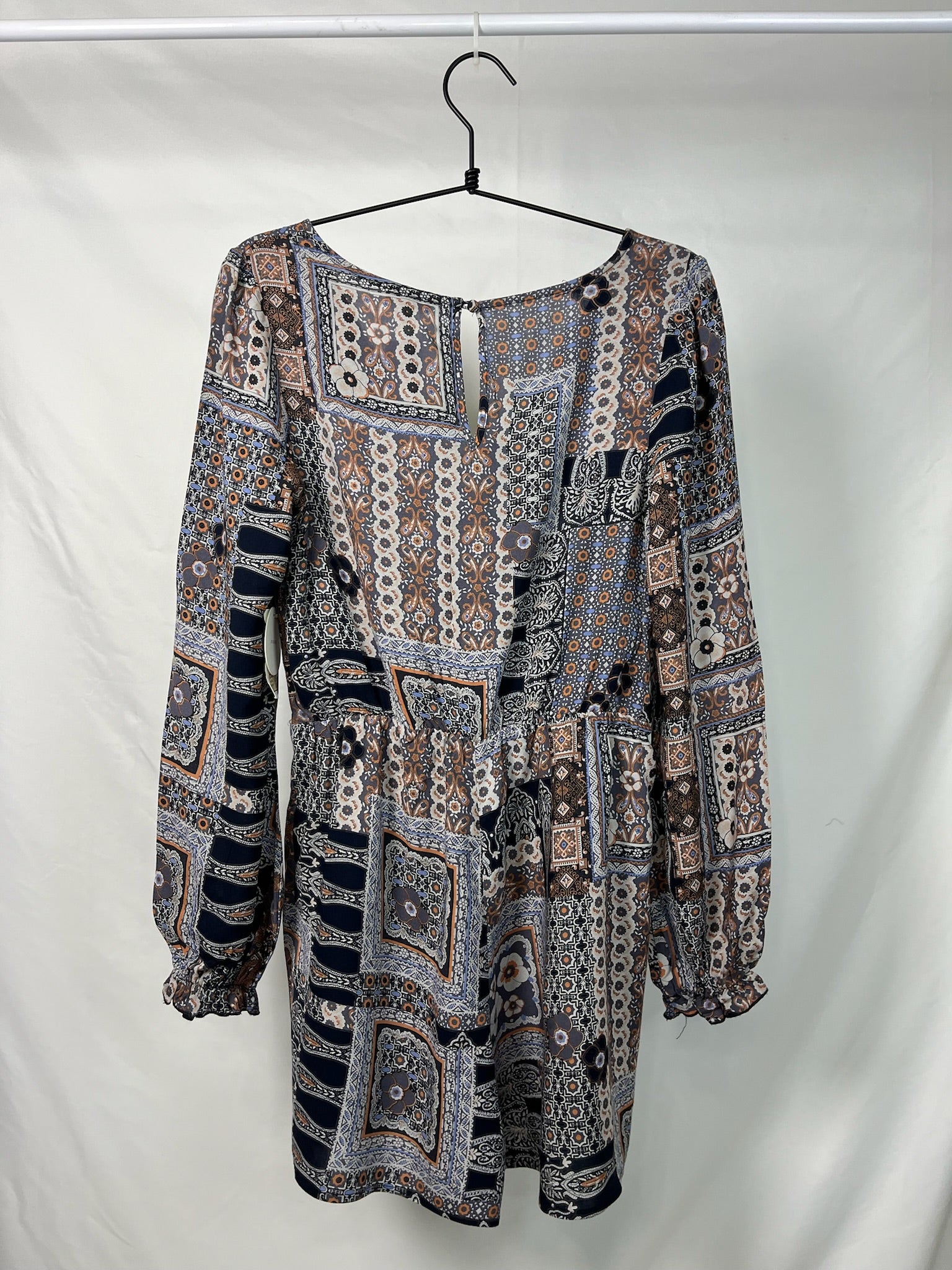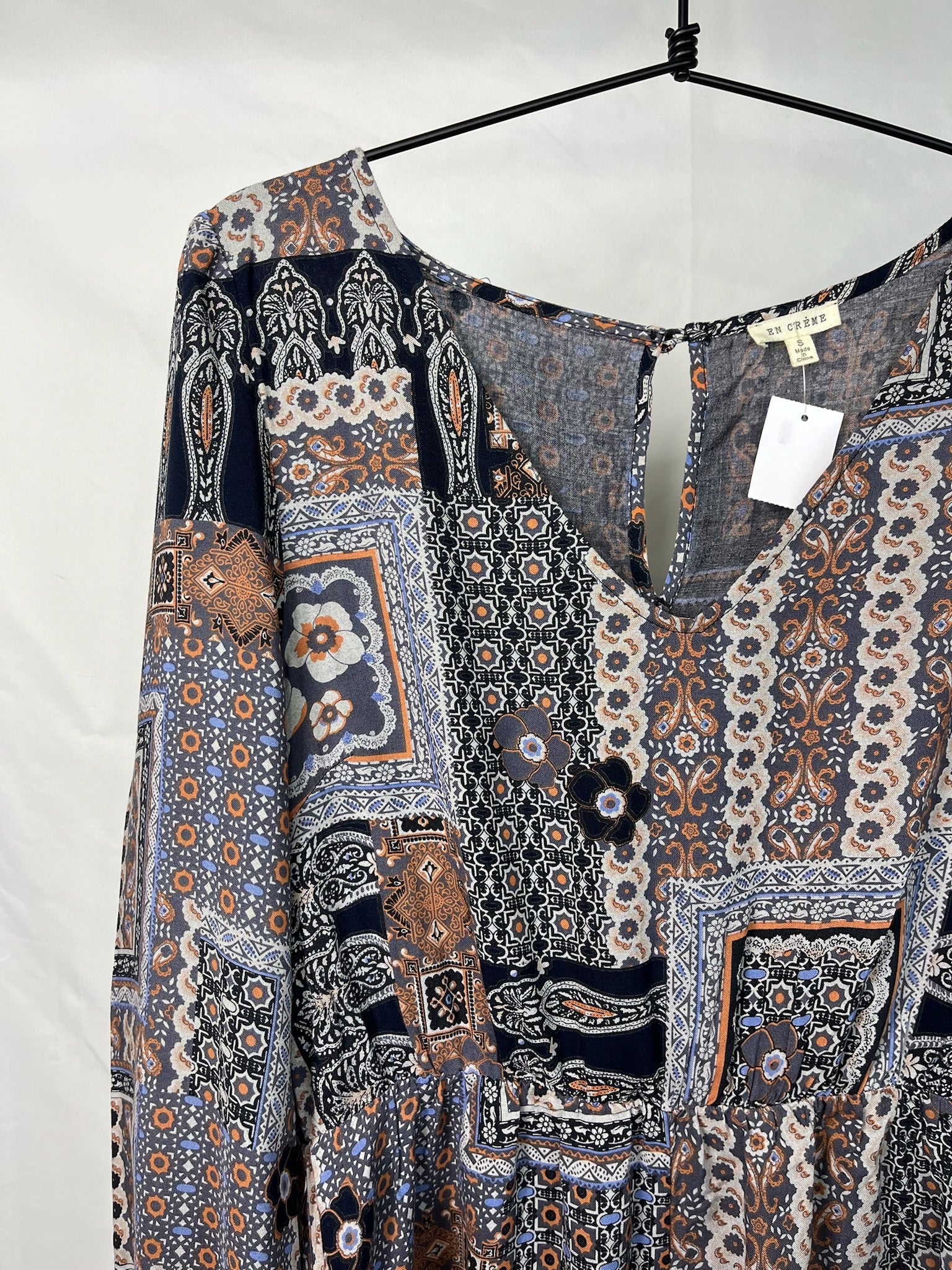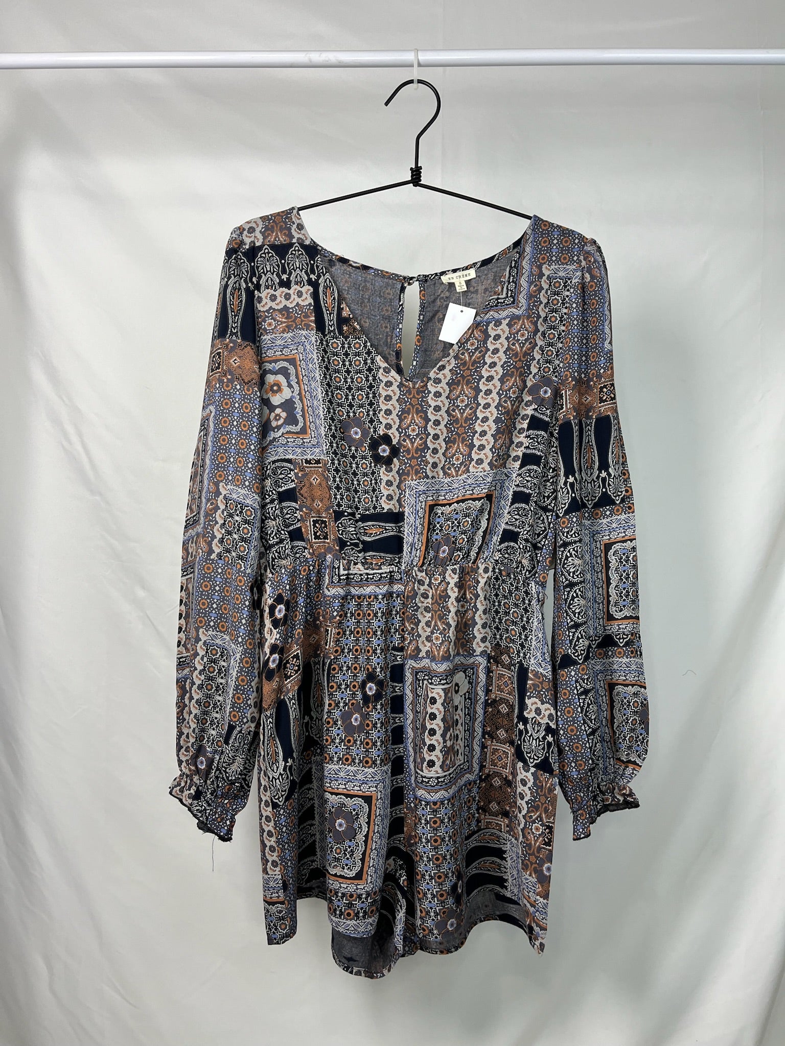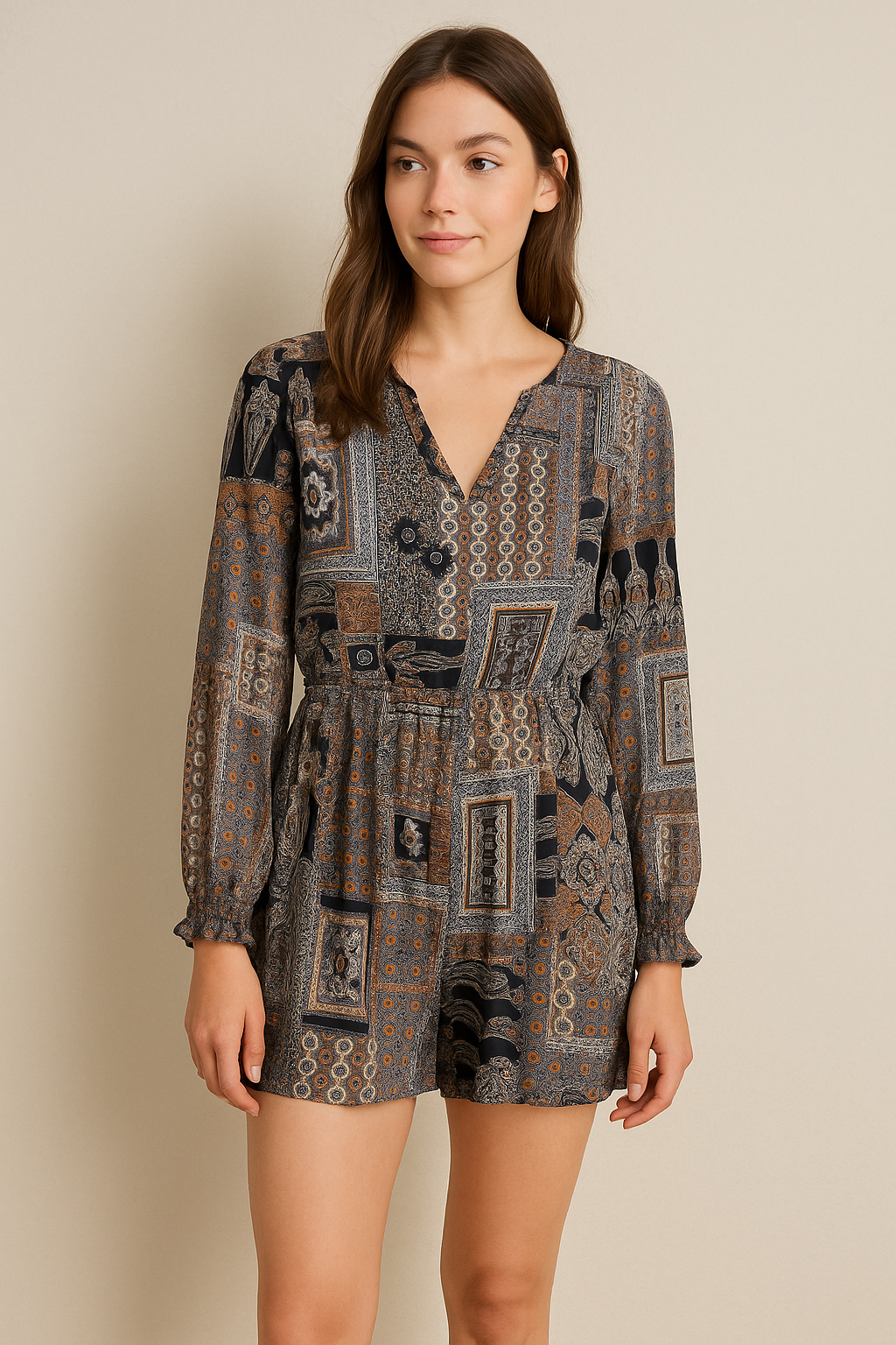 New patchwork effortless boho flowy long sleeves, V-neckline, cinched waist with button detailing romper.