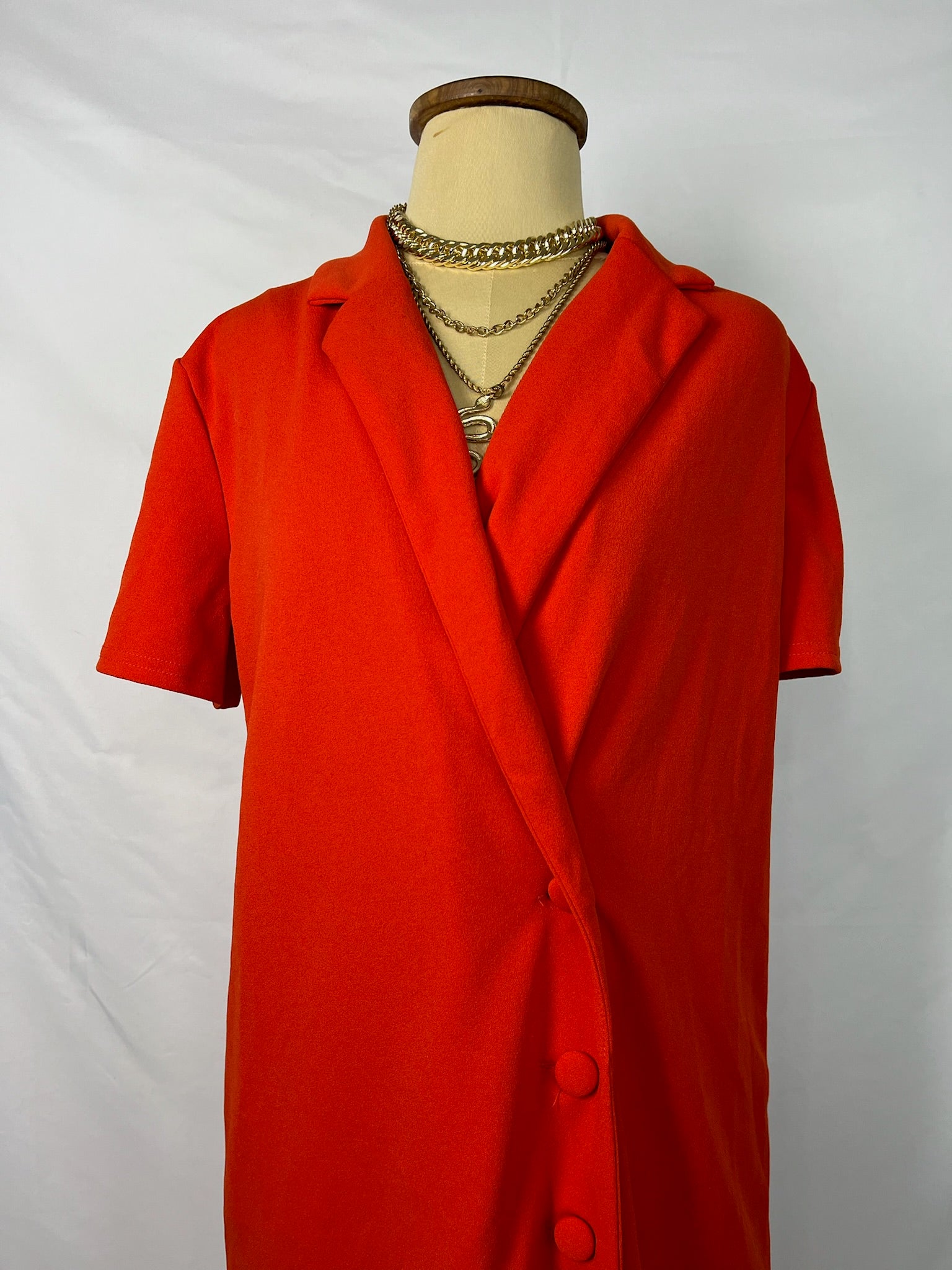Fiery red wrap-style features a structured lapel collar, short sleeves, and a button-down side detail that adds just the right amount of flair. Made from a soft, stretchy fabric for a comfy yet tailored silhouette.