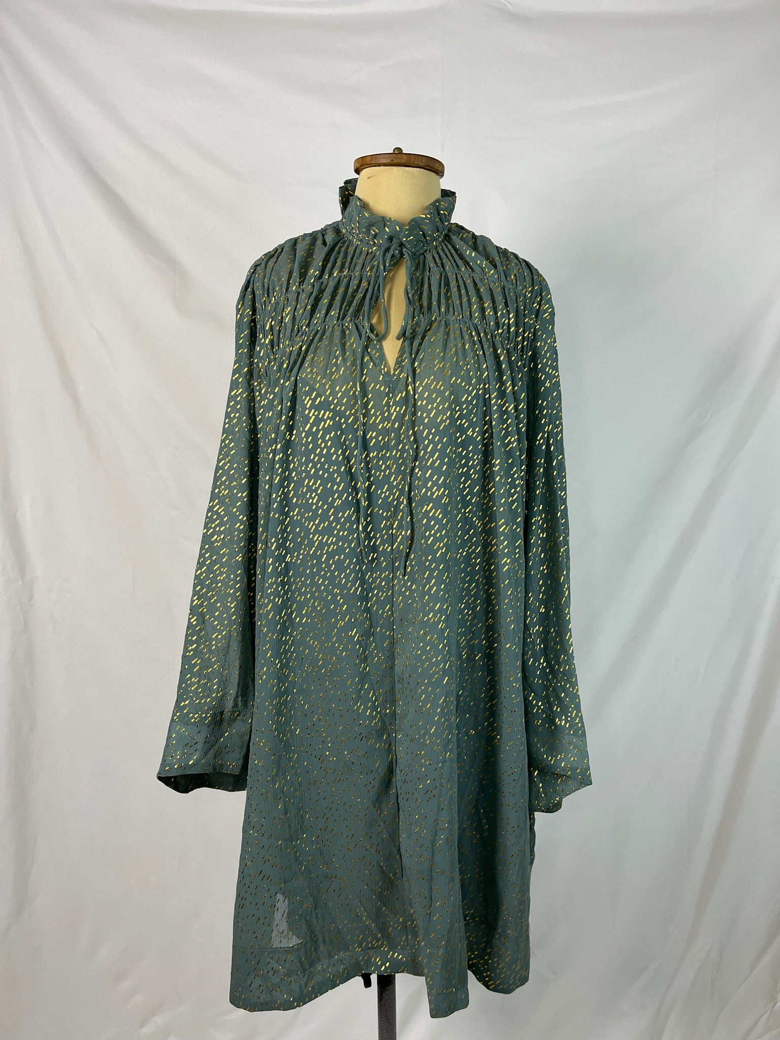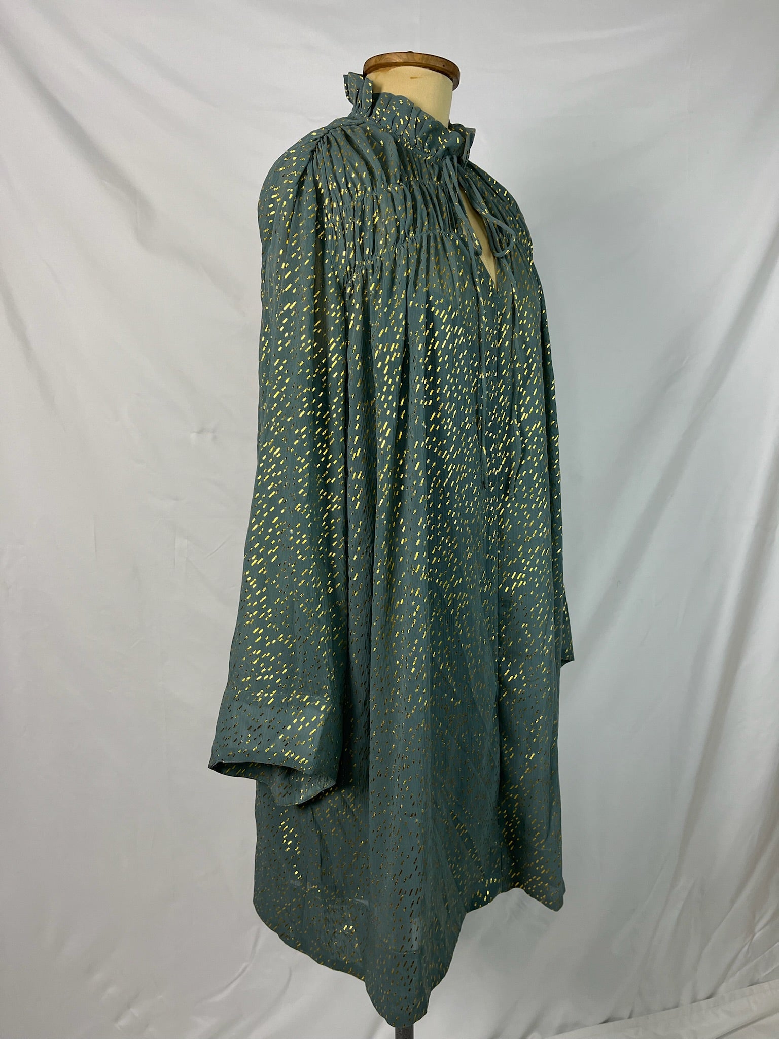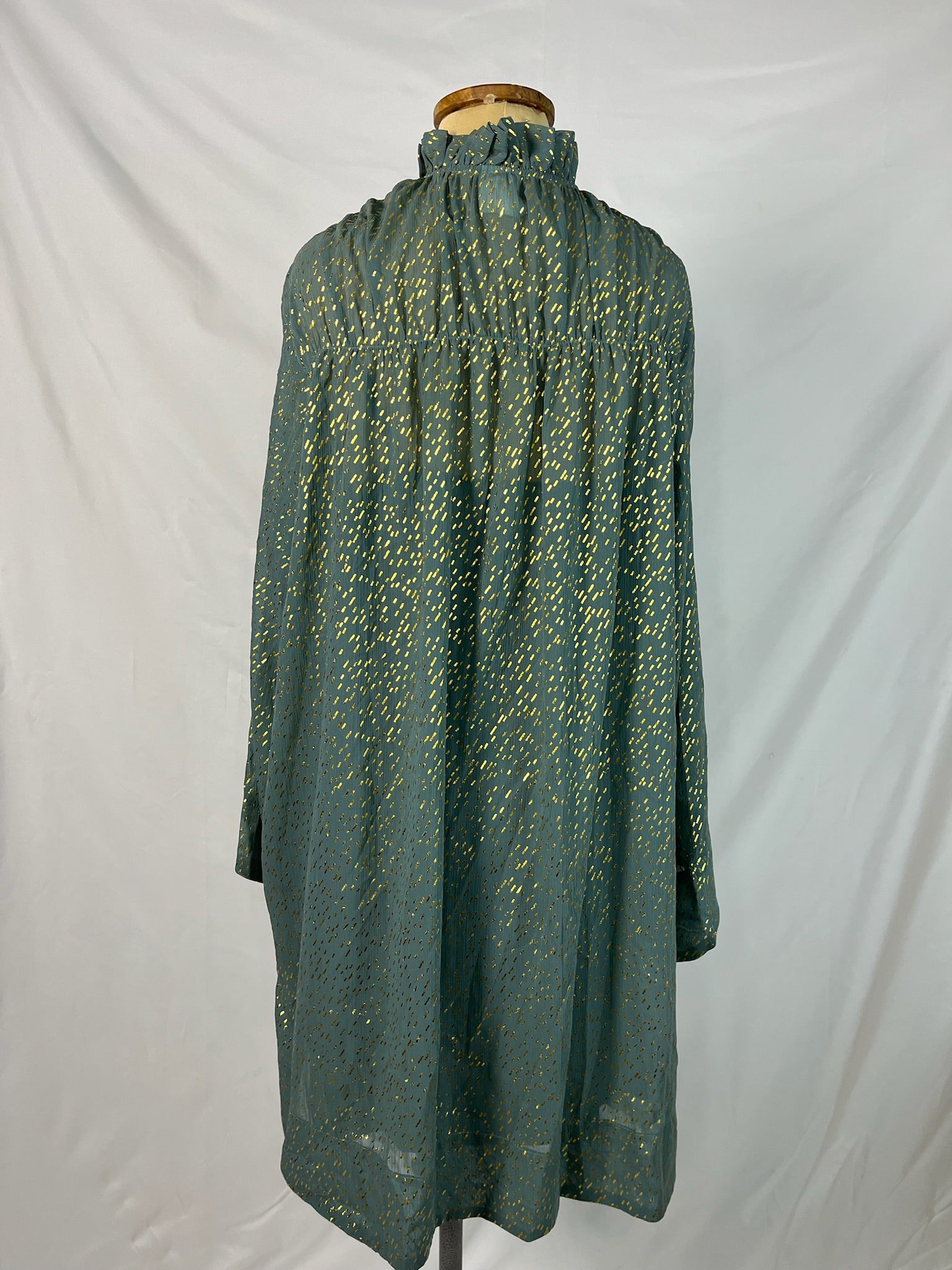 Emerald green gold speckled ruffle neckline, shimmery flowy long sleeves floaty dress.