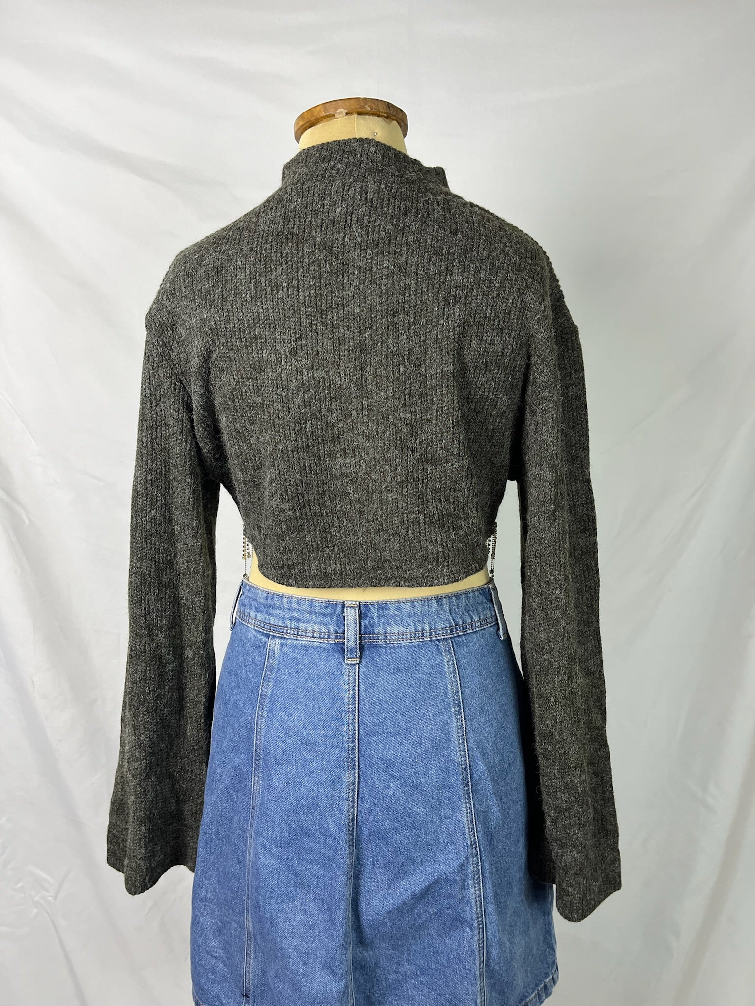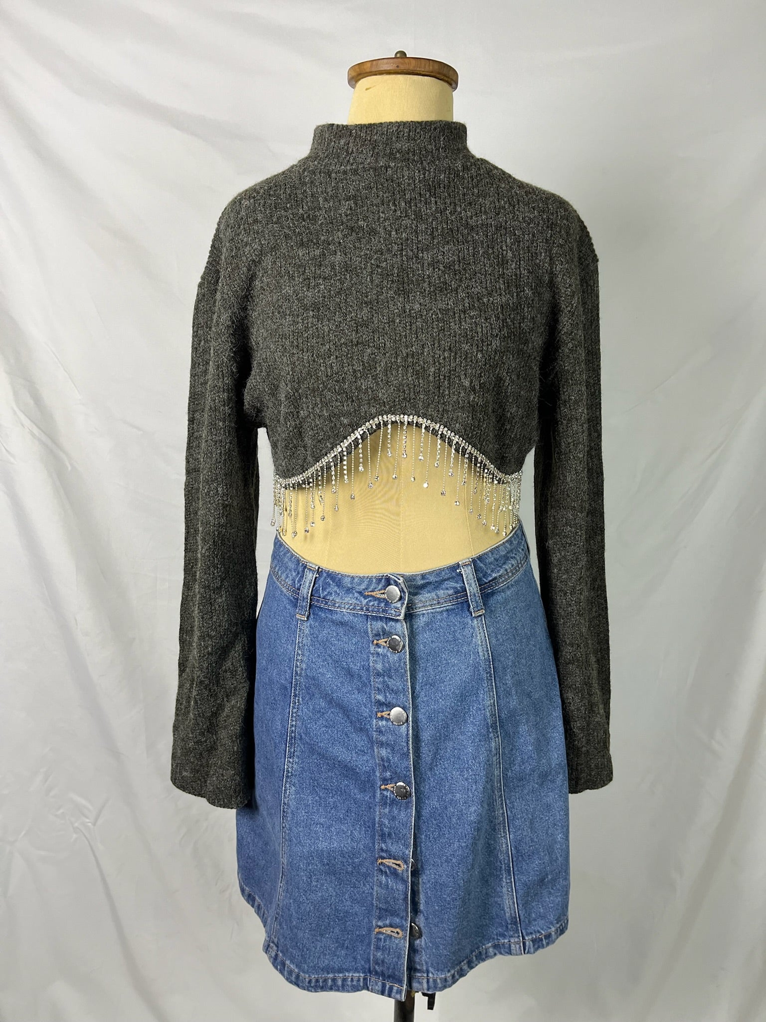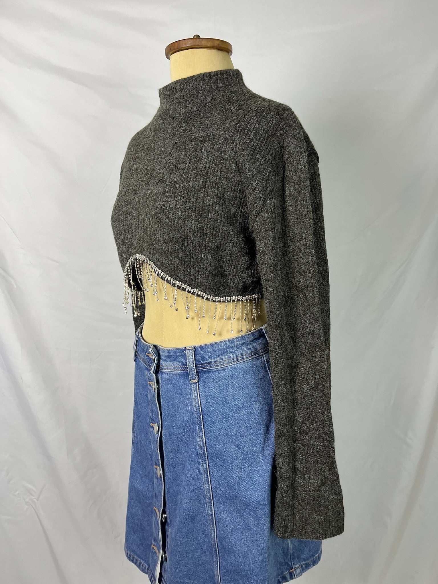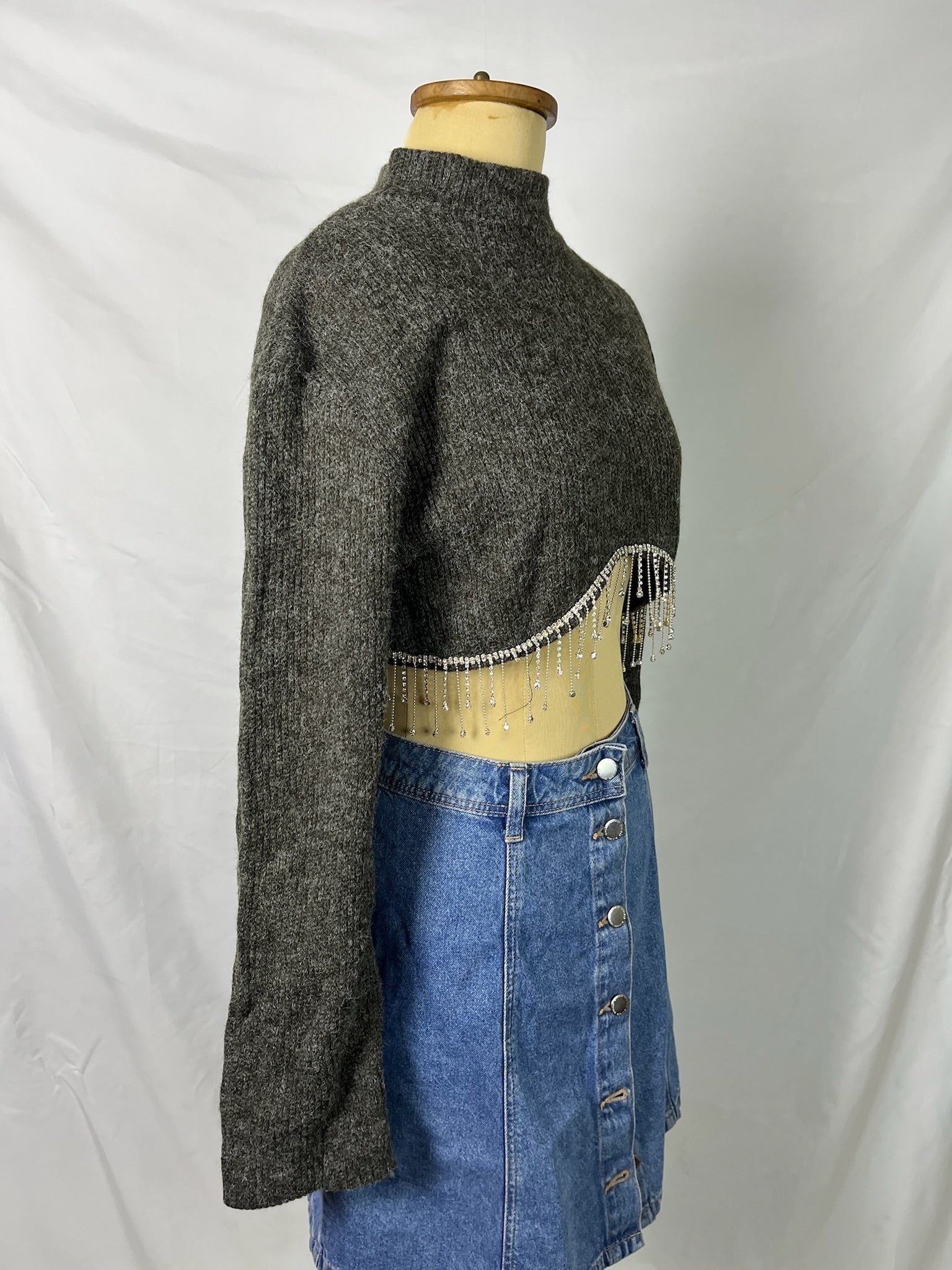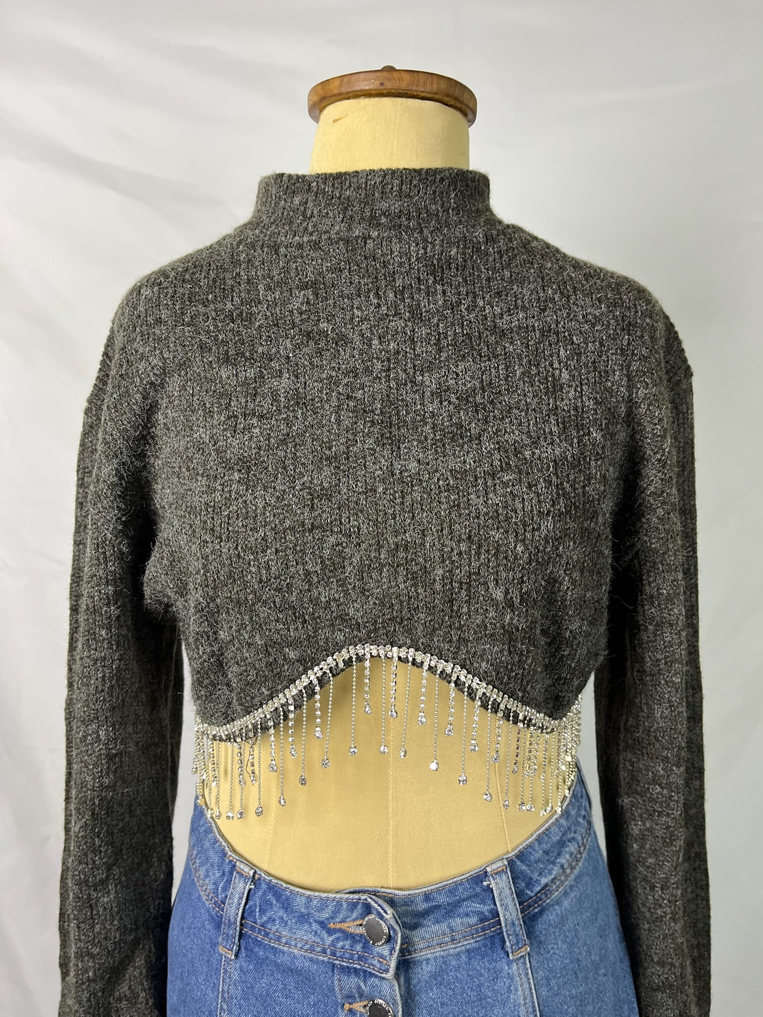 Dark gray long sleeves, high neckline, sparkly crystal fringes hem cropped top.