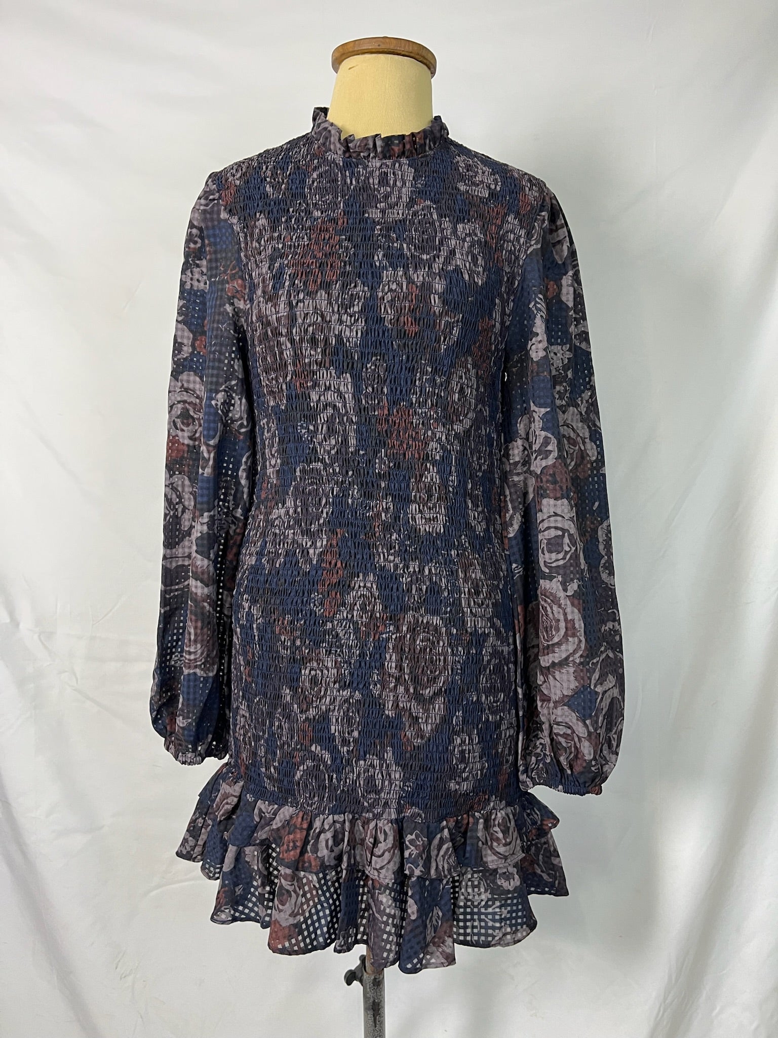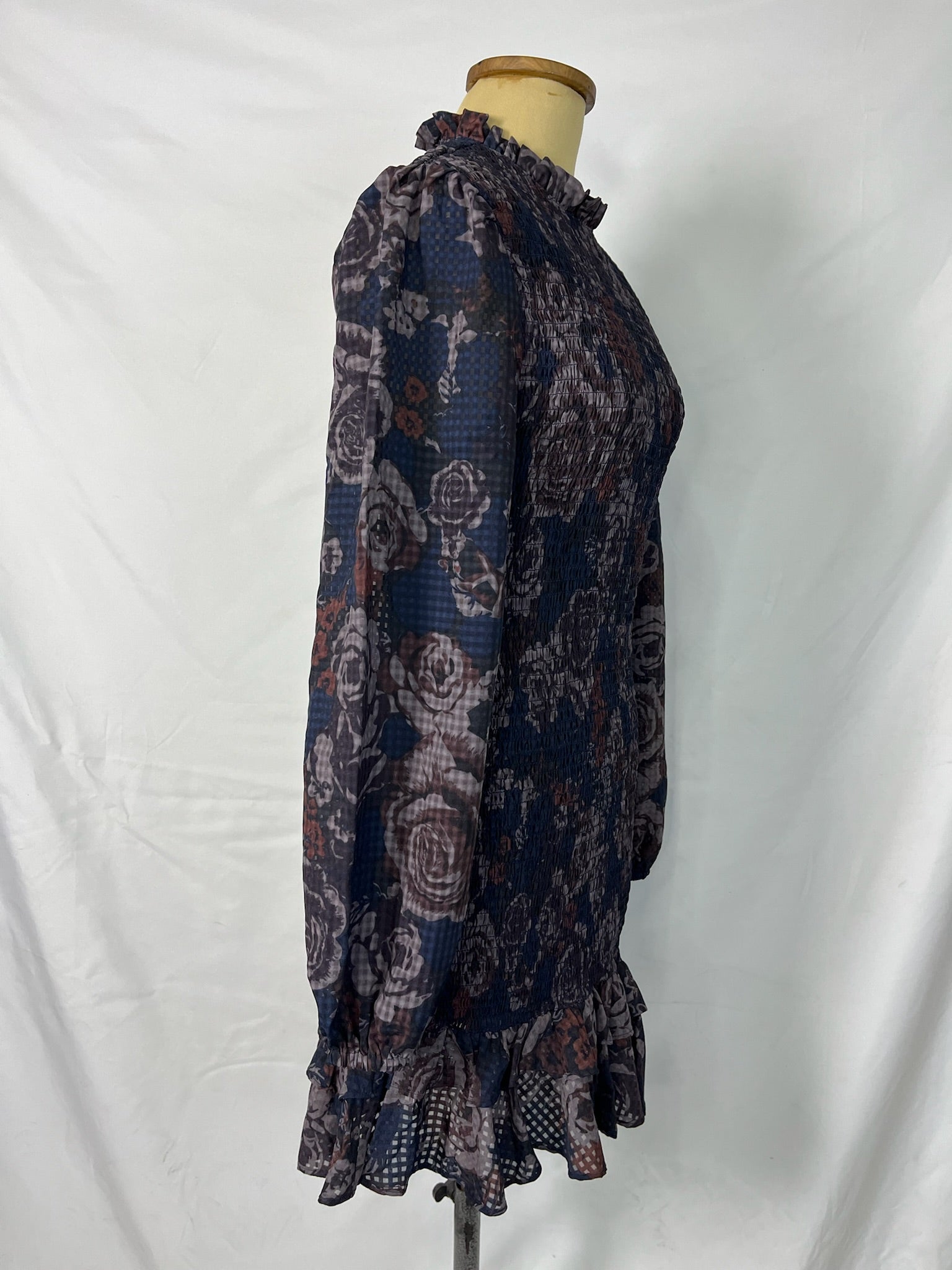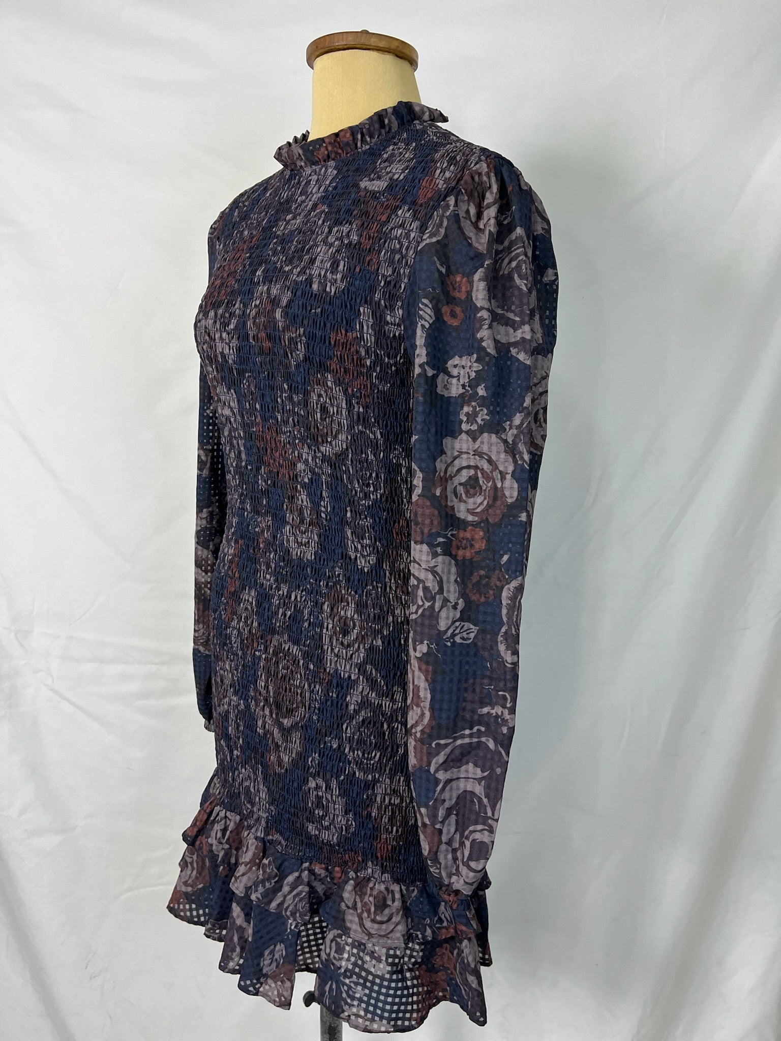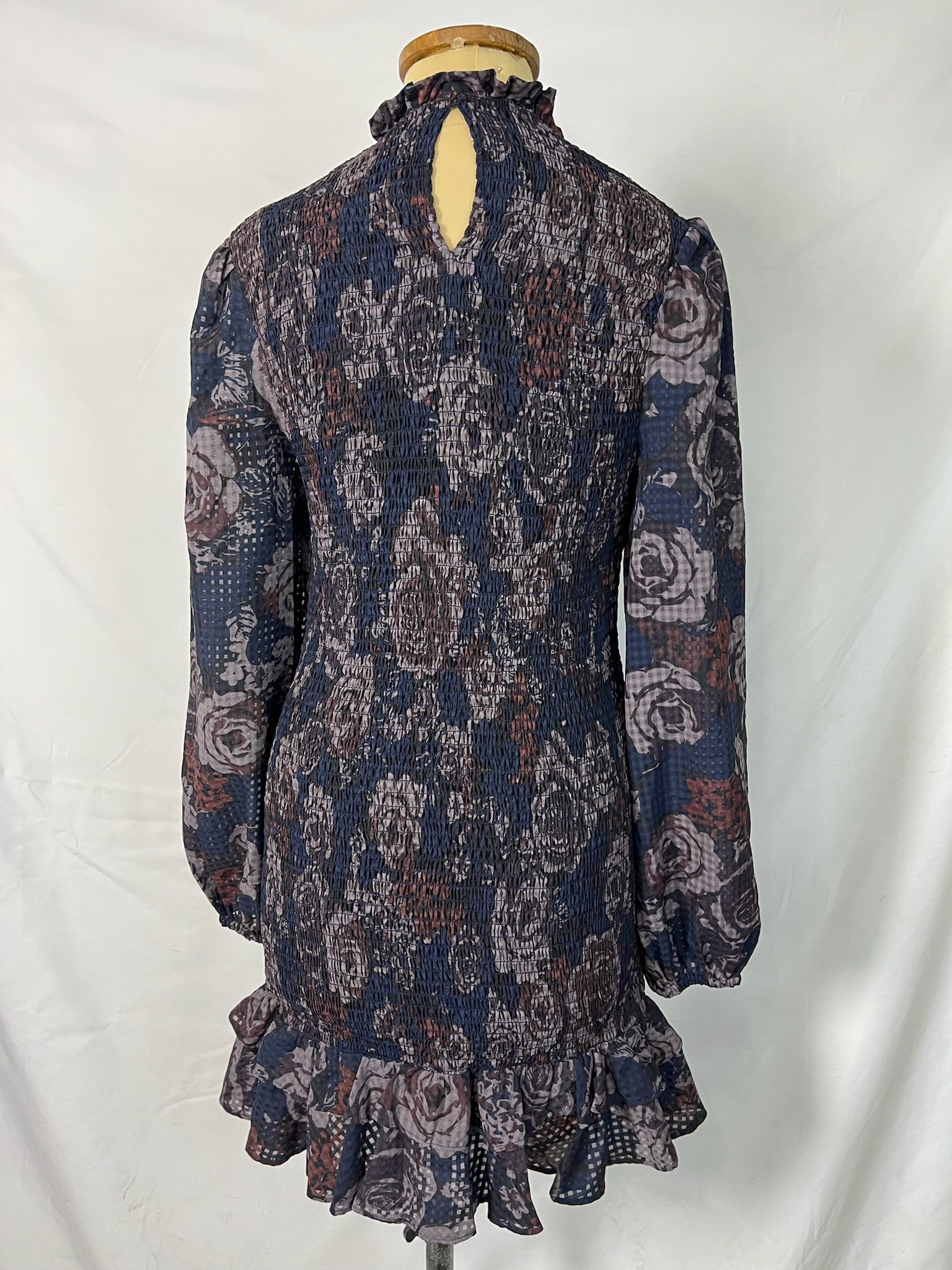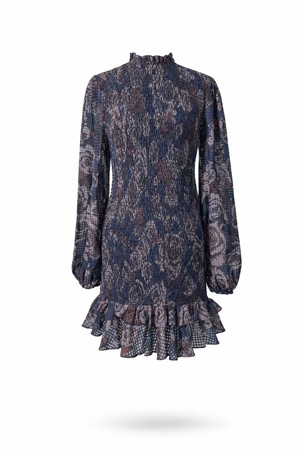 Navy blue floral print romantic long sleeves fully smocked bodice, stretchy fit, high ruffled neck, soft ruffled hem mini dress.