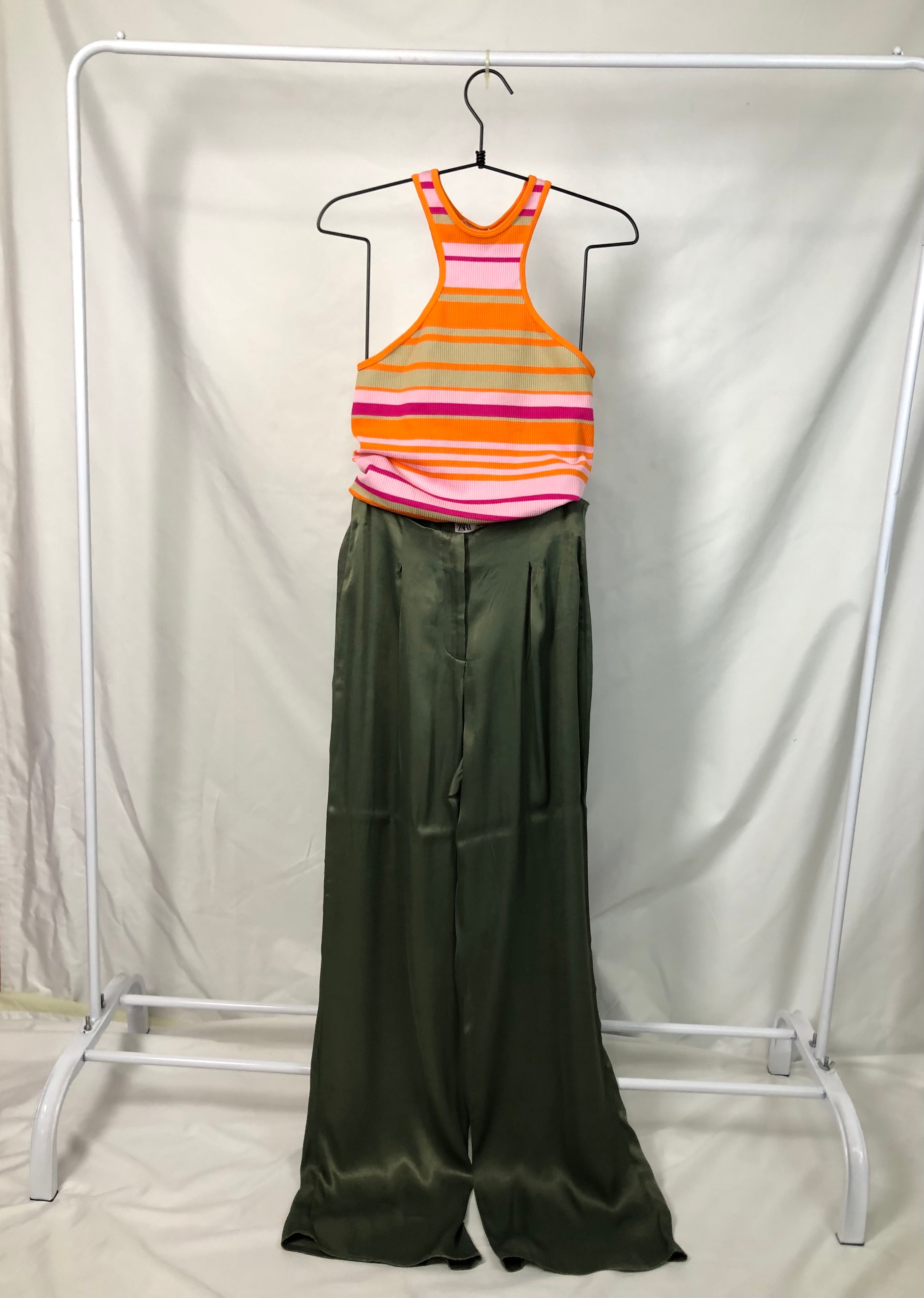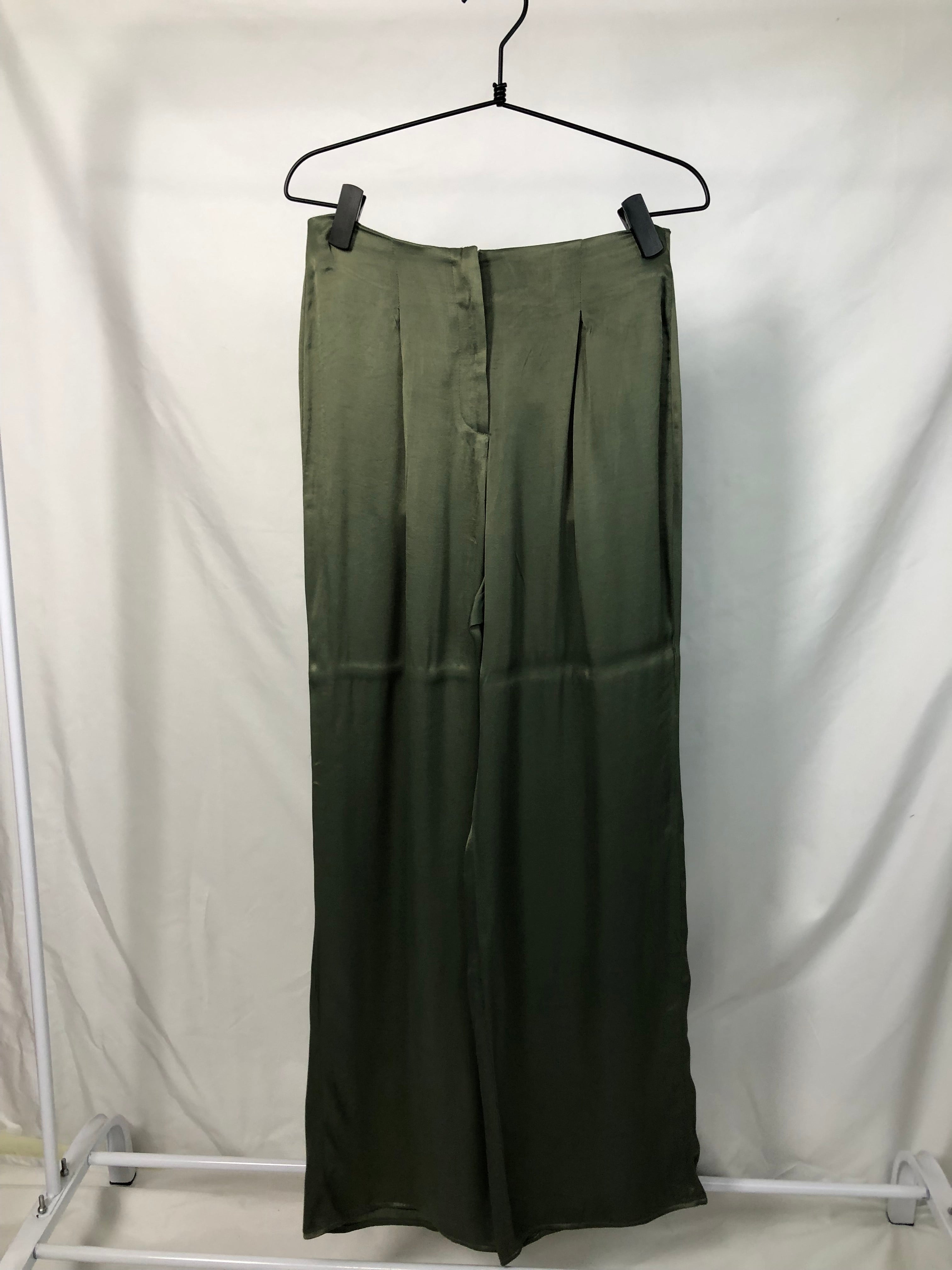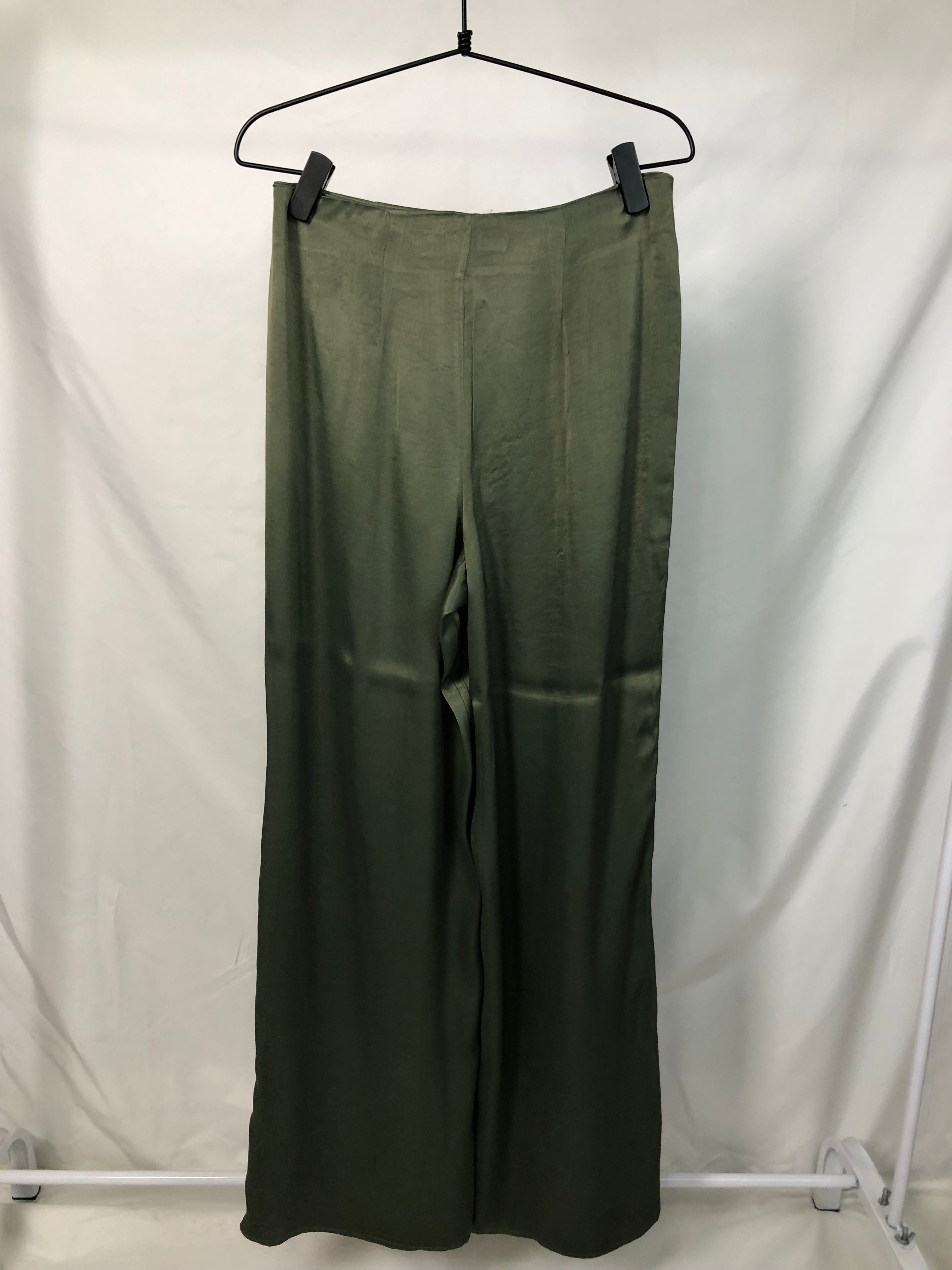 New olive green wide-leg cut satin classic pants with pockets.