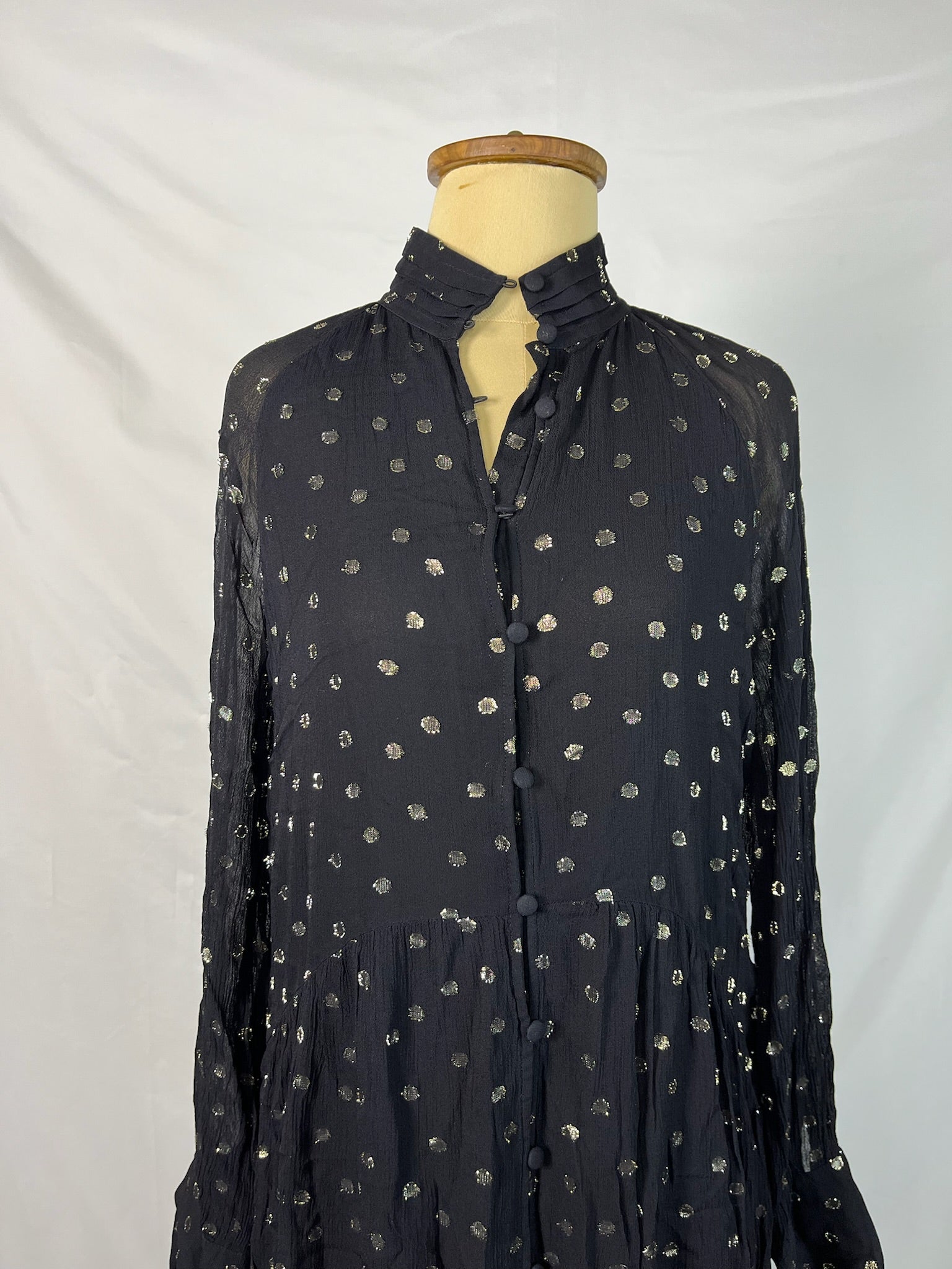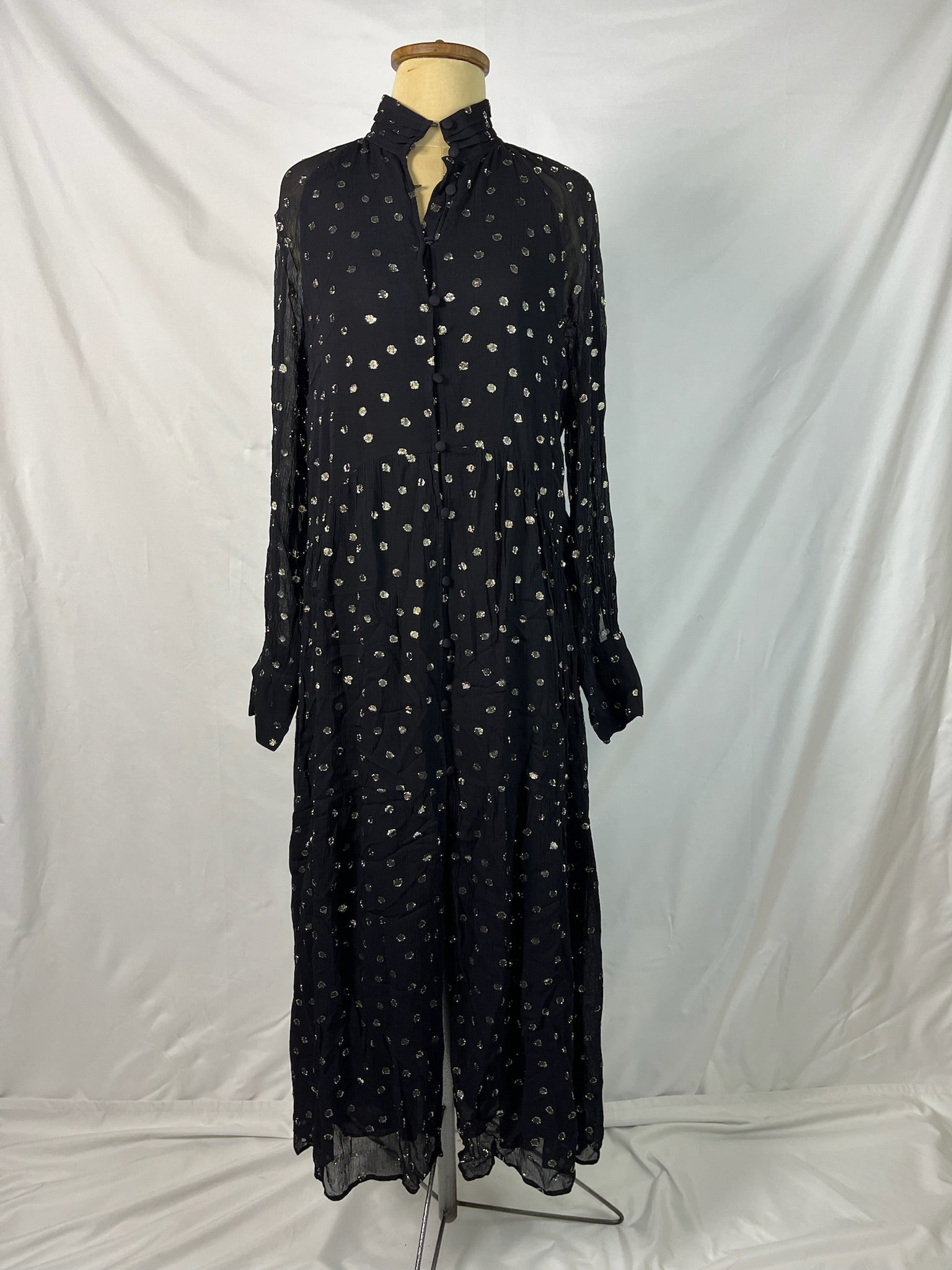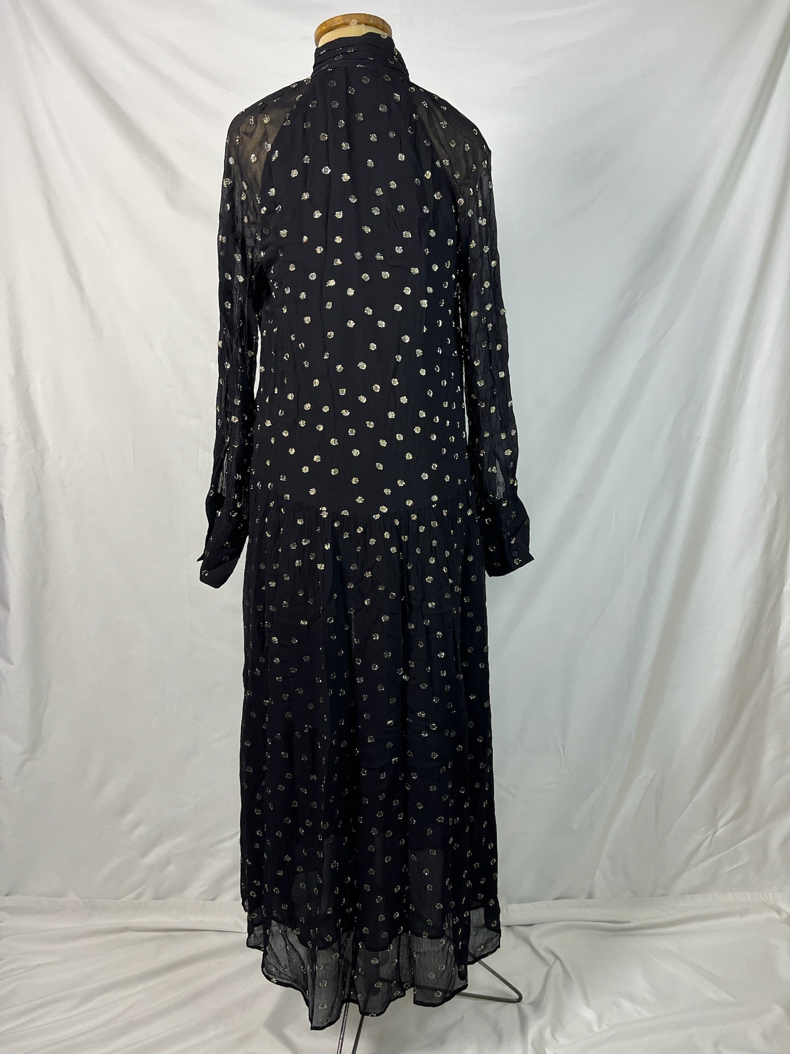 Black chiffon with shimmering gold detailing long sleeves, high ruffled neckline maxi dress.