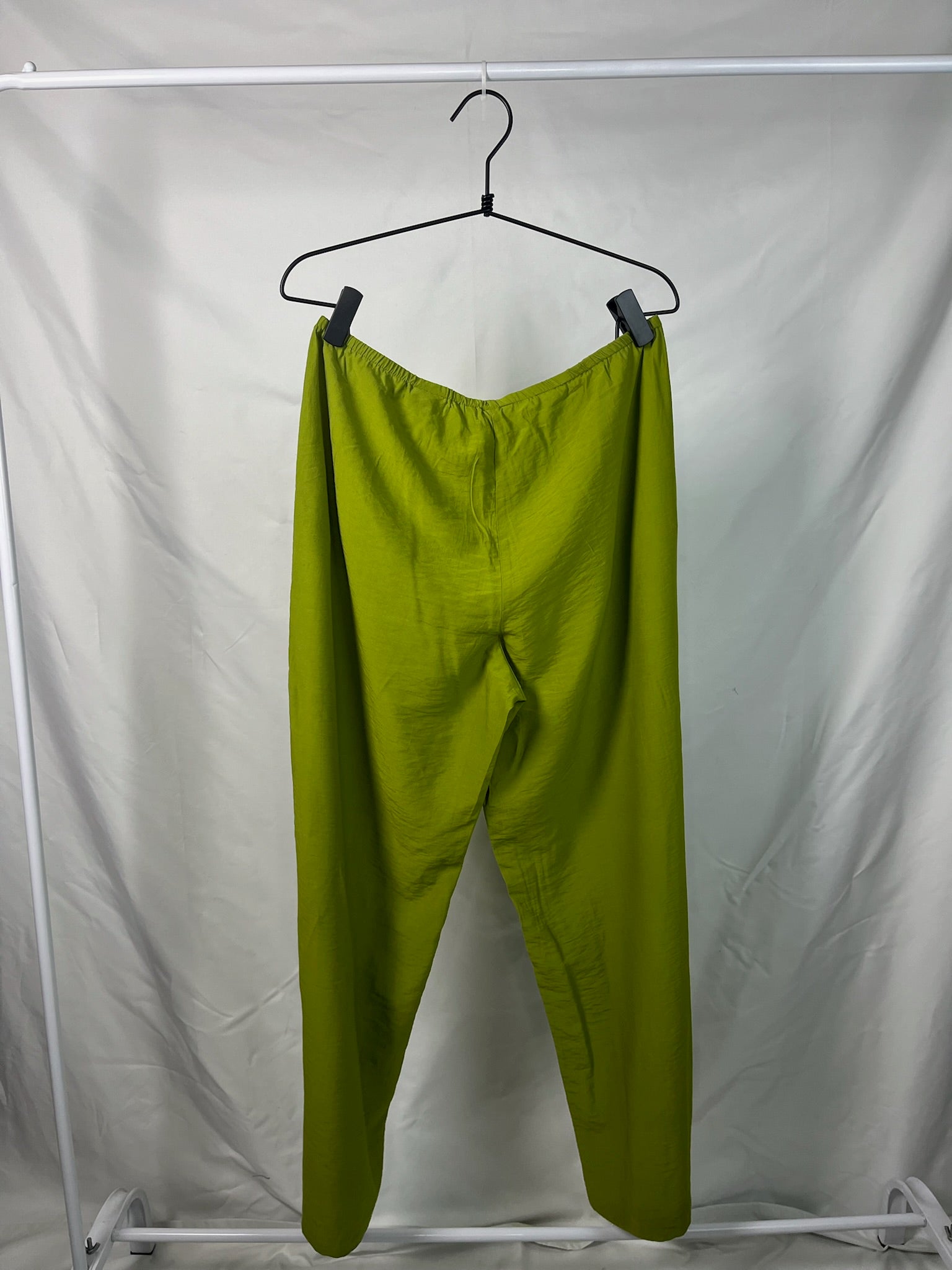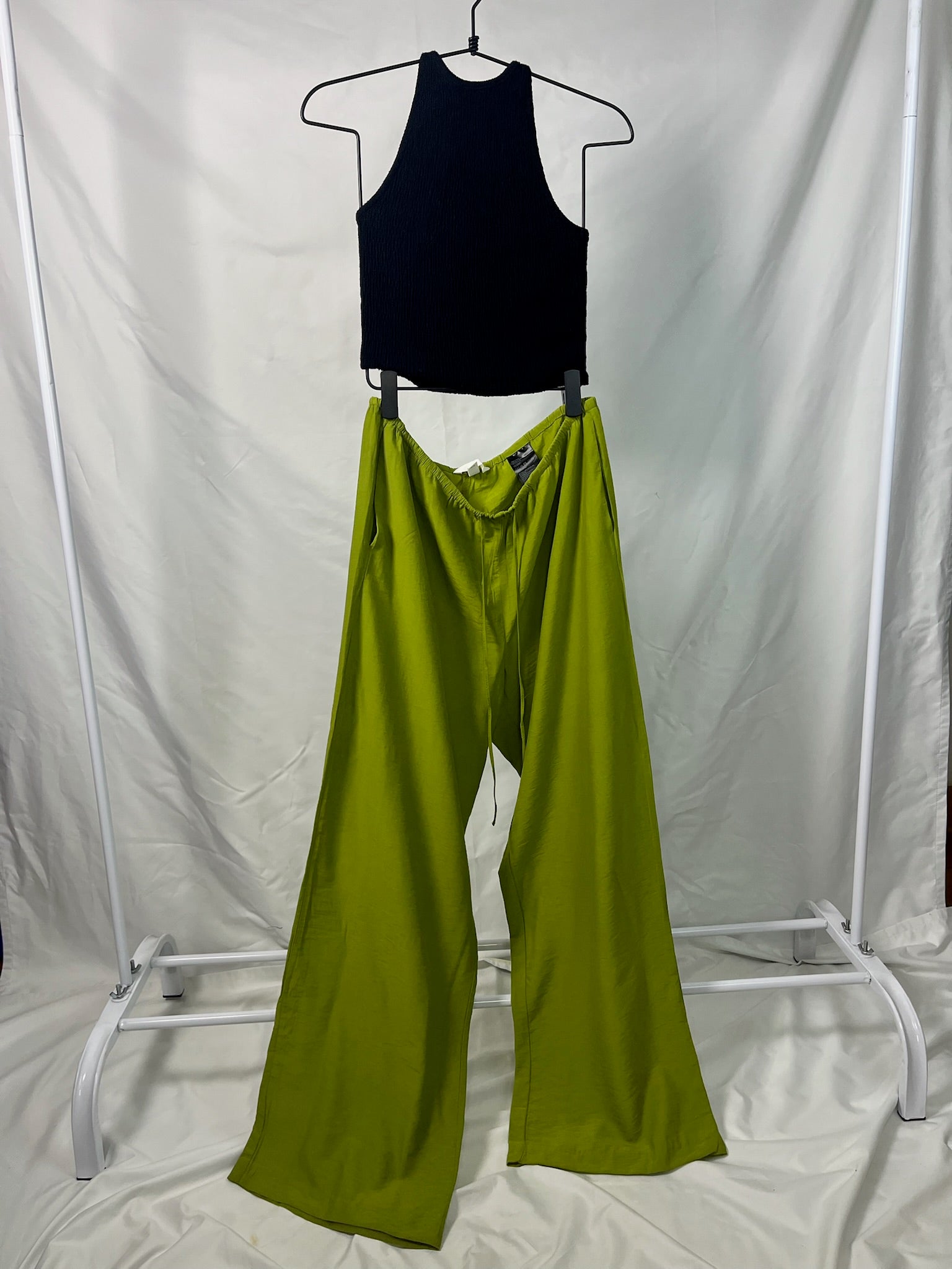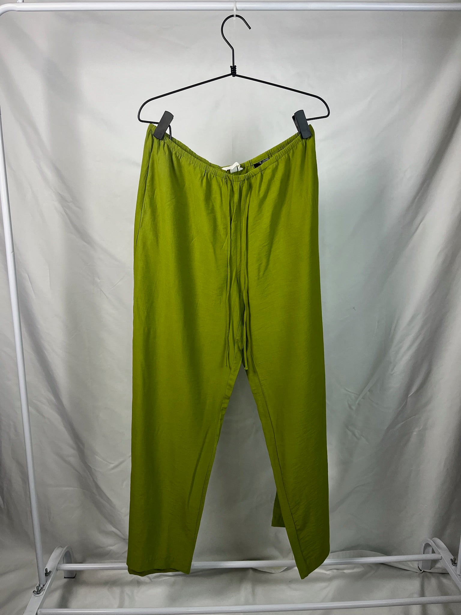 Olive green full length lightweight drawstring waist band wide-leg pants with pockets.