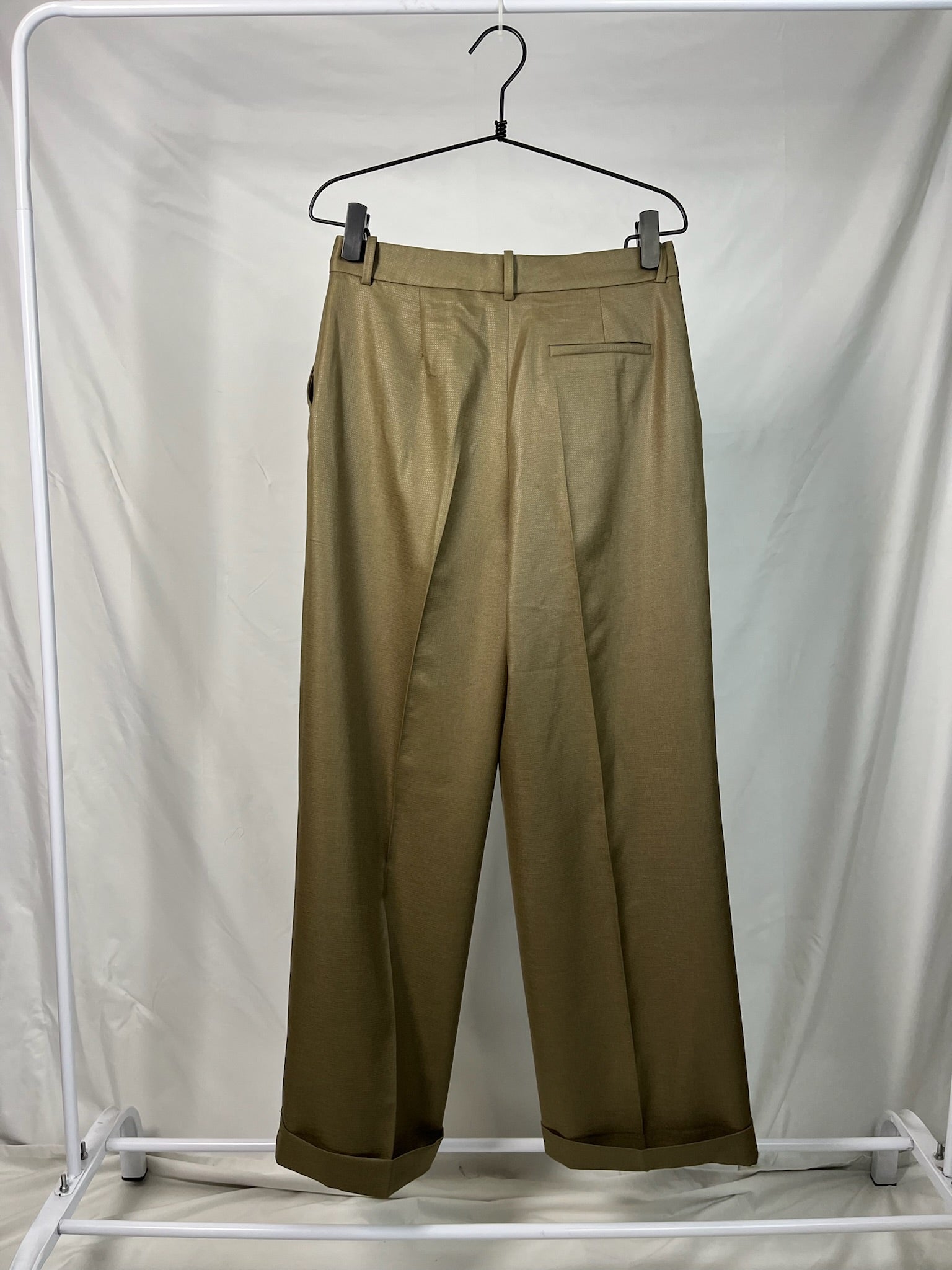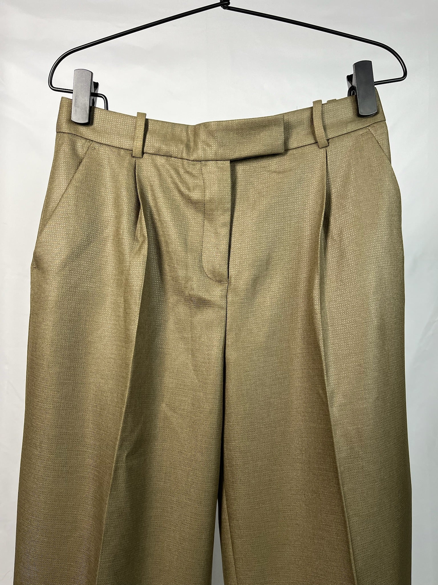 New olive green wide leg cut high waisted with sharp pleats classical pants.