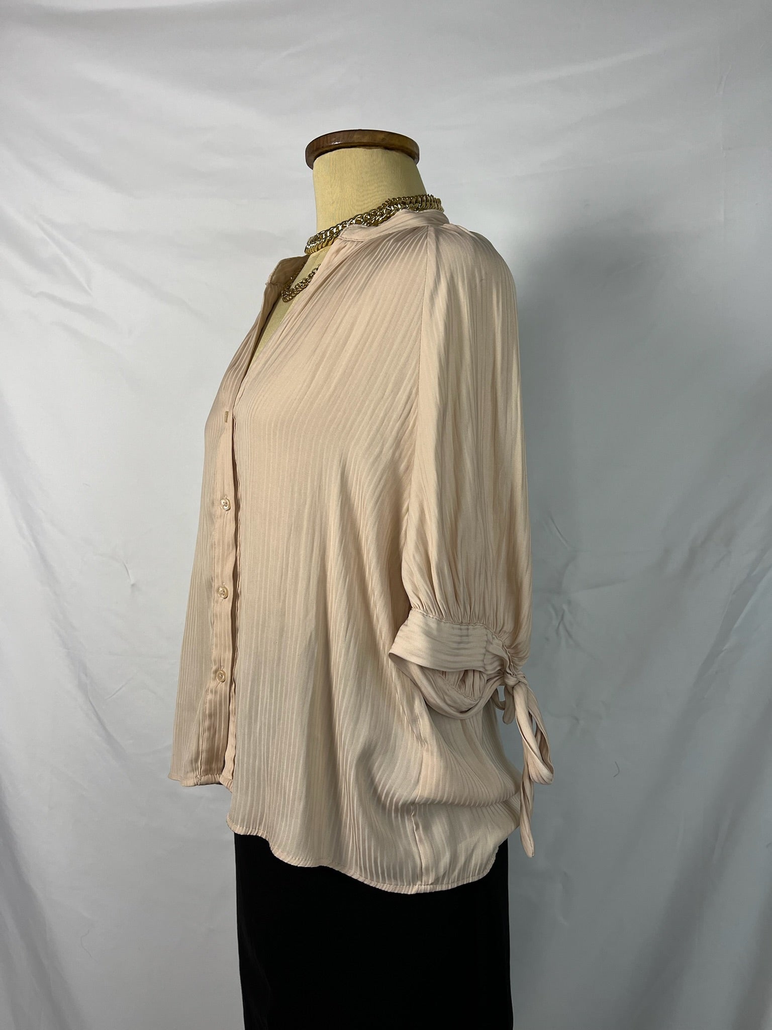 Nude lightweight with delicate vertical pleats tie sleeves button down collared blouse.