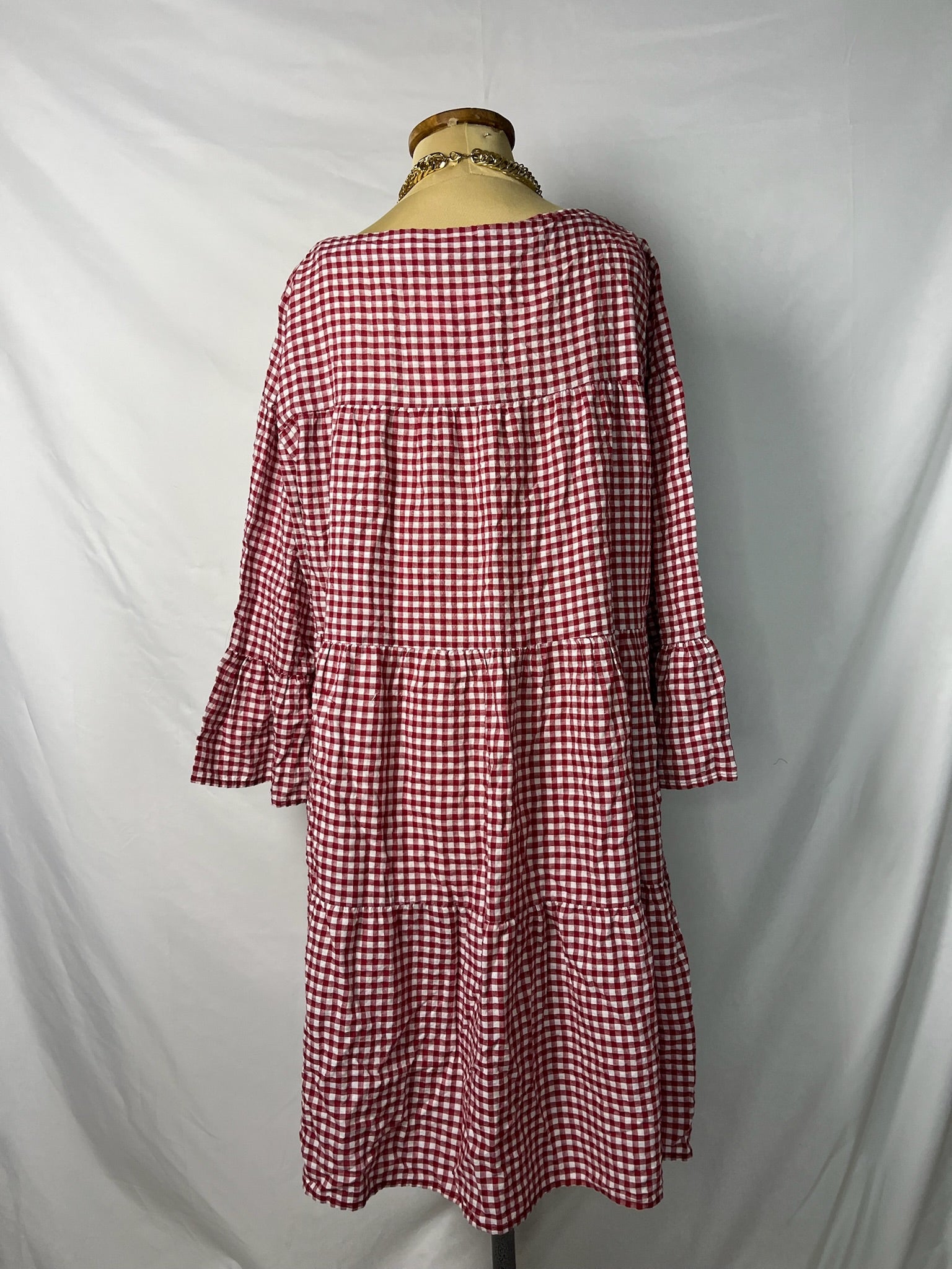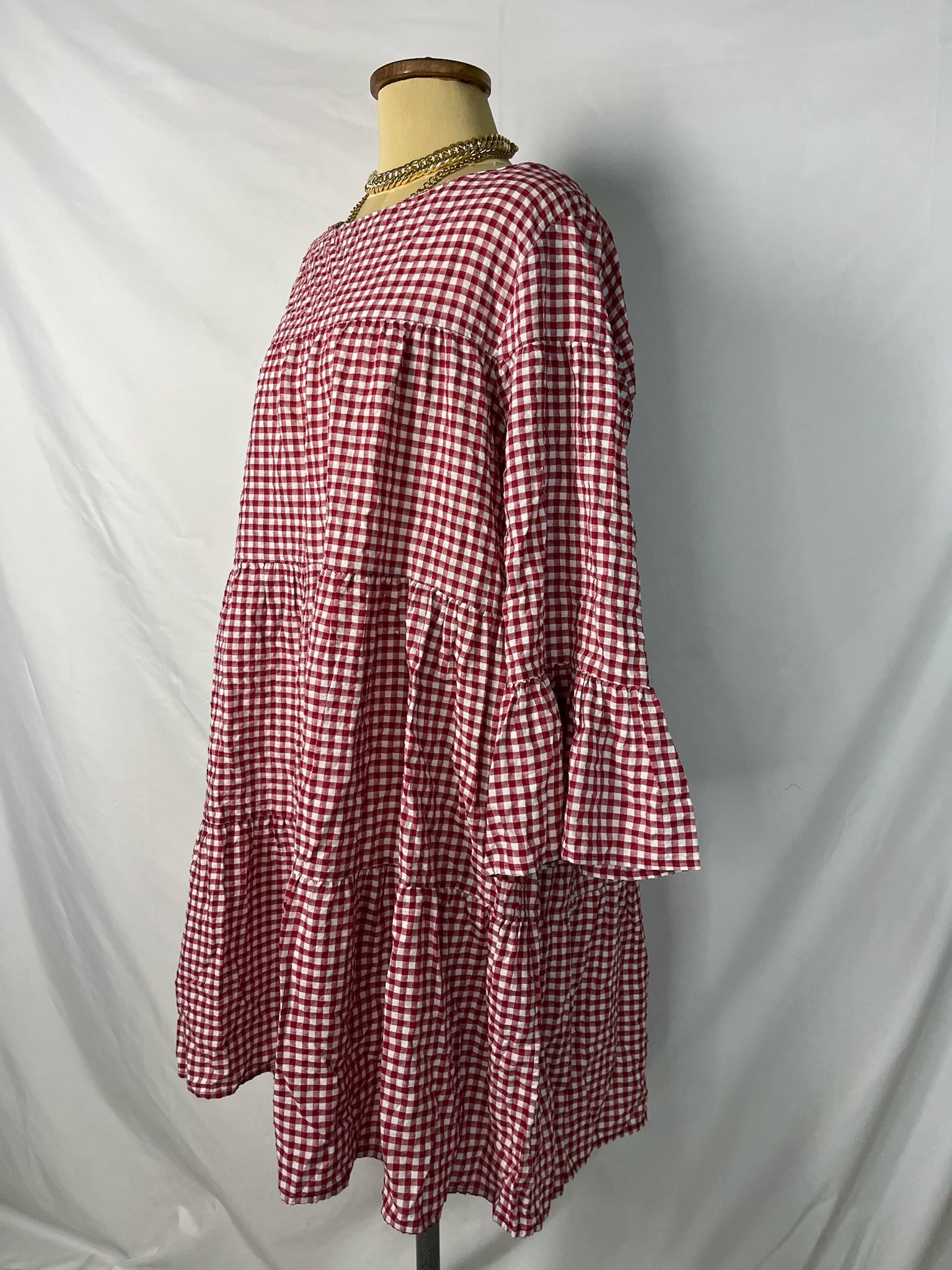 Red & white gingham picnic long sleeves round neckline tiered dress.