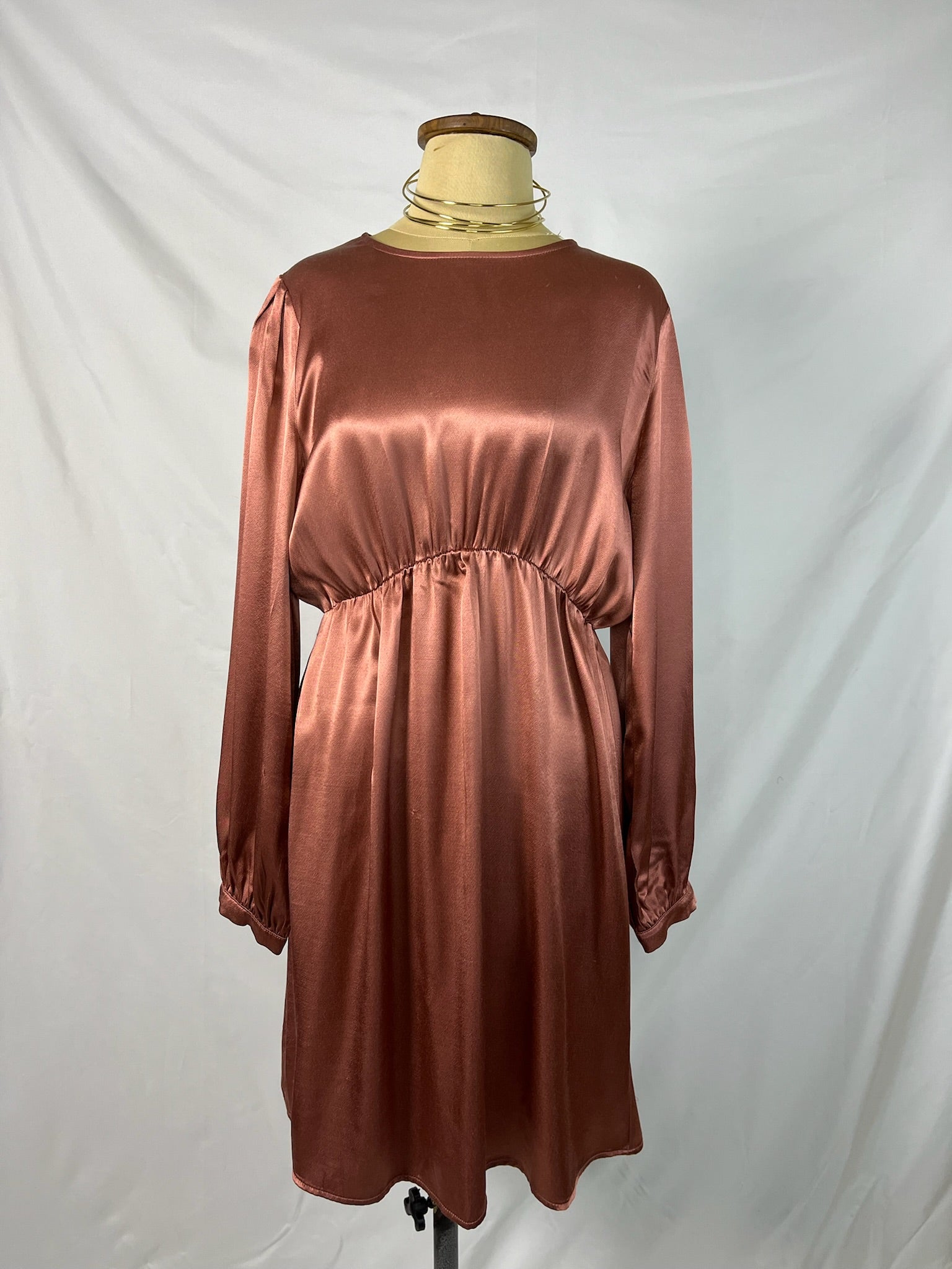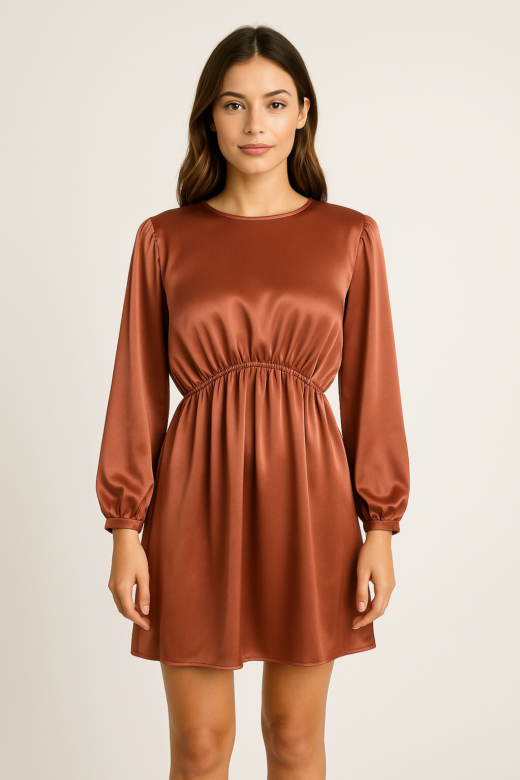 Rusty toned brown long sleeves gathered waistline with a round classic neckline satin dress.